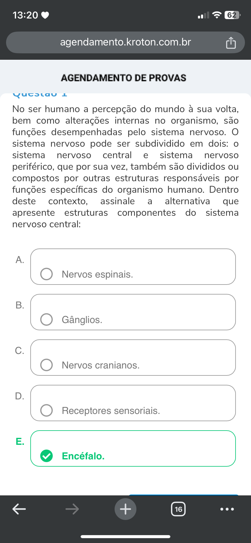 13:20 62 agendamento.kroton.com.br AGENDAMENTO DE PROVAS No ser humano a percepção do mundo à sua volta, bem como alterações internas no organismo, são funções desempenhadas pelo sistema nervoso. O sistema nervoso pode ser subdividido em dois: o sistema nervoso central e sistema nervoso periférico, que por sua vez, também são divididos ou compostos por outras estruturas responsáveis por funções específicas do organismo humano. Dentro deste contexto, assinale a alternativa que apresente estruturas componentes do sistema nervoso central: A. Nervos espinais. B. Gânglios. C. Nervos cranianos. D. Receptores sensoriais. E. Encéfalo. + 16