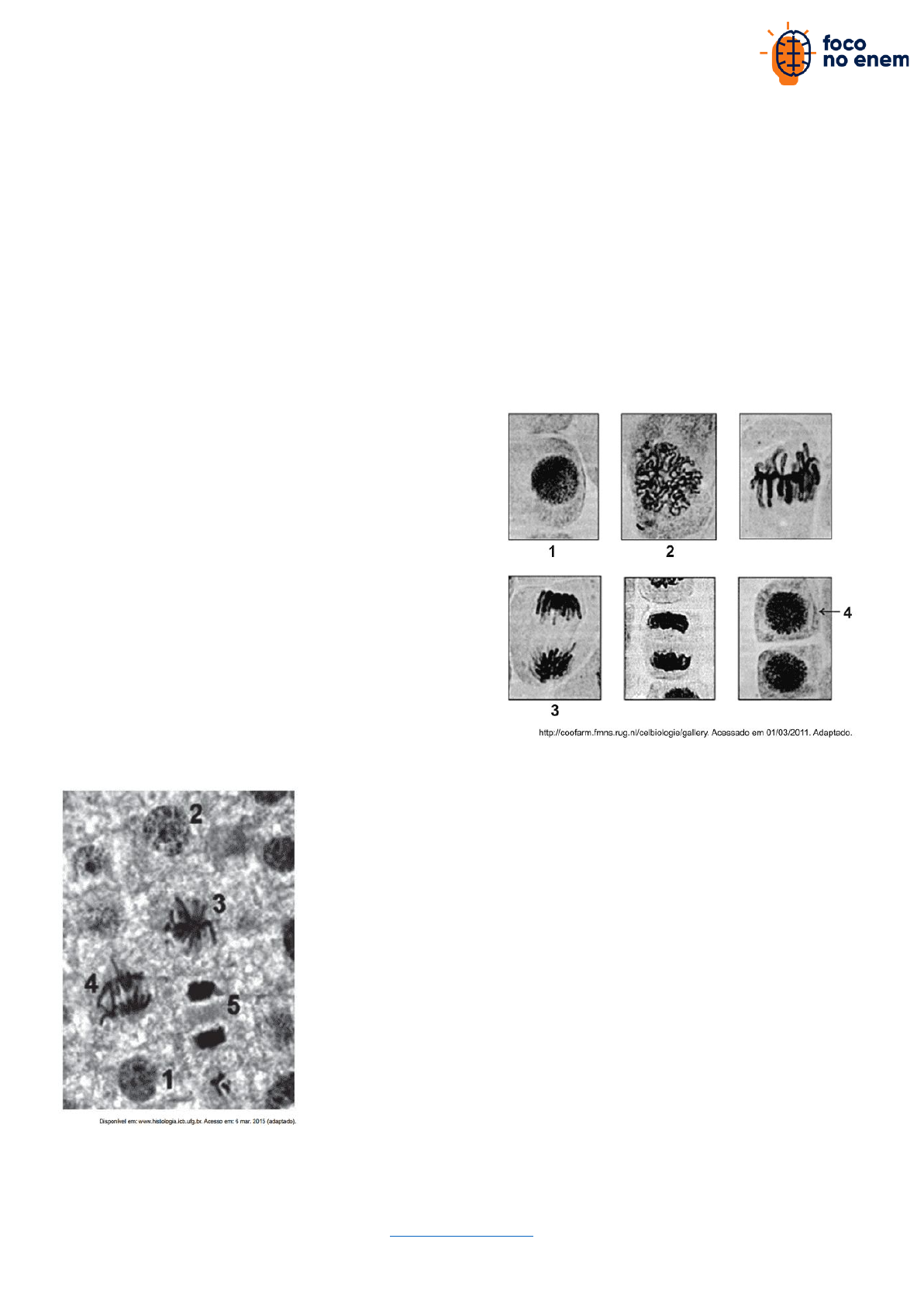 LISTA DE EXERCÍCIOS PARA O ENEM BIOLOGIA Citologia 01 - (ENEM) O Brasil possui um grande número de espécies distintas entre animais, vegetais e microrganismos envoltos em uma imensa complexidade e distribuídas em uma grande variedade de ecossistemas, SANDES, A R. R. BLASI, G.Biodiversidade e diversidade química e genética. Disponível em: http://novastecnologias.com.br. Acesso em 22 set 2015 (adaptado). O incremento da variabilidade ocorre em razão da permuta genética, a qual propicia a troca de segmentos entre cromátides não irmãs na meiose. Essa troca de segmentos é determinante na a.produção de indivíduos mais férteis. b.transmissão de novas características adquiridas. c.recombinação genética na formação dos gametas. d.ocorrência de mutações somáticas nos descendentes. e.variação do número de cromossomos característico da espécie. 02 - (ENEM) Para estudar os cromossomos, é preciso observá-los no momento em que se encontram no ponto máximo de sua condensação. A imagem corresponde ao tecido da raiz de cebola, visto ao microscópio, e cada número marca uma das diferentes etapas do ciclo celular. Qual número corresponde à melhor etapa para que esse estudo seja possível? a.1 b.2 c.3 d.4 e.5 03 - (FUVEST) A sequência de fotografias abaixo mostra uma célula em interfase e outras em etapas da mitose, até a formação de novas células. Considerando que o conjunto haploide de cromossomos corresponde à quantidade N de DNA, a quantidade de DNA das células indicadas pelos números 1, 2, 3 e 4 é, respectivamente, a.N, 2N, 2N e N. b.N, 2N, N e N/2. c.2N, 4N, 2N e N. d.2N, 4N, 4N e 2N. e.2N, 4N, 2N e 2N. 04 - (FUVEST) Células de embrião de drosófila (2n=8), que estavam em divisão, foram tratadas com uma substância que inibe a formação do fuso, impedindo que a divisão celular prossiga. Após esse tratamento, quantos cromossomos e quantas cromátides, respectivamente, cada célula terá? WWW. FOCONOENEM.COM INSTAGRAM: @OFOCONOENEM LISTA DE EXERCÍCIOS PARA O ENEM a.4 e 4. b.4 e 8. c.8 e 8. d.8 e 16. e.16 e 16. 05 - (ENEM) O DNA (ácido desoxirribonucleico), material genético de seres vivos, é uma molécula de fita dupla, que pode ser extraída de forma caseira a partir de frutas, como morango ou banana amassados, com uso de detergente, de sal de cozinha, de álcool comercial e de uma peneira ou de um coador de papel. O papel do detergente nessa extração de DNA é a.aglomerar o DNA em solução para que se torne visível. b.promover lise mecânica do tecido para obtenção do DNA. c.emulsificar a mistura para promover a precipitação do DNA. d.promover atividades enzimáticas para acelerar a extração do DNA. e.romper as membranas celulares para liberação do DNA em solução. 06 - (ENEM) Alimentos como carnes, quando guardados de maneira inadequada, deterioram-se rapidamente devido à ação de bactérias e fungos. Esses organismos se instalam e se multiplicam rapidamente por encontrarem aí condições favoráveis de temperatura, umidade e nutrição. Para preservar tais alimentos é necessário controlar a presença desses microrganismos. Uma técnica antiga e ainda bastante difundida para preservação desse tipo de alimento é o uso do sal de cozinha (NaCl). Nessa situação, o uso do sal de cozinha preserva os alimentos por agir sobre os microrganismos, a.desidratando suas células. b.inibindo sua síntese proteica. c.inibindo sua respiração celular. d.bloqueando sua divisão celular. e.desnaturando seu material genético. 07 - (ENEM) Companheira viajante Suavemente revelada? Bem no interior de nossas células, uma clandestina e estranha alma existe. Silenciosamente, ela trama e aparece cumprindo seus afazeres domésticos cotidianos, descobrindo seu nicho especial em nossa fogosa cozinha metabólica, mantendo entropia em apuros, em ciclos variáveis noturnos e diurnos. Contudo, raramente ela nos acende, apesar de sua fornalha consumi-la. Sua origem? Microbiana, supomos. Julga-se adaptada às células eucariontes, considerando-se como escrava – uma serva a serviço de nossa verdadeira evolução. McMURRAY, W. C. The traveler. Trends in Biochemical Sciences, 1994 (adaptado). A organela celular descrita de forma poética no texto é o(a) a.centríolo. b.lisossomo. c.mitocôndria. d.complexo golgiense. e.retículo endoplasmático liso. 08 - (ENEM) Os sapos passam por uma metamorfose completa. Os girinos apresentam cauda e brânquias externas, mas não têm pernas. Com o crescimento e desenvolvimento do girino, as brânquias desaparecem, as pernas surgem e a cauda encolhe. Posteriormente, a cauda desaparece por apoptose ou morte celular programada, regulada por genes, resultando num sapo adulto jovem. A organela citoplasmática envolvida diretamente no desaparecimento da cauda é o a.ribossomo. b.lisossomo. c.peroxissomo. d.complexo golgiense. e.retículo endoplasmático. 09 - (ENEM) O nível metabólico de uma célula pode ser determinado pela taxa de síntese de RNAs e proteínas, processos dependentes de energia. Essa diferença na taxa de síntese de biomoléculas é refletida na abundância e características morfológicas dos componentes celulares. Em uma empresa de produção de hormônios proteicos a partir do cultivo de células animais, um pesquisador deseja selecionar uma linhagem com o metabolismo de síntese mais elevado, dentre as cinco esquematizadas na figura. WWW. FOCONOENEM.COM INSTAGRAM: @OFOCONOENEM LISTA DE EXERCÍCIOS PARA O ENEM Qual linhagem deve ser escolhida pelo pesquisador? a.I b.II c.III d.IV e.V 10 - (ENEM) Uma vítima de acidente de carro foi encontrada carbonizada devido a uma explosão. Indícios, como certos adereços de metal usados pela vítima, sugerem que ela seja filha de um determinado casal. Uma equipe policial de perícia teve acesso ao material biológico carbonizado, reduzido, praticamente, a fragmentos de ossos. Sabe-se que é possível obter DNA em condições para análise genética de part