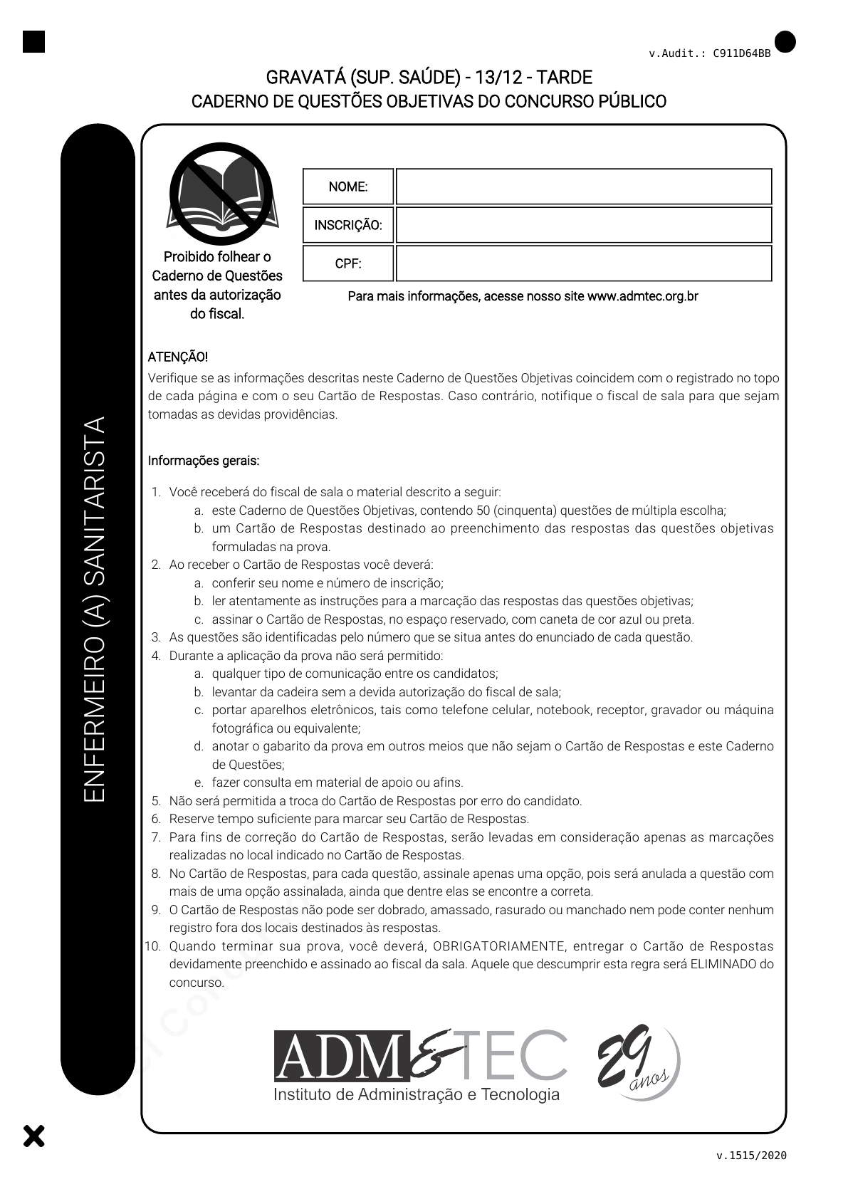 pcimarkpci MjgwNDowZDQxOmU2MzA6MzkwMDo5MWUyOmM0ODQ6ZWI1Nzo3ODM3:TW9uLCAwMiBEZWMgMjAyNCAxNDozODozNyAtMDMwMA== www.pciconcursos.com.br v.Audit.: C911D64BB v.1515/2020 GRAVATÁ (SUP. SAÚDE) - 13/12 - TARDE CADERNO DE QUESTÕES OBJETIVAS DO CONCURSO PÚBLICO EN FE RM EI RO (A ) S AN IT AR IS TA NOME: INSCRIÇÃO: CPF: Para mais informações, acesse nosso site www.admtec.org.br Proibido folhear o Caderno de Questões antes da autorização do fiscal. ATENÇÃO! Verifique se as informações descritas neste Caderno de Questões Objetivas coincidem com o registrado no topo de cada página e com o seu Cartão de Respostas. Caso contrário, notifique o fiscal de sala para que sejam tomadas as devidas providências. Informações gerais: Você receberá do fiscal de sala o material descrito a seguir:1. este Caderno de Questões Objetivas, contendo 50 (cinquenta) questões de múltipla escolha;a. um Cartão de Respostas destinado ao preenchimento das respostas das questões objetivasb. formuladas na prova. Ao receber o Cartão de Respostas você deverá:2. conferir seu nome e número de inscrição;a. ler atentamente as instruções para a marcação das respostas das questões objetivas;b. assinar o Cartão de Respostas, no espaço reservado, com caneta de cor azul ou preta.c. As questões são identificadas pelo número que se situa antes do enunciado de cada questão.3. Durante a aplicação da prova não será permitido:4. qualquer tipo de comunicação entre os candidatos;a. levantar da cadeira sem a devida autorização do fiscal de sala;b. portar aparelhos eletrônicos, tais como telefone celular, notebook, receptor, gravador ou máquinac. fotográfica ou equivalente; anotar o gabarito da prova em outros meios que não sejam o Cartão de Respostas e este Cadernod. de Questões; fazer consulta em material de apoio ou afins.e. Não será permitida a troca do Cartão de Respostas por erro do candidato.5. Reserve tempo suficiente para marcar seu Cartão de Respostas.6. Para fins de correção do Cartão de Respostas, serão levadas em consideração apenas as marcações7. realizadas no local indicado no Cartão de Respostas. No Cartão de Respostas, para cada questão, assinale apenas uma opção, pois será anulada a questão com8. mais de uma opção assinalada, ainda que dentre elas se encontre a correta. O Cartão de Respostas não pode ser dobrado, amassado, rasurado ou manchado nem pode conter nenhum9. registro fora dos locais destinados às respostas. Quando terminar sua prova, você deverá, OBRIGATORIAMENTE, entregar o Cartão de Respostas10. devidamente preenchido e assinado ao fiscal da sala. Aquele que descumprir esta regra será ELIMINADO do concurso. pcimarkpci MjgwNDowZDQxOmU2MzA6MzkwMDo5MWUyOmM0ODQ6ZWI1Nzo3ODM3:TW9uLCAwMiBEZWMgMjAyNCAxNDozODozNyAtMDMwMA== www.pciconcursos.com.br INSTITUTO ADM&TEC | GRAVATÁ (SUP. SAÚDE) - 13/12 - TARDE v.Audit.: C911D64BB ENFERMEIRO (A) SANITARISTA - Página 2 de 14 v.1515/2020 CONHECIMENTOS ESPECÍFICOS Questões de 1 a 40 1 Analise as afirmativas a seguir e marque a opção CORRETA: a) Fazer uso da empatia e atenuar a burocracia são atitudes que dificultam o bom atendimento no serviço público. b) É dever do servidor público municipal prestar serviços com baixa qualidade e de forma ineficiente. c) A confiabilidade e a empatia são fatores impeditivos para a excelência no atendimento ao público de uma instituição municipal. d) A moralidade da Administração Pública está diretamente relacionada à busca pelo bem comum. Assim, o servidor público deve sempre valorizar o equilíbrio entre a legalidade e a finalidade em sua conduta profissional. 2 Analise as afirmativas a seguir: I. O procedimento de coleta de amostras respiratórias dos casos suspeitos de COVID19 deve seguir o protocolo de coleta da Influenza. Contudo, considerando se tratar de um novo vírus ou novo subtipo viral em processo pandêmico, a amostra deverá ser coletada até o 8º dia dos sintomas, preferencialmente até o 3º dia. As amostras devem ser mantidas refrigeradas (4-8°C) e devem ser processadas dentro de 24 a 72 horas da coleta. Na impossibilidade de envio dentro desse período, recomenda-se congelar as amostras a -70°C até o envio, assegurando a manutenção da temperatura. II. O uso de máscara cirúrgica é uma das medidas de prevenção a ser utilizada pelos profissionais de saúde para limitar a propagação do novo coronavírus. Ela deve ser utilizada para evitar a contaminação da boca e nariz do profissional por gotículas respiratórias. Porém, quando o profissional atuar em procedimentos com risco de geração de aerossol nos pacientes com infecção suspeita ou confirmada pelo novo coronavírus (2019-nCoV), deve ser utilizada a máscara de proteção respiratória (respirador particulado) com eficácia mínima na filtração de 95% de partículas de até 0,3 micrômetro. III. Se a pressão direta for incapaz de controlar o sangramento em um membro, deve-se util izar um torniquete. Os torniquetes utilizam uma ligação simples em torno de um membro para parar o fluxo sanguíneo. Podem ser utilizados tanto torniquetes fabricados comercialmente ou improvisados com materiais que estejam próximos no momento. Após a instalação do torniquete, é necessário documentar a hora da aplicação e não afrouxar ou remover o torniquete, a menos que seja realizado por pessoal médico qualificado. Marque a alternativa CORRETA: a) Nenhuma afirmativa está correta. b) Apenas uma afirmativa está correta. c) Apenas duas afirmativas estão corretas. d) Todas as afirmativas estão corretas. 3 Analise as afirmativas a seguir: I. Recomenda-se que os serviços de saúde públicos e privados NÃO enviem casos suspeitos ou confirmados de COVID-19 para o Serviço de Verificação de Óbito (SVO). Caso a coleta de material biológico não tenha sido realizada em vida, deve-se proceder a coleta post-mortem no serviço de saúde, por meio de swab na cavidade nasal e
