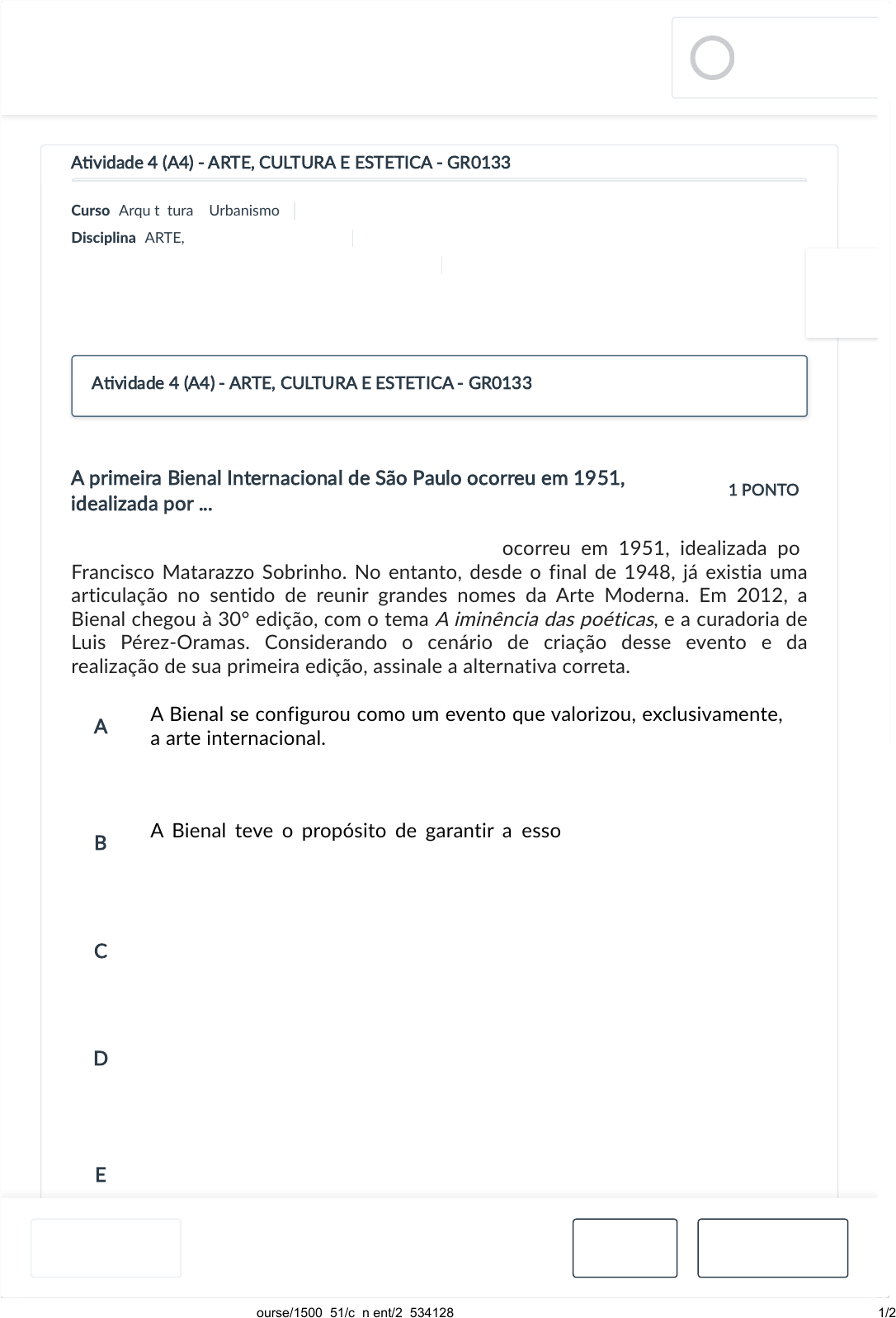 Atividade 4 (A4) - ARTE, CULTURA E ESTETICA - GR0133 Prazo de envio 02/12/2024 - 23:59 Vale 10 pontos A�vidade 4 (A4) - ARTE, CULTURA E ESTETICA -… Prazo: 02/12/2024 - 23:59 Revisão A�vidade 4 (A4) Prazo: 04/12/2024 - 23:59 A�vidade 4 (A4) Disciplina: ARTE, CULTURA E ESTÉTICA (242GGR0133A) A�vidade 4 (A4) - ARTE, CULTURA E ESTETICA - GR0133 Curso: Arquitetura e Urbanismo Disciplina: ARTE, CULTURA E ESTÉTICA Turma: ARTE, CULTURA E ESTÉTICA (242GGR0133A) Período: 20242 A primeira Bienal Internacional de São Paulo ocorreu em 1951, idealizada por ... A primeira Bienal Internacional de São Paulo ocorreu em 1951, idealizada por Francisco Matarazzo Sobrinho. No entanto, desde o final de 1948, já existia uma articulação no sentido de reunir grandes nomes da Arte Moderna. Em 2012, a Bienal chegou à 30° edição, com o tema A iminência das poéticas, e a curadoria de Luis Pérez-Oramas. Considerando o cenário de criação desse evento e da realização de sua primeira edição, assinale a alternativa correta. A B C D E 1 PONTO A Bienal se configurou como um evento que valorizou, exclusivamente, a arte internacional. A Bienal teve o propósito de garantir acesso à arte para as camadas mais pobres. A Bienal reuniu artistas de diversas nacionalidades e variados estilos. A Bienal buscou valorizar os pequenos artistas locais, que estavam começando sua profissão. A Bienal foi criada para atender aos interesses das elites cultural e artística da época. A�vidade 4 (A4) - ARTE, CULTURA E ESTETICA - GR0133 LEONARDO KENJI00:03:28 LM Anterior 1/10 Próximo 02/12/2024, 13:41 :: Plataforma A https://levelup.grupoa.education/plataforma/course/1500151/content/20534128 1/2 Revisão Atividade 4 (A4) Este item possui condicionais de liberação Ficará disponível se a�ngir o desempenho de: A�vidade 4 (A4) - ARTE, CULTURA E ESTETICA - GR0133 - Mínimo 0 pontos De: 21/10/24 - 00:00 a 02/12/24 - 23:59 Vale: 10 pts Anterior Pratique e Compartilhe Próximo Fórum de Dúvidas A�vidade 4 (A4) - ARTE, CULTURA E ESTETICA -… Prazo: 02/12/2024 - 23:59 Revisão A�vidade 4 (A4) Prazo: 04/12/2024 - 23:59 A�vidade 4 (A4) Disciplina: ARTE, CULTURA E ESTÉTICA (242GGR0133A) 02/12/2024, 13:41 :: Plataforma A https://levelup.grupoa.education/plataforma/course/1500151/content/20534128 2/2 https://levelup.grupoa.education/plataforma/course/1500151/content/20534130 https://levelup.grupoa.education/plataforma/course/1500151/content/20534129