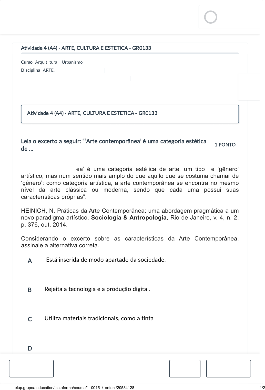 Atividade 4 (A4) - ARTE, CULTURA E ESTETICA - GR0133 Prazo de envio 02/12/2024 - 23:59 Vale 10 pontos A�vidade 4 (A4) - ARTE, CULTURA E ESTETICA -… Prazo: 02/12/2024 - 23:59 Revisão A�vidade 4 (A4) Prazo: 04/12/2024 - 23:59 A�vidade 4 (A4) Disciplina: ARTE, CULTURA E ESTÉTICA (242GGR0133A) A�vidade 4 (A4) - ARTE, CULTURA E ESTETICA - GR0133 Curso: Arquitetura e Urbanismo Disciplina: ARTE, CULTURA E ESTÉTICA Turma: ARTE, CULTURA E ESTÉTICA (242GGR0133A) Período: 20242 Leia o excerto a seguir: “‘Arte contemporânea’ é uma categoria estética de ... Leia o excerto a seguir: “‘Arte contemporânea’ é uma categoria estética de arte, um tipo de ‘gênero’ artístico, mas num sentido mais amplo do que aquilo que se costuma chamar de ‘gênero’: como categoria artística, a arte contemporânea se encontra no mesmo nível da arte clássica ou moderna, sendo que cada uma possui suas características próprias”. HEINICH, N. Práticas da Arte Contemporânea: uma abordagem pragmática a um novo paradigma artístico. Sociologia & Antropologia, Rio de Janeiro, v. 4, n. 2, p. 376, out. 2014. Considerando o excerto sobre as características da Arte Contemporânea, assinale a alternativa correta. A B C D E 1 PONTO Está inserida de modo apartado da sociedade. Rejeita a tecnologia e a produção digital. Utiliza materiais tradicionais, como a tinta a óleo. Promove a interação direta entre arte e espectador. Manifesta-se apenas na pintura. A�vidade 4 (A4) - ARTE, CULTURA E ESTETICA - GR0133 LEONARDO KENJI00:11:47 LM Anterior 5/10 Próximo 02/12/2024, 13:50 :: Plataforma A https://levelup.grupoa.education/plataforma/course/1500151/content/20534128 1/2 Revisão Atividade 4 (A4) Este item possui condicionais de liberação Ficará disponível se a�ngir o desempenho de: A�vidade 4 (A4) - ARTE, CULTURA E ESTETICA - GR0133 - Mínimo 0 pontos De: 21/10/24 - 00:00 a 02/12/24 - 23:59 Vale: 10 pts Anterior Pratique e Compartilhe Próximo Fórum de Dúvidas A�vidade 4 (A4) - ARTE, CULTURA E ESTETICA -… Prazo: 02/12/2024 - 23:59 Revisão A�vidade 4 (A4) Prazo: 04/12/2024 - 23:59 A�vidade 4 (A4) Disciplina: ARTE, CULTURA E ESTÉTICA (242GGR0133A) 02/12/2024, 13:50 :: Plataforma A https://levelup.grupoa.education/plataforma/course/1500151/content/20534128 2/2 https://levelup.grupoa.education/plataforma/course/1500151/content/20534130 https://levelup.grupoa.education/plataforma/course/1500151/content/20534129