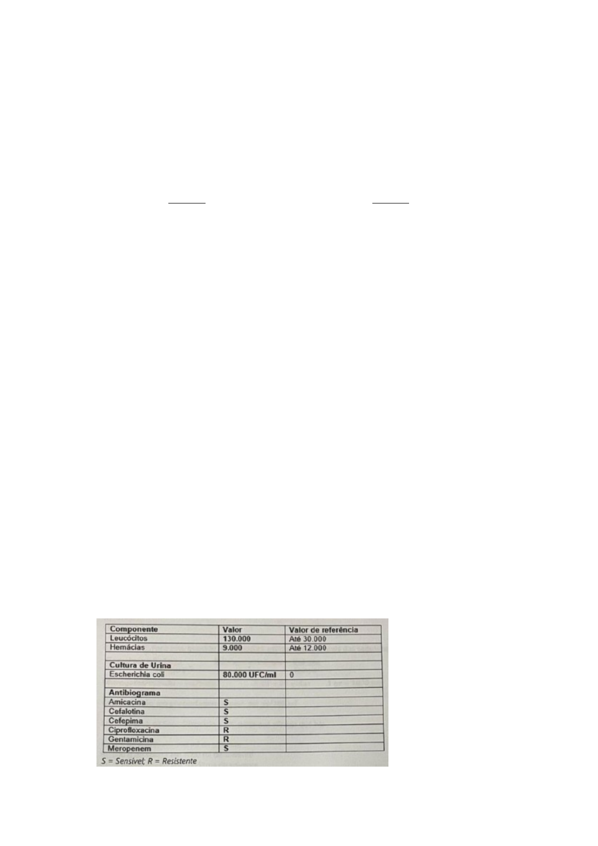 Impresso por Alexandre Cipriani, E-mail alexandre.segurancanotrabalho@gmail.com para uso pessoal e privado. Este material pode ser protegido por direitos autorais e não pode ser reproduzido ou repassado para terceiros. 22/09/2024, 02:34:30 RESUMÃO TAP 1 – Para esta questão, você poderá utilizar uma ou mais das seguintes fórmulas: Gotas / min = volume microgotas/minuto = volume Tempo x 3 tempo Microgotas / minuto = ml/hora 1ml = 20 gotas 1 gr = 1000 mg Concentração em porcentagem = peso em gr / 100 ml João trabalha no OS Santa Joana e recebeu a seguinte prescrição médica para administrar no paciente F.F.R, que acabou de chegar por hipoglicemia e falta de ar. Prescrito: SG7% - 500 ml Disponível 500 ml de SG a 5% e ampolas de glicose a 50% em 10 ml. Quantos gramas de glicose João deve acrescentar para realizar a transformação do SG? A – 10 g B – 15 g C – 50 g D – 30 g E – 12 g 2 - Sra J.J.A foi internada por infecção do trato urinário, recebendo Ciprofloxacina 1G EV de 6/6h Meropenem 725mg EV de 12/12h. Foram solicitados exames de urina I urocultura e antibiograma. Analisando o antibiograma a seguir, assinale quais antibióticos são os mais indicados à paciente. Impresso por Alexandre Cipriani, E-mail alexandre.segurancanotrabalho@gmail.com para uso pessoal e privado. Este material pode ser protegido por direitos autorais e não pode ser reproduzido ou repassado para terceiros. 22/09/2024, 02:34:30 A - Amicacina e Gentamicina. B - Cefalotina e Cefepima. C - Ciprofloxacina e Cefepima. D - Meropenem e Ciprofloxacina. E - Cefalotina e Ciprofloxacina. 3 – Sobre o diagnóstico da esclerose múltipla, segundo os critérios de McDonald (tabela a seguir, com adaptações), assinale a alternativa CORRETA A – Saber a exposição clínica, é necessário sempre ter apresentado 2 ou mais surtos para o diagnóstico da EM B – Para o diagnóstico da EM, não há necessidade de dados adicionais como os achados da EM C – Para o diagnóstico da EM não há necessidade de avaliação clínica criteriosa, com presença de surtos e análise de achados adicionais D – O exame de liquor neutraliza os achados clínicos no diagnostico da EM E – A ressonância magnética é o único exame que consegue diagnosticar a EM 4 – Para esta questão, você poderá utilizar uma ou mais das seguintes fórmulas: Gotas / min = volume microgotas/minuto = volume Tempo x 3 tempo Impresso por Alexandre Cipriani, E-mail alexandre.segurancanotrabalho@gmail.com para uso pessoal e privado. Este material pode ser protegido por direitos autorais e não pode ser reproduzido ou repassado para terceiros. 22/09/2024, 02:34:30 Microgotas / minuto = ml/hora 1ml = 20 gotas 1 gr = 1000 mg Concentração em porcentagem = peso em gr / 100 ml Considerando que a paciente JJA tem um antibiótico prescrito, quantas gotas por minuto devem ser instaladas do Meropenem 725mg, diluído em 100 ml SF 0,9% para correr em 1 H? Disponível frasco de 1 G. A - 100 gts/min B - 35 gts/min C - 33 gts/min D - 60 gts/min E - 89 gts/min 5 – O monitoramento do processo de esterilização é necessário para garantir a esterilidade do produto. Assinale verdadeiro (V) ou falso (F) I – O indicador biológico monitora a morte microbiana II – O indicador químico externo (fita zebrada) é uma tinta reagente ao processo de esterilização que reage a um ou mais parâmetros usados internamente ou em pacote desafio. III – Indicador Bowie-Dick é um teste específico para autoclave que identifica a eficácia da bomba de vácuo IV – O indicador químico externo (classe5 ou 6) é uma tinta reagente colocada externamente ao pacote Assinale a alternativa correta em relação ao monitoramento de esterilização. A – V, F,V,F B – V,V,V,F C - F,V,F,V D – V,V,F,F E – F,F,F,V 6 - Assinale a alternativa CORRETA sobre as funções do sistema cardiovascular: A - Transporte de gases e resíduos químicos. B - Transporte de resíduos metabólicos nutrientes. C - Transporte de resíduos químico e calor. Impresso por Alexandre Cipriani, E-mail alexandre.segurancanotrabalho@gmail.com para uso pessoal e privado. Este material pode ser protegido por direitos autorais e não pode ser reproduzido ou repassado para terceiros. 22/09/2024, 02:34:30 D - Regulação intrínseca de temperatura e transporte de gases. E - Transporte de calor e de resíduos metabólicos. 7 – Na figura a seguir constam os valores das taxas de mortalidade por doenças cardiovasculares (DCV) por idade para cada país de língua portuguesa em 1990 a 2016. A análise do gráfico demonstra: A – Em 1990, a taxa de mortalidade por DCV em Angola foi menor que em 2016 B – Em relação a taxa de mortalidade em 2016, Guiné Bissau obteve menor mortalidade comparada a Portugal C – Guiné Equatorial obteve a menor taxa de mortalidade em comparação a todos os demais países no ano de 2016 E – São Tome e Principe foi o país que apresentou maior disparidade de mortes por DCV comparados aos anos de 1990 a 2016 8 - O infarto do miocárdio (IM), popularmente conhecido com “ataque cardíaco”, consiste na morte do músculo cardíaco resultante de esquemia. A presença de uma obstrução arterial coronariana ocasiona a perda do suprimento sanguíneo crucial para o funcionamento cardíaco. A principal causa da obstrução do fluxo sanguíneo é: A - Histórico familiar. B - Tabagismo C - Obesidade Impresso por Alexandre Cipriani, E-mail alexandre.segurancanotrabalho@gmail.com para uso pessoal e privado. Este material pode ser protegido por direitos autorais e não pode ser reproduzido ou repassado para terceiros. 22/09/2024, 02:34:30 D - Hipertensão arterial E - Doença arterosclerótica 9 - O produto do metabolismo proteico do metabolismo filtrado do sangue que serve como importante medida do funcionamento renal é: A - Potássio B - Sódio C - Cálcio D - Ureia E - Vitamina K 10 - As cidades de clima quente vivenciam no verão constantes epidemias de dengue. Indiq