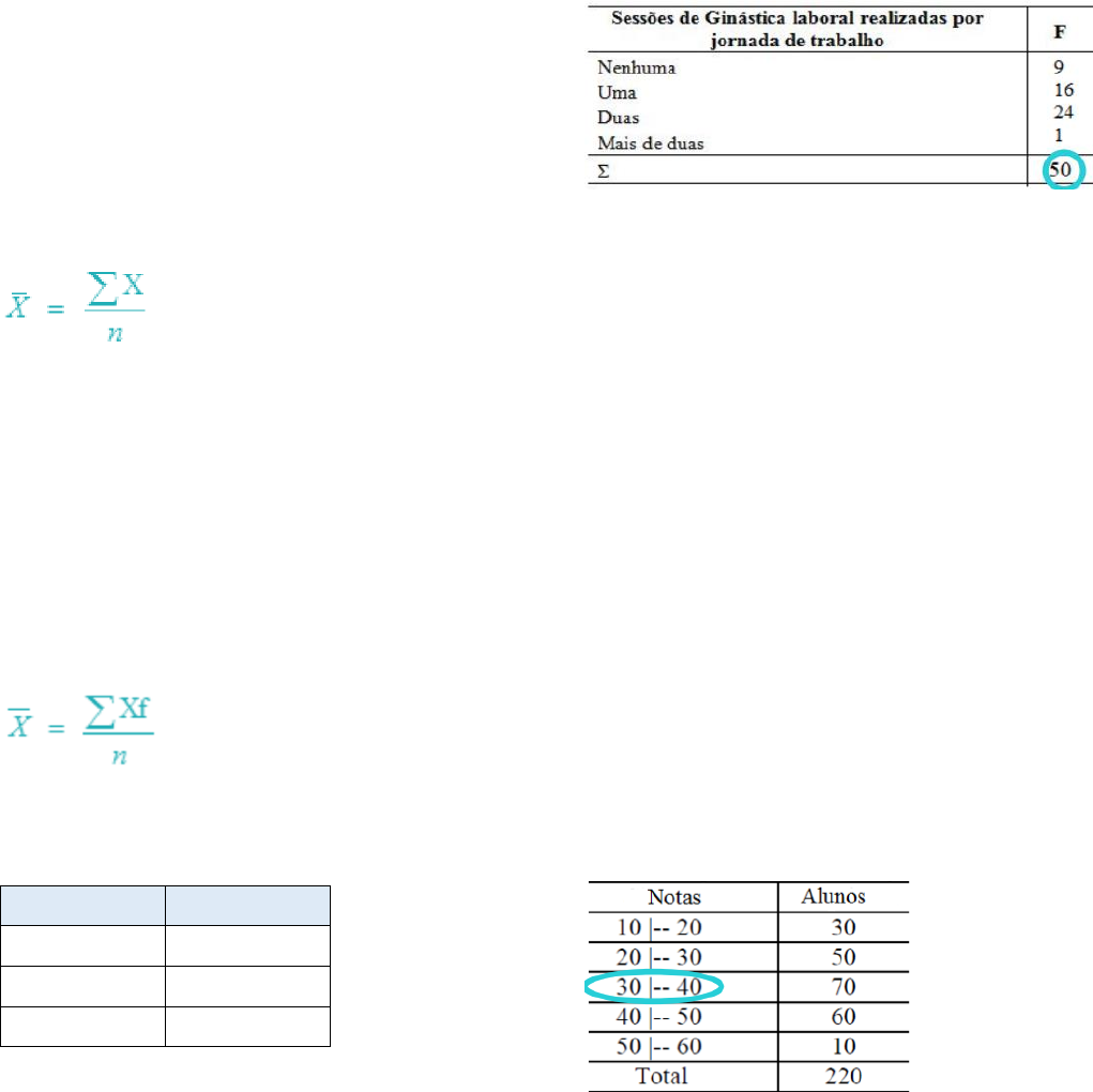 Medidas de Tendência Central MÉDIA ARITMÉTICA: soma de todos os valores de um conjunto de dados dividida pelo número total de valores. DADOS SIMPLES (ROL): quando tem uma lista de números calcula-se: soma todos os números e divide pelo total de números. EX: números: 5, 10, 15 (3 números); Soma: 30 / 3 = 10 (média). DADOS AGRUPADOS (PONDERADA): 1) Multiplicar cada valor pela sua frequência; 2) Somar todos os produtos; 3) Dividir pela soma das frequências. EX: nota dos alunos de uma turma: NOTA (x) FREQUÊNCIA (f) 5 2 10 3 15 1 • Multiplicar (x e f): 5 x 2 = 10; 10 x 3 = 30; 15 x 1 = 15. • Somar: 10 + 30 + 15 = 55. • Dividir: 55 / 6 = 9,17 (média). MEDIANA: valor central da distribuição. EX: • Se “n” for ímpar: (n + 1 / 2); • Se “n” for par: Se for número igual (deixa o mesmo); Se for diferente: soma e divide por 2. MODA: valor que ocorre com mais frequência (variáveis qualitativas e quantitativas. • Amodal: valores se repetem na mesma quantidade; • Bimodal: 2 valores que se repetem na mesma quantidade; • Trimodal: 3 valores que se repetem na mesma quantidade; • Polimodal: de 4 em diante. MODA BRUTA: ponto médio da classe de maior frequência. EX: MoB = 30 + 40 / 2 = 35 (maioria dos alunos tiraram 35).