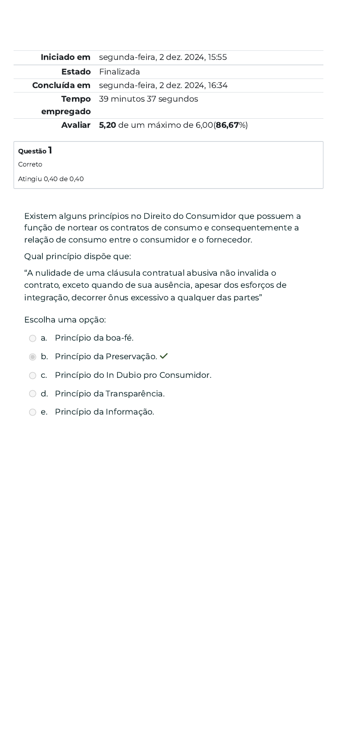 Iniciado em segunda-feira, 2 dez. 2024, 15:55 Estado Finalizada Concluída em segunda-feira, 2 dez. 2024, 16:34 Tempo empregado 39 minutos 37 segundos Avaliar 5,20 de um máximo de 6,00(86,67%) Questão 1 Correto Atingiu 0,40 de 0,40 Existem alguns princípios no Direito do Consumidor que possuem a função de nortear os contratos de consumo e consequentemente a relação de consumo entre o consumidor e o fornecedor. Qual princípio dispõe que: “A nulidade de uma cláusula contratual abusiva não invalida o contrato, exceto quando de sua ausência, apesar dos esforços de integração, decorrer ônus excessivo a qualquer das partes” Escolha uma opção: a. Princípio da boa-fé. b. Princípio da Preservação. ✓ c. Princípio do In Dubio pro Consumidor. d. Princípio da Transparência. e. Princípio da Informação. Questão 2 Correto Atingiu 0,40 de 0,40 Questão 3 Correto Atingiu 0,40 de 0,40 O débito de consumo decorre de uma relação limitada às pessoas do fornecedor e do consumidor. Como consequência, qualquer esforço de cobrança há que ser dirigido contra a pessoa deste. Não pode envolver terceiros, assim Código de Proteção e Defesa do Consumidor Na cobrança de débito, o consumidor inadimplente. Assinale a alternativa correta. Escolha uma opção: a. não terá acesso às informações existentes em cadastro ou registros de cobrança aprovadas sobre ele. b. deverá quitar o valor principal da dívida, mesmo que não seja de sua responsabilidade, para posterior reclamação. c. responderá, sem direito à restituição, apenas pelos acréscimos decorrentes da dívida, mesmo que a cobrança seja indevida. d. não tem direito a reclamações sobre o valor cobrado. e. não será exposto ao ridículo e nem submetido a qualquer tipo de constrangimento ou ameaça. ✓ Considerando os estudos acerca da responsabilidade civil ANALISE as asserções abaixo: I) A empresa que integra a cadeia de fornecimento de serviços, ainda que na condição de parceira, é subsidiariamente responsável por eventuais danos causados ao destinatário �nal dos serviços; PORQUE II) Inexiste responsabilidade objetiva por parte de instituições �nanceiras em razão de crime ocorrido em suas dependências quando este se originar de fato exclusivo de terceiro; Logo, ASSINALE a alternativa correta: Escolha uma opção: a. As asserções I e II são proposições verdadeiras e a II é uma justi�cativa corretada I. b. As asserções I e II são proposições falsas. ✓ c. A asserção I é uma proposição falsa e a II é uma proposição verdadeira. d. As asserções I e II são proposições verdadeiras, mas a II não é uma justi�cativa correta da I. e. A asserção I é uma proposição verdadeira e a II é uma proposição falsa. Questão 4 Correto Atingiu 0,40 de 0,40 De acordo com o art. 2º da Lei nº. 8.078/90 (Código de Defesa do Consumidor - CDC): “Art. 2° Consumidor é toda pessoa física ou jurídica que adquire ou utiliza produto ou serviço como destinatário �nal” (BRASIL, 1990). Existem 3 elementos indispensáveis ao conceito de consumidor, sendo eles: I - Elemento subjetivo – pode ser considerado consumidor a pessoa física ou pessoa jurídica. II - Elemento teleológico – é considerado consumidor todo aquele que utiliza ou adquire um produto ou serviço. III - Elemento objetivo – é preciso que haja a compra de um produto ou o uso de algum serviço, na qualidade de destinatário �nal. Estão corretas as assertivas: Escolha uma opção: a. Todas as assertivas estão incorretas. b. Todas as assertivas estão corretas. c. Apenas a assertiva I. ✓ d. Apenas a assertiva III. e. Apenas a assertiva II. Questão 5 Correto Atingiu 0,40 de 0,40 A Política Nacional das Relações de Consumo tem por objetivo o atendimento das necessidades dos consumidores, o respeito à sua dignidade, saúde e segurança, a proteção de seus interesses econômicos, a melhoria da sua qualidade de vida, bem como a transparência e harmonia das relações de consumo. Quais destes princípios a referida política atende, conforme disposição do próprio Código de Defesa do Consumidor? I - reconhecimento da vulnerabilidade do consumidor no mercado de consumo. II - ação governamental no sentido de proteger efetivamente o consumidor. III - harmonização dos interesses dos participantes das relações de consumo. IV - educação e informação de fornecedores e consumidores. Escolha uma opção: a. Apenas as assertivas II, III e IV estão corretas. b. Apenas as assertivas I e II estão corretas. c. Apenas as assertivas III e IV estão corretas. d. Apenas as assertivas I e III estão corretas. e. Todas as assertivas estão corretas. ✓ Questão 6 Correto Atingiu 0,40 de 0,40 Como sabido, o Sistema Nacional de Defesa do Consumidor (SNDC) engloba os Procons, Ministério Público, Defensoria Pública e entidades civis que atuam na defesa dos direitos do consumidor e O Departamento Nacional de Defesa do Consumidor, da Secretaria Nacional de Direito Econômico (MJ), ou órgão federal que venha substituí-lo, é organismo de coordenação da política do Sistema Nacional de Defesa do Consumidor. Neste sentido, considere as seguintes assertivas: I- Integram o Sistema Nacional de Defesa do Consumidor (SNDC), os órgãos federais, estaduais, do Distrito Federal e municipais e as entidades privadas de defesa do consumidor. II-Integram o Sistema Nacional de Defesa do Consumidor (SNDC), apenas os órgãos federais e as entidades privadas de defesa do consumidor. III-Integram o Sistema Nacional de Defesa do Consumidor (SNDC), apenas os órgãos estaduais, municipais e as entidades privadas de defesa do consumidor. IV-Integram o Sistema Nacional de Defesa do Consumidor (SNDC), apenas as entidades privadas de defesa do consumidor. Escolha uma opção: a. Apenas a assertiva I está correta. ✓ b. Apenas a assertiva II está correta. c. Apenas a assertiva IV está correta. d. Apenas a assertiva