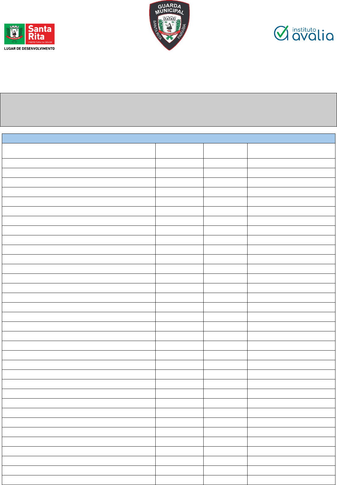 Anexo Único - Edital de Convocação para a Inspeção de Saúde e Exame Toxicológico – Concurso Público N° 01/2024 Página 1 De 11 PREFEITURA MUNICIPAL DE SANTA RITA SECRETARIA MUNICIPAL DE SEGURANÇA PÚBLICA E DEFESA SOCIAL ESTADO DA PARAÍBA A N E X O Ú N I C O - E D I T A L D E C O N V O C A Ç Ã O P A R A A I N S P E Ç Ã O D E S A Ú D E E E X A M E T O X I C O L Ó G I C O E D I T A L D E A B E R T U R A N º 0 1 / 2 0 2 4 GUARDA CIVIL MUNICIPAL - FEMININO - AMPLA CONCORRÊNCIA Nome Inscrição Nota Objetiva Classificação Demonstrativa de aplicação da linha de corte Hilda Maria Araujo Siqueira 4960007990 99,00 1 Carolina Magna Da Silva Matos 4960001602 92,00 2 Cristiane Crispim Muniz 4960005305 91,00 3 Jaqueline Valentim Santana 4960005361 91,00 4 Amanda Alves Dos Santos 4960007041 90,00 5 Amanda Kaline Dias De Araujo 4960004026 90,00 6 Giulia Roberta Silveira De Melo 4960000251 89,00 7 Raíssa Caynara Ferreira De Moura 4960009991 89,00 8 Ana Flávia Melo Cabral Dos Santos 4960007992 88,00 9 Beatriz De Figueiredo Grilo 4960002867 88,00 10 Inara Bezerra Barros 4960007920 88,00 11 Mycaelle Karolina Silva Dos Santos 4960005447 88,00 12 Rossana Larissa Lima Da Silva (Rosana) 4960000324 88,00 13 Maria Luiza Araújo De Moura 4960000521 87,00 14 Andressa De Sousa Mariano 4960008576 86,00 15 Liana Claudia Cardosolima 4960002694 86,00 16 Yasmin Marinho Da Cunha 4960001055 86,00 17 Ana Beatriz Martins De Lima 4960006307 85,00 18 Diana Monalisa Silva De Melo 4960004566 85,00 19 Flávia Serafim Martins De Araújo Santiago 4960000272 85,00 20 Joselma Siqueira Da Silva Oliota Ribeiro 4960001604 85,00 21 Kyria Raquel Da Silva 4960007000 85,00 22 Luanny Almeida Galvão De Lima 4960003706 85,00 23 Samara Vitória Gomes Da Silva 4960004983 85,00 24 Talita Lorena Andrade De Medeiros 4960009652 85,00 25 Vitória Carlos Silva De Morais 4960001280 85,00 26 Erica Gabriela Carvalho Fernandes 4960000252 84,00 27 Fernanda De Albuquerque Oliveira 4960006488 84,00 28 Larissa Leite Dantas 4960007713 84,00 29 Maria Isabel Rufino De Lacerda Juvino 4960005433 84,00 30 Michelly Da Silva Barros 4960008468 84,00 31 Suiany Araujo De Meneses 4960002095 84,00 32 Barbara Morais Carneiro Primo 4960007568 83,00 33 Flaviane Kelly Da Silva Alves 4960008890 83,00 34 Anexo Único - Edital de Convocação para a Inspeção de Saúde e Exame Toxicológico – Concurso Público N° 01/2024 Página 2 De 11 Jacyara Araújo De Oliveira 4960008087 83,00 35 Jainne Agatha Costa Bezerra 4960004731 83,00 36 Larissa Caldeira Patrício Da Silva 4960009673 83,00 37 Pérola Caroline Maria Peixe Da Silva 4960002962 83,00 38 Renata Romero De Miranda Henriques 4960008208 83,00 39 Renata Soares Dantas Viana (Renata) 4960001382 83,00 40 Renatha Rozeany Gomes Da Silva 4960006966 83,00 41 Talita Geovanna Fernandes Rocha 4960008925 83,00 42 Bruna Mendes De Medeiros Gomes 4960002124 82,00 43 Fernanda Larissa Freitas Aires 4960000259 82,00 44 Lidhya Bessa Araujo 4960003114 82,00 45 Tássia Camila Firmino De Lima 4960004437 82,00 46 Thais Da Silva Barbosa 4960004362 82,00 47 Aline Batista Da Silva 4960006997 81,00 48 Carla Beatriz Gomes Rodrigues 4960000689 81,00 49 Carolinna Felix Dantas De Oliveira 4960002370 81,00 50 Debora Fonseca Do Nascimento 4960008831 81,00 51 Domênica Brito De Melo 4960001285 81,00 52 Giovanna Fernandes Souto Do Monte 4960007077 81,00 53 Hortência Gabriela Fernandes Da Costa 4960008130 81,00 54 Izabelle Fabrício Da Silva 4960007143 81,00 55 Jéssica Da Silva Santos 4960009473 81,00 56 Joyce Karla De Almeida Ferraz 4960005590 81,00 57 Karollayne Pontes Lima Da Silva 4960001015 81,00 58 Kassandra Munike Miranda Da Fonseca 4960006270 81,00 59 Luana Raquelly Assunção De Paula 4960005626 81,00 60 Maria Clara De Jesus Maniçoba Balduino 4960007296 81,00 61 Rayane Raiza Da Silva Ferreira 4960004436 81,00 62 Renata Gabriella Do Nascimento Silva 4960009442 81,00 63 Roberta De Carvalho Santos 4960007157 81,00 64 Sheila Cristina Pereira De França 4960002705 81,00 65 Thalita Lisboa De Menezes Melo 4960008102 81,00 66 Adriana Rodrigues Silva 4960005065 80,00 67 Bárbara Maria Arcoverde Melo 4960004105 80,00 68 Eisenglasy Nary De Moura Fernandes 4960009670 80,00 69 Elisabella Carla Feliciano Da Silva 4960001160 80,00 70 Ingrid De Souza Medeiros 4960007276 80,00 71 Izabela Barbosa Soares 4960009615 80,00 72 Laura Thalita Da Silva Sales 4960005799 80,00 73 Lívia Da Cunha Reis 4960009274 80,00 74 Maria Da Penha Almeida Pessoa 4960004475 80,00 75 Maria Isabel Lisboa De Carvalho Sobral 4960006532 80,00 76 Maryely Lopes De Souza 4960000375 80,00 77 Mayara Alice Amorim Cordeiro 4960005730 80,00 78 Thalitta Santos Tavares Domingos 4960009769 80,00 79 Thyffany Laurents Limeira De Oliveira 4960000581 80,00 80 Vívian Taylany Pereira Florencio 4960006247 80,00 81 Ana Leticia Navarro De Lima Torres 4960000370 79,00 82 Andrea Queiroz De Castro Gomes 4960001631 79,00 83 Anexo Único - Edital de Convocação para a Inspeção de Saúde e Exame Toxicológico – Concurso Público N° 01/2024 Página 3 De 11 Bianca De Almeida Pereira 4960006339 79,00 84 Camila Tavares Silva Bento 4960007934 79,00 85 Debora Claudia Da Silva 4960006566 79,00 86 Ellen Karine Teixeira De Oliveira 4960008702 79,00 87 Isabelle Shermylla Antero Oliveira Da Silva 4960006775 79,00 88 Juliana Florêncio Dos Santos 4960001904 79,00 89 Jussara Karollynne Bezerra Dantas 4960006779 79,00 90 Jussara Maria Estevam Da Silva 4960002902 79,00 91 Leila Dias Ramos De Oliveira 4960000204 79,00 92 Letícia Silva Soares 4960000116 79,00 93 Luana Jose Da Silva Costa 4960001068 79,00 94 Maria Gabriela Leandro Da Rocha 4960006022 79,00 95 Maria Victoria Nobrega Correia 4960002489 79,00 96 Mayra Vitoria Torres Dos Santos 4960004117 79,00 97 Miquerlaine De Sousa Gomes 4960001032 79,00 98 Monnara Dos Santos Freitas 4960004237 79,00 99 Renata Costa Dos Santos 4960001911 79,00 100 Sarah Witoria Andrea Dos Santos 4960002145 79,00 101 Whadsar Juliana Morais Dos Santos 4960009651 79,00