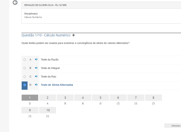 REINALDO DE OLIVEIRA SILVA RU: 521895 Disciplina(s): Cálculo Questão 1/10 - Cálculo Numérico Quais testes podem ser usados para examinar a convergência de séries de valores alternados? A Teste da Razão B Teste de Integral C Teste da Raiz D 40 Teste de Séries Alternadas 1 2 3 4 5 6 7 8 D A B B D (?) 9 10 (?) (?) PRÓXIMA