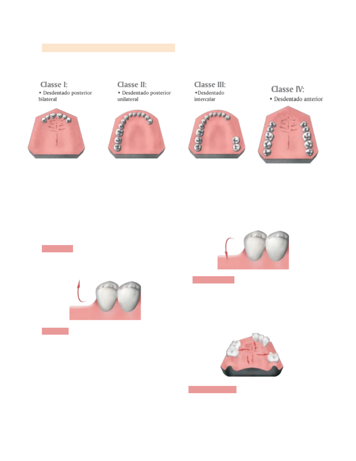 Revisão de Prótese total e Parcial Próteses Parciais Removíveis (PPR) ● Classificações: Classe I, modificação 2. Uma PPR classe I com mais dois espaços protéticos. Classe II, modificação 1. Uma PPR classe II com mais espaço protético. Classe IV não tem modificações, pois, se existisse mais de um espaço protético, enquadrar-se-ia em uma das outras três classes. ● Princípios biomecânicos: Retenção É a resistência às forças que atuam para remover a prótese. Suporte É a resistência às forças que atuam sobre uma prótese no sentido ocluso-cervical (vertical), durante a mastigação de alimentos duros. Estabilidade É a resistência às forças que atuam sobre uma prótese no plano horizontal, decorrente de contatos oclusais em planos inclinados. Reciprocidade Componente rígido, oposição as força do braço de retenção. Revisão de Prótese total e Parcial Circunscrição Deve circundar no mín.180° do dente, previne movimentos de pilar. ● Sistema de Retenção: Equadores: é uma linha imaginária que corresponde à maior circunferência da coroa. O equador anatômico do dente é o maior contorno de cada dente considerado individualmente. O equador protético é o equador em relação a todos os dentes, considerando um mesmo eixo de inserção e as diferentes inclinações dos dentes entre si. Partes do grampo: A ponta ativa, delgada e flexível, tem a função de retenção. Secundariamente, o corpo do grampo, mais espesso e menos flexível, tem a função de estabilização da prótese. Sem dificultar a remoção voluntária da prótese, os grampos devem ser suficientemente retentivos para que a prótese não seja deslocada por esforços Revisão de Prótese total e Parcial funcionais normais. A indicação do tipo de grampo a ser utilizado depende do tamanho e da localização dos espaços desdentados, do grau de inclinação dos dentes suportes e da retenção disponível. O volume dos freios labiais, a estética e o conforto do paciente, são igualmente determinantes. A estética é um fator que deve ser sempre levado em consideração, desde que não comprometa a funcionalidade da prótese. Grampos Grampos Circunferenciais Ackers ou “GCA”: O grampo circunferencial de Ackers é indicado para molares, pré-molares e eventualmente caninos, nos casos da Classe III de Kennedy. O braço de oposição, rígido, é indicado para todos os tipos de grampos e não deve invadir a área retentiva. Ele segue a linha do equador sem nunca ultrapassá-la. Grampo Geminado, Ackers duplo ou Bonwill: O grampo geminado pode ser considerado como uma combinação de dois grampos circunferenciais de Ackers, com a particularidade de criar uma retenção anterior e outra posterior. Grampo a Barra de Roach (T): O grampo de Roach é indicado sobre pré-molares na Classe III de Kennedy. Roach idealizou cinco formas básicas de grampos a barra, dando-lhes nomes de acordo com a forma: T, U, L, I, C. Revisão de Prótese total e Parcial Apoios A função principal dos apoios é a de assegurar que uma parte, ou a totalidade, das cargas exercidas sobre os dentes artificiais durante a mastigação seja transmitida aos dentes suportes. Os nichos preparados na boca, pelo dentista, e destinados a receber os apoios da prótese, devem ser feitos em forma de colher, para distribuir as forças oclusais em direção à raiz. Apoios diretos: Os apoios diretos, são localizados diretamente ao lado dos espaços desdentados. Eles são utilizados para a transmissão de forças aos dentes suportes. Apoios indiretos: Os apoios indiretos, são localizados distantes dos espaços desdentados, utilizados para neutralizar os movimentos de rotação da prótese. Revisão de Prótese total e Parcial Apoio Oclusal: Apoio de Cíngulo: O apoio de cíngulo é o apoio mais indicado sobre caninos. Ele tem prioridade de indicação sobre os apoios incisais quando as características anatômicas do cíngulo são favoráveis. Apoio incisal: A única indicação do apoio incisal é sobre os dentes anteriores. Pouco utilizado, ele tem a grande desvantagem de criar uma alavanca muito grande sobre os dentes suportes. Outro aspecto negativo deste grampo é a estética desfavorável. Revisão de Prótese total e Parcial Conectores Menores Além de unir os apoios e os grampos nas selas e nos conectores maiores, eles servem de via de transmissão das cargas oclusais para os dentes suportes, por meio dos apoios. Eles têm também a função de estabilizar a prótese, e de guiá-la durante sua inserção e remoção. Conectores Menores Direitos: Os conectores menores diretos são localizados ao lado dos espaços protéticos. Conectores Menores Indiretos: Os conectores menores indiretos são localizados distantes dos espaços protéticos. Conectores Maiores Os conectores maiores são os elementos encarregados de conectar os outros componentes da prótese entre si, de maneira a constituir um corpo único. Superior: ● Placa palatina simples: indicada para desdentados da classe III ou IV de kennedy ● Placa palatina em forma de”U”: Indicada para desdentados de todas as classes, na presença de tórus palatino, ou palato muito profundo. Revisão de Prótese total e Parcial ● Placa palatina ampla: Mais estendida que a placa palatina simples, ela é indicada para desdentados da Classe I e II de Kennedy, quando a prótese é mucodentossuportada (maior suporte pela mucosa). ● Placa unilateral: Realizada somente sob exigência e responsabilidade do dentista e do paciente. Este tipo de prótese não possui estabilidade, tem pouca retenção. É fácil de engolir. ● Placa palatina chapeada: As placas palatinas chapeadas são muito usadas para conter dentes com mobilidade, quando a prótese estiver na sua posição de assentamento final. ● Barra Palatina: Os riscos de quebra tornam a barra palatina não muito recomendável. Revisão de Prótese total e Parcial Inferior: A barra lingual, em forma de meia pêra, po