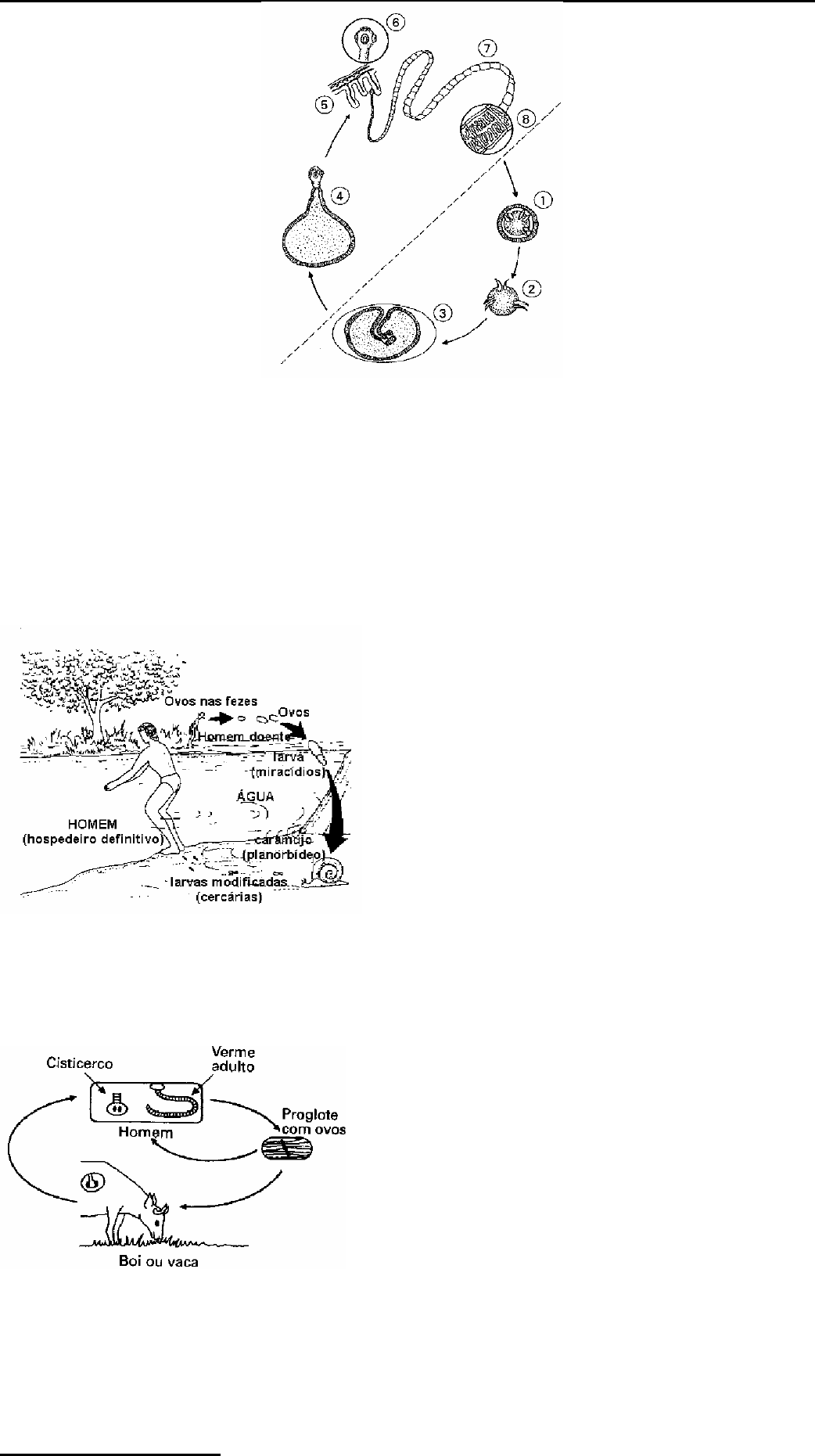 EXERCÍCIOS ZOOLOGIA WWW.SUPERBIOLOGIA.COM 6 Todas as afirmativas são corretas quanto ao ciclo da Taenia solium, EXCETO: a) A fase indicada por 3 pode ser encontrada tanto no cérebro do homem quanto no tecido muscular esquelético do porco. b) A meiose, na estrutura indicada por 8 originará tanto gametas masculinos quanto femininos. c) A respiração é do tipo cutânea, o tubo digestivo é completo e o desenvolvimento é direto no indivíduo indicado por 7. d) As estruturas 1 e 8 podem ser eliminadas pelas fezes do homem no ambiente e podem ser ingeridas pelo porco. e) O tecido indicado por 5 é do tipo epitelial simples e pertence ao hospedeiro definitivo do parasita. 17. (MACK-SPI Assinale a alternativa que apresenta apenas parasitoses que não envolvem mosquito como agente transmissor. a) esquistossomose, ancilostomose e ascaridíase b) esquistossomose, ascaridíase e malária c) elefantíase, malária e ancilostomose d) elefantíase, esquistossomose e ancilostomose e) teníase, malária e ancilostomose 18. (UFJF-MG) O esquema abaixo representa o ciclo evolutivo de um parasita Quando no hospedeiro definitivo, causa a: a) doença de Chagas. b) esquistossomose. c) teníase. d) elefantíase. e) Ieishmaniose. 19. (UnB-DF-modif.) Analise a representação do ciclo vital no esquema abaixo. Julgue os itens seguintes e marque o que for correto: http://www.superbiologia.com/ WWW.SUPERBIOLOGIA.COM 7 a) O esquema acima apresenta o ciclo vital resumido da Taenia solium (classe Cestoda). b) O homem sempre será hospedeiro definitivo. c) A ingestão de ovos de tênia causa doenças aos bois e às vacas, mas não atinge os homens. d) A ingestão de carne sempre bem cozida é uma medida de tratamento da parasitose. e) O homem é considerado hospedeiro definitivo porque geralmente o parasita realiza nele sua reprodução sexuada. 20. (PUC-MG) Os platelmintos de vida livre pertencem à classe: a) trematoda. b) diplopoda. c) amphineura. d) turbelaria. e) cestoidea. 21. (PUC-PR) Na classe Cestoda, os principais representantes endoparasitas humanos são as Taenia solium e Taenia saginata. Assinale a alterna- tiva verdadeira, considerando as proposições seguintes: I - A Taenia saginata é transmitida pela carne de gado com "pipoca" e apresenta ventosas com ganchos no seu escólex. II - A Taenia solium é transmitida através da carne de porco com "pipoca" e apresenta pseudoventosas (botrídias) no escólex. III - Ambas, a Taenia saginata e a Taenia solium, possuem estrobilização e não apresentam aparelho digestivo. a) Apenas III está correta. b) Apenas II está correta. c) Apenas I está correta. d) As proposições I e II estão corretas. e) As proposições I e III estão corretas. 22. (MACK-SP) Em certas regiões brasileiras, onde as pessoas usam açudes e represas para nadar, é usada a seguinte expressão: "Se nadou e depois coçou, é porque pegou A referência "pegou" é para a doença: a) cisticercose. b) tripanosomíase. c) esquistossomose. d) ancilostomose. e) ascaridíase. 23. (UFPA) As planárias e as tênias são animais: a) acelomados, triblásticos. b) acelomados, diblásticos. c) celomados, triblásticos. d) celomados, diblásticos. e) pseudocelomados, triblásticos. 24. (FCMSCSP) Considere as quatro características seguintes: I- ausência da cavidade do corpo. II- intestino com ramos que vão para várias partes do corpo. III- ausência comum de ânus. IV- sexos unidos. Tais características, em conjunto: a) diferem os platelmintos da maioria dos animais a eles superiores. b) são dos nematelmintos e os diferem dos platelmintos. c) diferem os platelmintos entre si em quatro classes. d) são comuns aos platelmintos e aos celenterados. e) diferem os platelmintos do estado larvário para o estado adulto. 25. (FMABC-SP) Considere o esquema abaixo, sobre o ciclo de vida do Schistosoma mansoni: III Caramujo Homem I II As três formas I, II e III , sob as quais o parasita pode ser encontrado na água, correspondem, respectivamente a: a) miracídio, cercária e ovo b) ovo, miracídio e cercária c) cercária, miracídio e ovo d) ovo, cercária e miracídio e) miracídio, ovo e cercária 26. (UFMG-94) Observe as figuras que se referem ao ciclo da esquistossomose mansônica. http://www.superbiologia.com/ EXERCÍCIOS ZOOLOGIA WWW.SUPERBIOLOGIA.COM 8 Em relação às figuras, é correto afirmar-se que: a) a infecção ocorre em 1 pelas formas 4, 2 e 3. b) a meiose ocorre da fase 4 para a fase 5. c) a passagem do indivíduo 4 pelo indivíduo 6 é necessária para que ele dê origem a 5. d) o indivíduo indicado por 4 é o hospedeiro definitivo do parasita. e) os indivíduos indicados em 2 localizam-se no sistema porta-hepático de 6. 27. (Puccamp-SPI Um animal triblástico, acelomado e de simetria bilateral pode ser uma: a) hidra. b) esponja. c) lombriga. d) minhoca. e) planária. 28. (Fuvest-SP) Existem animais que não possuem órgão ou sistema especializado em realizar trocas gasosas. Na respiração, a absorção do oxi- gênio e a eliminação do gás carbônico ocorrem por difusão através da superfície epidérmica. É o caso da: a) planária. d) barata. b) ostra. e) aranha. c) drosófila. 1. (UFMG) A ingestão freqüente de terra por crianças é um comportamento que pode indicar: a) anemia, como conseqüência de necatoríase. b) desnutrição, por deficiência de minerais para reposição de energia. c) fome, pois a terra ingerida produzirá sensação de saciedade. d) parasitose por Ascaris porque a ingestão de terra reduz a infestação. e) raquitismo, portanto as crianças buscam, instintivamente, o cálcio necessário ao seu crescimento. 2. (UFSC - mod.) Uma criança da região rural de Santa Catarina, após consulta médica, foi diagnosticada como portadora de Ascaridíase. Com relação a essa parasitose, é CORRETO afirmar (mais de uma alternativa pode estar correta): 01. Não existem medicamentos que permitam sua cura. 02. É provocada por um nematódeo popularmente conh