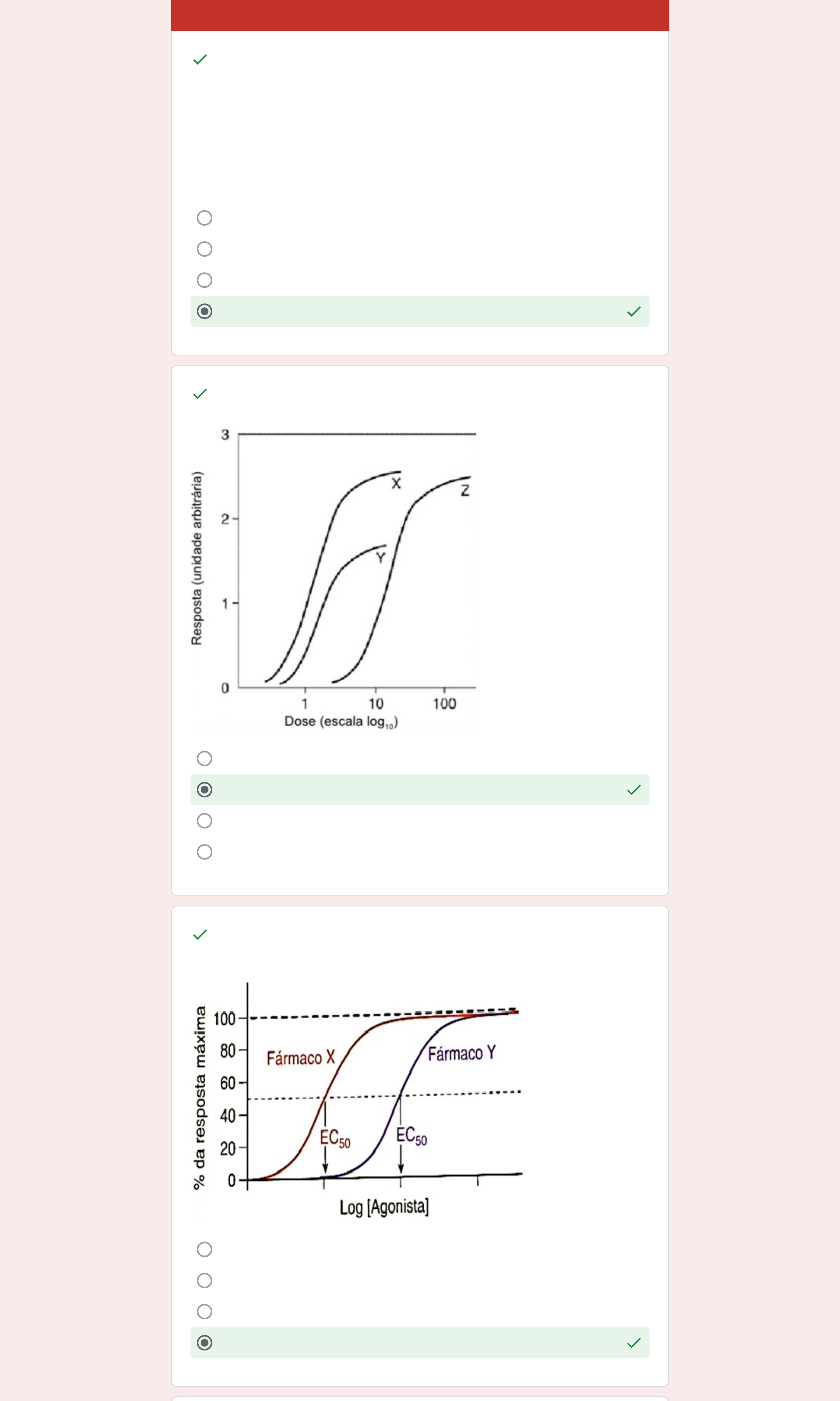 0 de 0 pontos 1123100269 Fernanda Alves Rodrigues de Lima Seção sem título 1000 de 1000 pontos 110/110 Agonista inverso, agonista total, antagonista competitivo irreversível Antagonista competitivo reversível, agonista parcial, agonista inverso Agonista parcial, agonista inverso, antagonista competitivo reversível Agonista parcial, agonista total, antagonista competitivo reversível 110/110 O fármaco Z é mais potente que o Fármaco Y O fármaco X tem a mesma eGcácia que o Z O fármaco X tem a mesma eGcácia que o Y O fármaco Y é mais potente que o Fármaco X 120/120 Fármaco Y é mais potente do que o fármaco X, mas tem a mesma eGcácia. Fármaco X apresenta maior potência e menor eGcácia do que o fármaco Y. Fármaco Y apresenta menor potência e menor eGcácia do que o fármaco X. Fármaco X é mais potente do que o fármaco Y, mas tem a mesma eGcácia. 110/110 Fármacos agonistas possuem aGnidade pelo receptor biológico e ao se ligar a eles, desencadeiam sua atividade intrínseca. Fármacos agonistas apresentam aGnidade pelo receptor biológico, mas ao se ligarem a eles, não desencadeiam sua atividade intrínseca. Fármacos antagonistas não possuem aGnidade pelo receptor biológico e não desencadeiam sua atividade intrínseca (biológica). Fármacos antagonistas são aqueles que promovem interação medicamentosa, diminuindo a atividade de outros medicamentos. É a relação entre a dose do fármaco que é tóxica e a dose que gera um efeito Ela é importante para que se tenha uma margem de segurança ao se administrar um medicamento Feedback O índice terapêutico é uma medida de segurança do fármaco, quanto maior o índice, ou a janela terapêutica, mais seguro é o fármaco 110/110 A morGna é menos potente do que a pentazocina A morGna é um agonista total e a pentazocina é um agonista parcial A morGna é menos eGcaz do que a pentazocina A pentazocina é um antagonista competitivo A pentazocina é um antagonista não competitivo 110/110 A naloxona é um antagonista competitivo A naloxona é um antagonista não competitivo. A morGna é um agonista total e a naloxona é um agonista parcial A morGna é menos potente do que a naloxona A morGna é menos eGcaz do que a naloxona 110/110 II e III II e V III e IV IV e V 110/110 Potencia, AGnidade e EGcácia EGcácia, AGnidade e Potencia AGnidade, Potencia e EGcácia EGcácia, Potencia e AGnidade 110/110 1 e 2 são fármacos agonistas e 3 é um fármaco antagonista. 1 e 2 são fármacos antagonistas e 3 é um fármaco agonista. 1, 2 e 3 são fármacos agonistas 1, 2 e 3 são fármacos antagonistas Este formulário foi criado em Uninove. Does this form look suspicious? Relatório Farmacodinâmica Total de pontos 1000/1000 O e-mail do participante (fernanda.alves.lima@uni9.edu.br) foi registrado durante o envio deste formulário. RA * Nome completo Em certa ocasião administrou-se uma elevada concentração de um fármaco X, que não desencadeou resposta tecidual máxima. Sendo assim, administrou-se um fármaco Y que atingiu resposta tecidual máxima, porém a dose gerou toxicidade, sendo necessário administrar um fármaco Z, capaz de bloquear a ação de Y. Em relação aos fármacos X, Y e Z, podemos afirmar que são respectivamente: * Observe o gráfico abaixo e assinale a alternativa correta * Analise e compare as curvas do gráficos dos fármacos (X e Y) e classifique quanto a potência e eficácia farmacológica. * A farmacodinâmica estuda a inter-relação da concentração de uma droga entre a biofase e a estrutura alvo, bem como o respectivo mecanismo de ação. Os conhecimentos sobre o local e o mecanismo de ação de fármacos têm crescido graças à intensificação das pesquisas bioquímicas e farmacológicas nesse campo. Sobre os fármacos que atuam em receptores, avalie as afirmativas abaixo e escolha a correta: * Defina o conceito de Índice Terapêutico? Qual a importância desse índice? * Na presença de pentazocina, é necessária maior concentração de morfina para obter alívio completo da dor. A pentazocina por si mesma tem um efeito analgésico menor do que o da morfina, mesmo em dosagem mais alta. Qual das seguintes afirmações é correta com relação a essas medicações? * Na presença de naloxona, é necessária maior concentração de morfina para obter alívio completo da dor. A naloxona por si só não tem efeito. Qual das seguintes afirmações é correta com relação a essas medicações? * Analise as afirmativas com relação aos alvos farmacológicos e correlacione a figura com o tipo de alvo (receptor) de fármacos. Marque a alternativa correta. * Os conceitos: * Observe a figura abaixo e marque a alternativa que indique a característica dos fármacos 1, 2 e 3 respectivamente,: * https://docs.google.com/forms/u/0/d/e/1FAIpQLScpgvgNPo8l0xS8NRUfPQS488vqz8Izw0XaUVYTm0yo_KfPpg/reportabuse?source=https://docs.google.com/forms/d/e/1FAIpQLScpgvgNPo8l0xS8NRUfPQS488vqz8Izw0XaUVYTm0yo_KfPpg/viewform?viewscore%3DAE0zAgAzj13LA2Y0Kx5sdMrh8siKTIT-lM03lKoH9nlA6jmcTlD5NrI1LCHfX8VaMQ