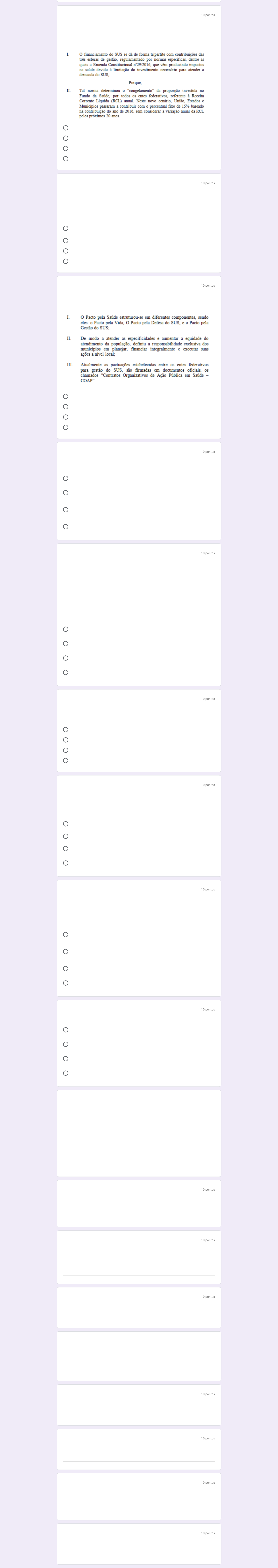 E-mail * 10 pontos A+rmações I e II estão corretas, mas a II não justi+ca corretamente a primeira; Apenas a a+rmação I está correta; Apenas a a+rmação II está correta. A+rmações I e II estão corretas, e a II justi+ca corretamente a primeira; 10 pontos Ações de assistência social e de pagamento de aposentadorias de servidores da saúde; Ações de manejo ambiental destinadas ao controle de vetores de doenças; Ações de vigilância à saúde em toda a sua abrangência de atuação; Ações relacionadas à produção, aquisição e distribuição de medicamentos; 10 pontos Apenas I e II estão corretas; Apenas II e III estão corretas; I, II e III estão corretas; Apenas I e III estão corretas; 10 pontos Alimentação e atualização bimestral da aplicação dos recursos pelos gestores nos sistemas de informação que compõem a base nacional de informações do SUS; Existência do Fundo da Saúde no qual são depositados recursos, e Conselhos de Saúde para monitoramente do repasse e uso dos recursos; Todas as a+rmações citadas, e também, a elaboração e apresentação dos Relatórios de Gestão, como forma de acompanhamento da execução do Plano de Saúde. De+nição das ações a serem executadas no Plano de Saúde e na Programação Anual de execução das ações e serviços de acordo com metas estabelecidas; 10 pontos De investimento ou estruturação, o qual também fornece recursos, aquisição de equipamentos voltados a realização de ações de saúde pública. De manutenção, o qual também fornece recursos para o pagamento e grati+cação de servidores ativos e inativos do setor de saúde e assistência social; De custeio, o qual também fornece recursos para a compra de medicamentos e insumos médicos e odontológicos; De investimento ou estruturação, o qual também fornece recursos para o pagamento de servidores inativos da saúde; 10 pontos A população cadastrada na APS/ESF, sua vulnerabilidade e per+l demográ+co; O número de equipes de saúde bucal cadastradas no município vinculadas às UBS; A cobertura de exames diagnósticos para infecções sexualmente transmissíveis; O alcance de metas sob indicadores como o acompanhamento de hipertensos; 10 pontos Atenção Básica, Média e Alta Complexidade da assistência, Vigilância em Saúde, Assistência Farmacêutica e Gestão do SUS Atenção de média complexidade, a atenção em saúde e os hospitais de ensino Atenção de baixa complexidade, gestão do SUS, os hospitais de ensino e os hospitais de pequeno porte. Atenção Básica, Média e Alta Complexidade da Assistência e Assistência Farmacêutica 10 pontos Municípios e Distrito Federal devem aplicar anualmente, no mínimo, 5% da arrecadação dos impostos em ações e serviços públicos de saúde. O valor total a ser repassado por município ou pelo Distrito Federal para o +nanciamento da APS dependerá, exclusivamente, da vulnerabilidade socioeconômica da população cadastrada. O Programa Previne Brasil estabelece o novo modelo de +nanciamento de custeio da Atenção Primária à Saúde no âmbito do Sistema Único de Saúde. As secretarias estaduais de saúde deverão repassar anualmente, no mínimo, 7% da arrecadação de impostos para +nanciar as ações e serviços públicos de saúde. 10 pontos pessoal, equipamentos, prestadores de serviços, serviços terceiros, materiais, obras e reformas. pessoal, equipamentos, serviços terceiros, materiais publicitários, materiais, obras e reformas. pessoal, prestadores de serviços, equipamentos, materiais, medicamentos, obras e reformas. pessoal, sistemas de informação, prestadores de serviços, serviços terceiros, obras e reformas. Há pouco mais de 30 anos de existência, o SUS têm enfrentado ao longo dos anos, diversos desafios frente ao seu financiamento apropriado. Devido a toda a sua abrangência e sua cobertura em âmbito nacional, bem como diante de todos os princípios e diretrizes que fundamentam o sistema, a disponibilidade de recursos financeiros suficientes é, sem sombra de dúvidas, fator determinante para garantia da oferta das ações e serviços e do acesso pela população usuária à uma atenção integral possibilitada em diferentes níveis de complexidade da assistência à saúde. A captação e repasse de recursos financeiros para a pasta da saúde são definidas por diferentes regulamentações, entretanto, experimentamos na realidade e rotina dos serviços, o desejo fundamentado na necessidade explícita, de uma ampliação efetiva na oferta de tais investimentos. 10 pontos 10 pontos 10 pontos O financiamento do SUS está previsto na Constituição e teve sua regulamentação nas Leis Orgânicas da Saúde, as quais reúnem as leis federais 8.080 e 8.142, de 1990. A Emenda Constitucional 29/2000, marco histórico do financiamento da saúde, ratificou a vinculação de recursos financeiros da seguridade social, definindo percentuais mínimos de investimento e que são necessários para o seu funcionamento. 10 pontos 10 pontos 10 pontos 10 pontos Nunca envie senhas pelo Formulários Google. Este formulário foi criado em Uninove. Does this form look suspicious? Relatório Forms treinamento - Financiamento do SUS Pacto pela Saúde parte 3 - Financiamento do SUS fernanda.alves.lima@uni9.edu.br Mudar de conta * Indica uma pergunta obrigatória Seu e-mail Ao longo dos anos, o financiamento do SUS passou por diversos processos regulatórios que preveem as proporções mínimas a serem investidas na saúde para subsidiar o sustento da execução das ações e serviços públicos em saúde. A respeito disso, analise as afirmações a seguir e escolha a alternativa correta: A Lei Complementar no 141 de 2012 esclareceu importantes dúvidas referente ao uso dos recursos destinados à saúde, ao definir as despesas a serem declaradas como “Ações e Serviços Públicos em Saúde – ASPS”, possibilitando melhor gestão financeira. Diante disso, não foram considera