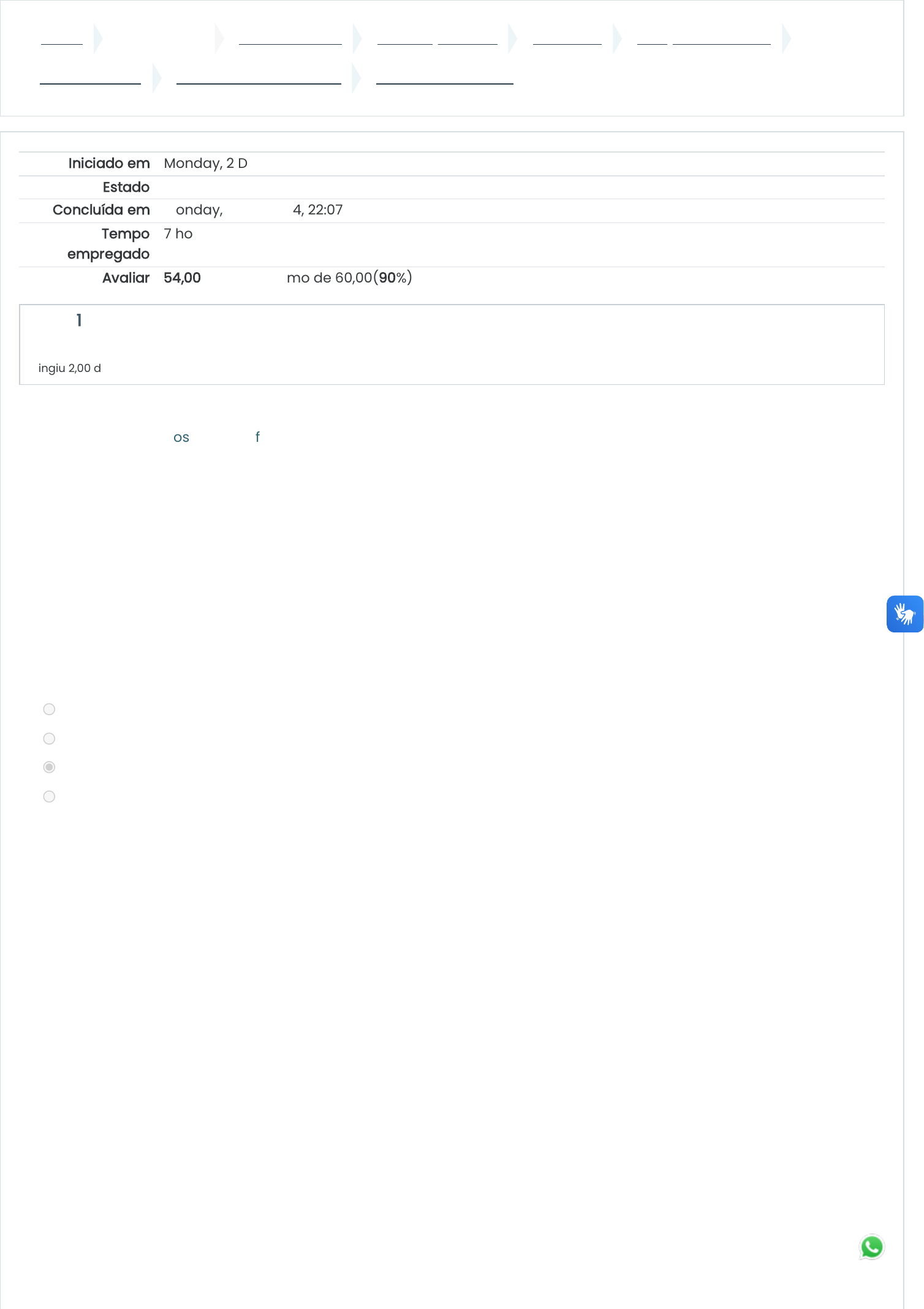 Painel Meus cursos CURSOS FUNEC Graduação - EAD Aluno EAD JUNÇÕES DE TURMA Estatística - Gr ATIVIDADES AVALIATIVAS PROVA - 60 PONTOS Iniciado em Monday, 2 Dec 2024, 14:49 Estado Finalizada Concluída em Monday, 2 Dec 2024, 22:07 Tempo empregado 7 horas 17 minutos Avaliar 54,00 de um máximo de 60,00(90%) Questão 1 Completo Atingiu 2,00 de 2,00 Abaixo apresentamos quatro informações, leia atentamente. I. Um gráfico de barras é aquele em que os retângulos que o compõem estão dispostos verticalmente e um gráfico de colunas, horizontalmente. II. Um gráfico de barras é aquele em que os retângulos que o compõem estão dispostos horizontalmente e um gráfico de colunas, verticalmente. III. Um gráfico de barras ou colunas é aquele em que os retângulos que o compõem estão dispostos horizontalmente IV. Um gráfico de barras ou colunas é aquele em que os retângulos que o compõem estão dispostos verticalmente. Sobre as informações acima, é correto afirmar: Escolha uma opção: a. As informações II e III estão corretas e a informação I incorreta. b. As informações I e III estão corretas e a informação IV, incorreta. c. As informações III e IV estão incorretas e a informação II, correta. d. As informações I e II estão incorretas e a informação IV, correta. 02/12/2024, 22:00 PROVA - 60 PONTOS https://ava.funec.br/mod/quiz/review.php?attempt=696822&cmid=4440 1/14 https://ava.funec.br/my/ https://ava.funec.br/course/index.php?categoryid=10 https://ava.funec.br/course/index.php?categoryid=17 https://ava.funec.br/course/index.php?categoryid=19 https://ava.funec.br/course/index.php?categoryid=77 https://ava.funec.br/course/view.php?id=485 https://ava.funec.br/course/view.php?id=485#section-6 https://ava.funec.br/mod/quiz/view.php?id=4440 Questão 2 Completo Atingiu 0,00 de 2,00 Questão 3 Completo Atingiu 2,00 de 2,00 Método Estatístico é o método que admite todas as causas presentes variando-as, dada a impossibilidade de manter as causas constantes, registrando estas variações e procurando determinar que influências cabem a cada uma delas. Para as afirmativas abaixo, leia atentamente. I. Na fase de Planejamento do Método Científico a preocupação maior está na escolha das perguntas, que, na medida do possível, devem ser fechadas. II. Coleta de dados é a fase operacional com o registro sistemático de dados, com um objetivo determinado. III. A primeira fase do trabalho estatístico consiste em uma definição ou formulação correta do problema a ser estudado. IV. A Crítica de dados interna acontece quando se procura por erros por parte do informante devido principalmente por distração ou má interpretação das perguntas que lhe foram feitas. Podemos afirmar que: Escolha uma opção: a. A afirmativa II é verdadeira e a afirmativa IV é falsa. b. As afirmativas II e III são falsas e a afirmativa I é verdadeira. c. A afirmativa I é falsa e a afirmativa III é verdadeira. d. As afirmativas I e IV são verdadeiras e as afirmativas II e III são falsas. Leia as afirmações a seguir: I. A Frequência absoluta corresponde à proporção do número de observações em uma determinada classe em relação ao total de observações que temos. II. Frequência Simples ou Absoluta são os valores que realmente representam o número de dados de cada classe. III. Frequência Relativa é a relação existente entre a frequência absoluta (ou simples) de classe e o número de observações da variável(total de observações). IV. A soma das frequências simples é igual ao número total dos dados da distribuição. Podemos afirmar que: Escolha uma opção: a. As afirmativas I e IV são verdadeiras e as afirmativas II e III são falsas. b. A afirmativa II é verdadeira e a afirmativa IV é falsa. c. As afirmativas II e III são falsas e a afirmativa I é verdadeira. d. A afirmativa I é falsa e a afirmativa III é verdadeira. 02/12/2024, 22:00 PROVA - 60 PONTOS https://ava.funec.br/mod/quiz/review.php?attempt=696822&cmid=4440 2/14 Questão 4 Completo Atingiu 2,00 de 2,00 Questão 5 Completo Atingiu 2,00 de 2,00 Questão 6 Completo Atingiu 2,00 de 2,00 Os gráficos estatísticos são indissociáveis de sua vida. A todo instante você se depara com gráficos e neles, muitas importantes informações você poderá obter, facilitando enormemente sua vida. Para que tenhamos uma boa representação gráfica os mesmos precisam ter como características principais: Escolha uma opção: a. Certeza, simplicidade e boa interpretação. b. Perfeição, simplicidade e clareza. c. Simplicidade, clareza e veracidade. d. Justificativa, concisão e precisão. Um gráfico estatístico se presta a: Escolha uma opção: a. Verificar as informações e facilitar suas aplicações. b. Visualizar as informações pertinentes a um determinado problema. c. Verificar os dados corretos de uma tabela. d. Visualizar a informação de maneira mais direta. Observe a tabela a seguir: É correto afirmar que a média aritmética, a moda e a mediana dos dados coletados são respectivamente: Escolha uma opção: a. 3,45; 6,21; 3,92. b. 6,35; 4,28; 5,31. c. 5,95; 3,52; 4,95. d. 4,75; 5,46; 6,12. 02/12/2024, 22:00 PROVA - 60 PONTOS https://ava.funec.br/mod/quiz/review.php?attempt=696822&cmid=4440 3/14 Questão 7 Completo Atingiu 2,00 de 2,00 Questão 8 Completo Atingiu 2,00 de 2,00 Leia atentamente as informações a seguir: I. Amostragem é o processo de coleta das informações de parte da população chamada a mostra, mediante métodos adequados de seleção destas unidades. II. Uma Amostra aleatória é constituída por elementos da população selecionados por um sistema preestabelecido. III. Dados Brutos são aqueles que ainda não foram numericamente organizados. IV. Censo é uma avaliação indireta de um parâmetro, com base em um estimador através de cálculos de probabilidades. Sobre as informações acima podemos afirmar que: Escolha uma opção: a. São corretas as afirmativas 