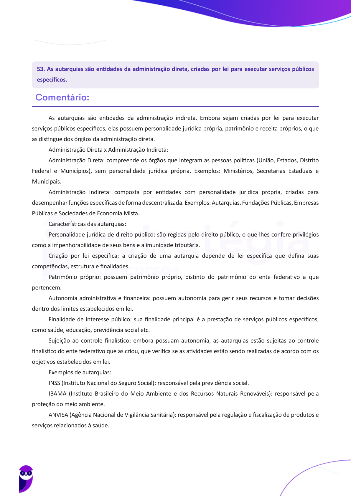 53. As autarquias são entidades da administração direta, criadas por lei para executar serviços públicos específicos. Comentário: As autarquias são entidades da administração indireta. Embora sejam criadas por lei para executar serviços públicos específicos, elas possuem personalidade jurídica própria, patrimônio e receita próprios, o que as distingue dos órgãos da administração direta. Administração Direta x Administração Indireta: Administração Direta: compreende os órgãos que integram as pessoas políticas (União, Estados, Distrito Federal e Municípios), sem personalidade jurídica própria. Exemplos: Ministérios, Secretarias Estaduais e Municipais. Administração Indireta: composta por entidades com personalidade jurídica própria, criadas para desempenhar funções específicas de forma descentralizada. Exemplos: Autarquias, Fundações Públicas, Empresas Públicas e Sociedades de Economia Mista. Características das autarquias: Personalidade jurídica de direito público: são regidas pelo direito público, o que lhes confere privilégios como a impenhorabilidade de seus bens e a imunidade tributária. Criação por lei específica: a criação de uma autarquia depende de lei específica que defina suas competências, estrutura e finalidades. Patrimônio próprio: possuem patrimônio próprio, distinto do patrimônio do ente federativo a que pertencem. Autonomia administrativa e financeira: possuem autonomia para gerir seus recursos e tomar decisões dentro dos limites estabelecidos em lei. Finalidade de interesse público: sua finalidade principal é a prestação de serviços públicos específicos, como saúde, educação, previdência social etc. Sujeição ao controle finalístico: embora possuam autonomia, as autarquias estão sujeitas ao controle finalístico do ente federativo que as criou, que verifica se as atividades estão sendo realizadas de acordo com os objetivos estabelecidos em lei. Exemplos de autarquias: INSS (Instituto Nacional do Seguro Social): responsável pela previdência social. IBAMA (Instituto Brasileiro do Meio Ambiente e dos Recursos Naturais Renováveis): responsável pela proteção do meio ambiente. ANVISA (Agência Nacional de Vigilância Sanitária): responsável pela regulação e fiscalização de produtos e serviços relacionados à saúde. Coordenação Pedagógica Aula 02 E-books Estratégicos - PCDF Administrativo www.estrategiaconcursos.com.br 02253235164 - Julia Gabryely