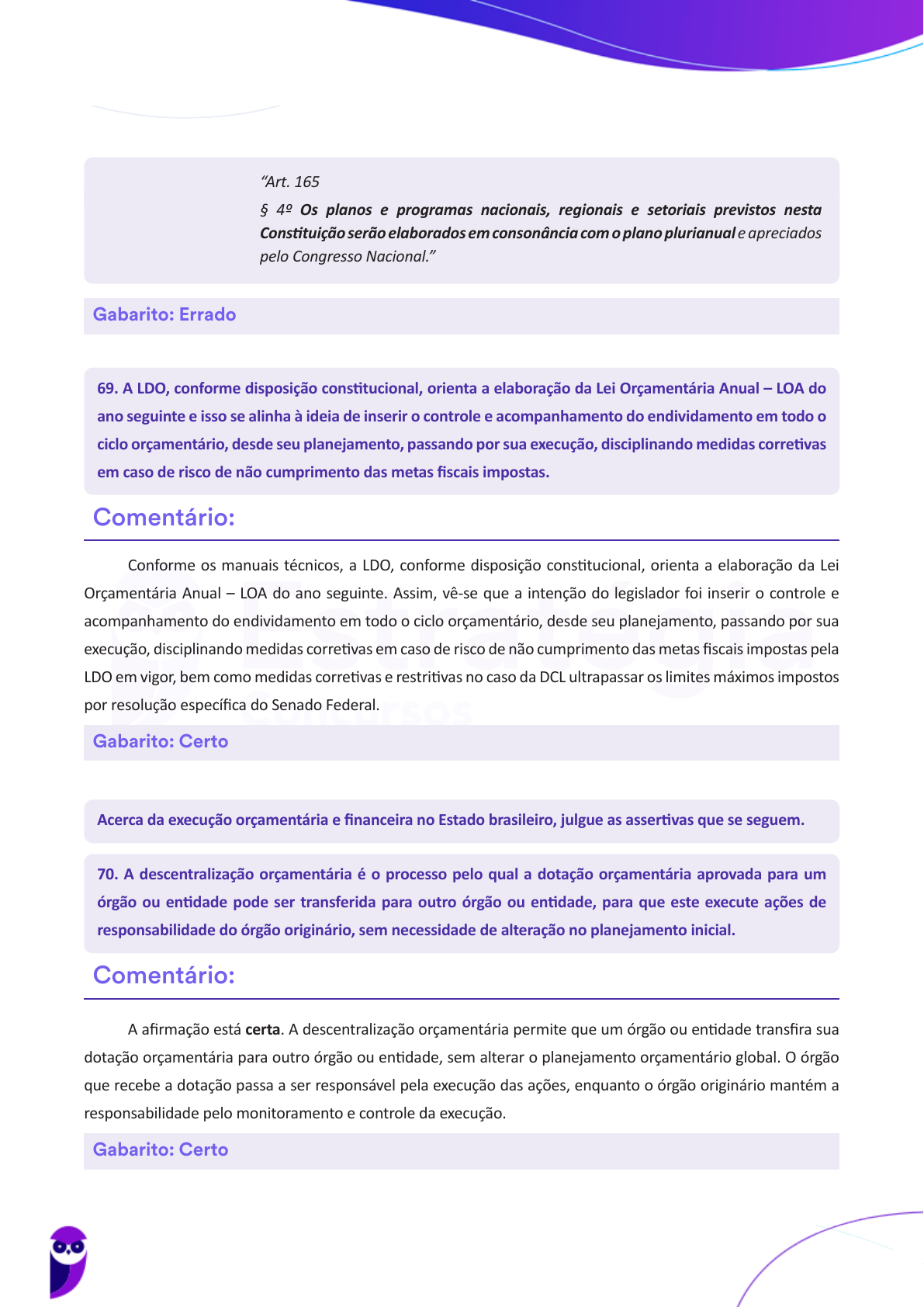 “Art. 165 § 4º Os planos e programas nacionais, regionais e setoriais previstos nesta Constituição serão elaborados em consonância com o plano plurianual e apreciados pelo Congresso Nacional.” Gabarito: Errado 69. A LDO, conforme disposição constitucional, orienta a elaboração da Lei Orçamentária Anual – LOA do ano seguinte e isso se alinha à ideia de inserir o controle e acompanhamento do endividamento em todo o ciclo orçamentário, desde seu planejamento, passando por sua execução, disciplinando medidas corretivas em caso de risco de não cumprimento das metas fiscais impostas. Comentário: Conforme os manuais técnicos, a LDO, conforme disposição constitucional, orienta a elaboração da Lei Orçamentária Anual – LOA do ano seguinte. Assim, vê-se que a intenção do legislador foi inserir o controle e acompanhamento do endividamento em todo o ciclo orçamentário, desde seu planejamento, passando por sua execução, disciplinando medidas corretivas em caso de risco de não cumprimento das metas fiscais impostas pela LDO em vigor, bem como medidas corretivas e restritivas no caso da DCL ultrapassar os limites máximos impostos por resolução específica do Senado Federal. Gabarito: Certo Acerca da execução orçamentária e financeira no Estado brasileiro, julgue as assertivas que se seguem. 70. A descentralização orçamentária é o processo pelo qual a dotação orçamentária aprovada para um órgão ou entidade pode ser transferida para outro órgão ou entidade, para que este execute ações de responsabilidade do órgão originário, sem necessidade de alteração no planejamento inicial. Comentário: A afirmação está certa. A descentralização orçamentária permite que um órgão ou entidade transfira sua dotação orçamentária para outro órgão ou entidade, sem alterar o planejamento orçamentário global. O órgão que recebe a dotação passa a ser responsável pela execução das ações, enquanto o órgão originário mantém a responsabilidade pelo monitoramento e controle da execução. Gabarito: Certo Coordenação Pedagógica Aula 02 E-books Estratégicos - PCDF Administrativo www.estrategiaconcursos.com.br 02253235164 - Julia Gabryely