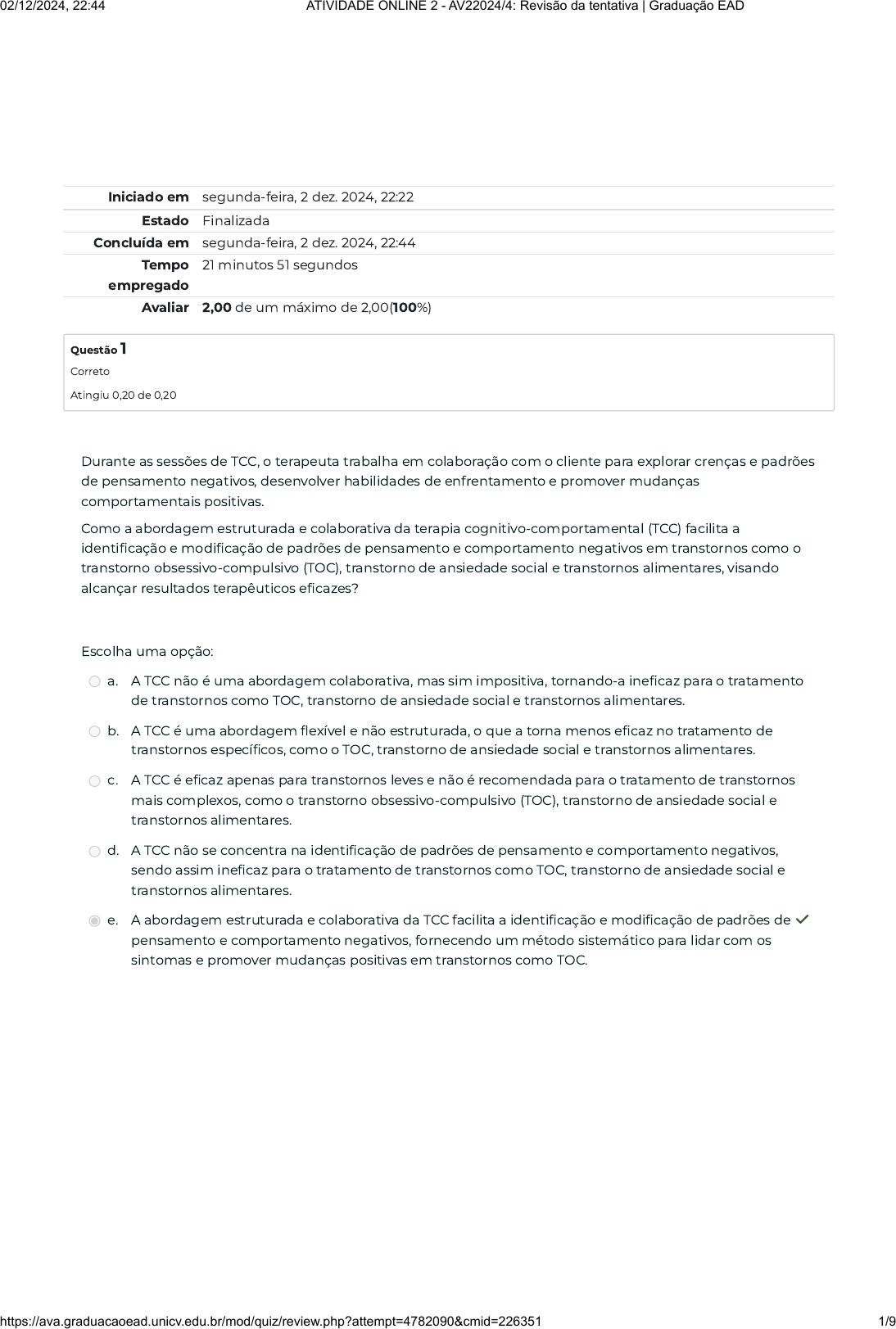 Iniciado em segunda-feira, 2 dez. 2024, 22:22 Estado Finalizada Concluída em segunda-feira, 2 dez. 2024, 22:44 Tempo empregado 21 minutos 51 segundos Avaliar 2,00 de um máximo de 2,00(100%) Questão 1 Correto Atingiu 0,20 de 0,20 Durante as sessões de TCC, o terapeuta trabalha em colaboração com o cliente para explorar crenças e padrões de pensamento negativos, desenvolver habilidades de enfrentamento e promover mudanças comportamentais positivas. Como a abordagem estruturada e colaborativa da terapia cognitivo-comportamental (TCC) facilita a identi�cação e modi�cação de padrões de pensamento e comportamento negativos em transtornos como o transtorno obsessivo-compulsivo (TOC), transtorno de ansiedade social e transtornos alimentares, visando alcançar resultados terapêuticos e�cazes? Escolha uma opção: a. A TCC não é uma abordagem colaborativa, mas sim impositiva, tornando-a ine�caz para o tratamento de transtornos como TOC, transtorno de ansiedade social e transtornos alimentares. b. A TCC é uma abordagem �exível e não estruturada, o que a torna menos e�caz no tratamento de transtornos especí�cos, como o TOC, transtorno de ansiedade social e transtornos alimentares. c. A TCC é e�caz apenas para transtornos leves e não é recomendada para o tratamento de transtornos mais complexos, como o transtorno obsessivo-compulsivo (TOC), transtorno de ansiedade social e transtornos alimentares. d. A TCC não se concentra na identi�cação de padrões de pensamento e comportamento negativos, sendo assim ine�caz para o tratamento de transtornos como TOC, transtorno de ansiedade social e transtornos alimentares. e. A abordagem estruturada e colaborativa da TCC facilita a identi�cação e modi�cação de padrões de pensamento e comportamento negativos, fornecendo um método sistemático para lidar com os sintomas e promover mudanças positivas em transtornos como TOC. ✓ 02/12/2024, 22:44 ATIVIDADE ONLINE 2 - AV22024/4: Revisão da tentativa | Graduação EAD https://ava.graduacaoead.unicv.edu.br/mod/quiz/review.php?attempt=4782090&cmid=226351 1/9 Questão 2 Correto Atingiu 0,20 de 0,20 A abordagem terapêutica para transtornos do neurodesenvolvimento é um campo vasto e dinâmico, que abrange uma variedade de técnicas e metodologias. Entre essas abordagens, destacam-se a terapia cognitivo- comportamental (TCC), a terapia comportamental dialética (DBT) e a análise do comportamento aplicada (ABA). Como a diversidade de abordagens terapêuticas, contribui para um tratamento mais abrangente e e�caz dos transtornos do neurodesenvolvimento? Escolha uma opção: a. Abordagens terapêuticas, como a terapia cognitivo-comportamental (TCC), a terapia comportamental dialética (DBT) e a análise do comportamento aplicada (ABA), permite que os pro�ssionais personalizem o tratamento de acordo com cada paciente. ✓ b. A terapia cognitivo-comportamental (TCC) é a única abordagem terapêutica e�caz para transtornos do neurodesenvolvimento, tornando as outras técnicas desnecessárias. c. A diversidade de abordagens terapêuticas pode di�cultar o tratamento dos transtornos do neurodesenvolvimento, pois os pro�ssionais podem �car sobrecarregados com opções e técnicas con�itantes. d. A diversidade de abordagens terapêuticas não tem impacto signi�cativo no tratamento dos transtornos do neurodesenvolvimento, pois todas as técnicas terapêuticas produzem resultados semelhantes. e. A diversidade de abordagens terapêuticas é irrelevante, pois o tratamento dos transtornos do neurodesenvolvimento depende exclusivamente de intervenções médicas e farmacológicas, não de técnicas psicoterapêuticas. 02/12/2024, 22:44 ATIVIDADE ONLINE 2 - AV22024/4: Revisão da tentativa | Graduação EAD https://ava.graduacaoead.unicv.edu.br/mod/quiz/review.php?attempt=4782090&cmid=226351 2/9 Questão 3 Correto Atingiu 0,20 de 0,20 Os antipsicóticos são medicamentos prescritos principalmente para o tratamento de transtornos psicóticos, como esquizofrenia e transtorno bipolar. Esses medicamentos atuam bloqueando os receptores de dopamina no cérebro, o que ajuda a reduzir sintomas como alucinações, delírios e pensamento desorganizado. As indicações para o uso de antipsicóticos podem incluir sintomas psicóticos agudos, mania ou episódios mistos no transtorno bipolar e comportamento agressivo ou agitação extrema. Como os antipsicóticos, ao bloquearem os receptores de dopamina no cérebro, são utilizados no tratamento de transtornos psicóticos, como esquizofrenia e transtorno bipolar, e de que forma os potenciais efeitos colaterais associados a esses medicamentos podem in�uenciar o manejo clínico e a adesão ao tratamento por parte dos pacientes? Escolha uma opção: a. Os antipsicóticos são prescritos apenas como tratamento de primeira linha para transtornos psicóticos, sendo evitados em outras condições de saúde mental devido aos seus potenciais efeitos colaterais signi�cativos. b. Os antipsicóticos não têm e�cácia comprovada no tratamento de transtornos psicóticos, sendo prescritos apenas para outros tipos de condições de saúde mental. c. Os antipsicóticos são amplamente utilizados no tratamento de transtornos psicóticos, como esquizofrenia e transtorno bipolar, devido à sua capacidade de bloquear os receptores de dopamina no cérebro. ✓ d. Os antipsicóticos são utilizados principalmente para tratar distúrbios de ansiedade leve, pois não afetam os receptores de dopamina no cérebro. e. Os antipsicóticos são e�cazes apenas no tratamento de sintomas psicóticos leves, não sendo recomendados para casos mais graves de transtornos psicóticos. 02/12/2024, 22:44 ATIVIDADE ONLINE 2 - AV22024/4: Revisão da tentativa | Graduação EAD https://ava.graduacaoead.unicv.edu.br/mod/quiz/review.php?attempt=4782090&cmid=226351 3/9 Questão 4 Correto Atingiu 0,20 de 0,20 Questão 5 Correto Atingiu 0,20 de 0,20 Estudos destacam a 