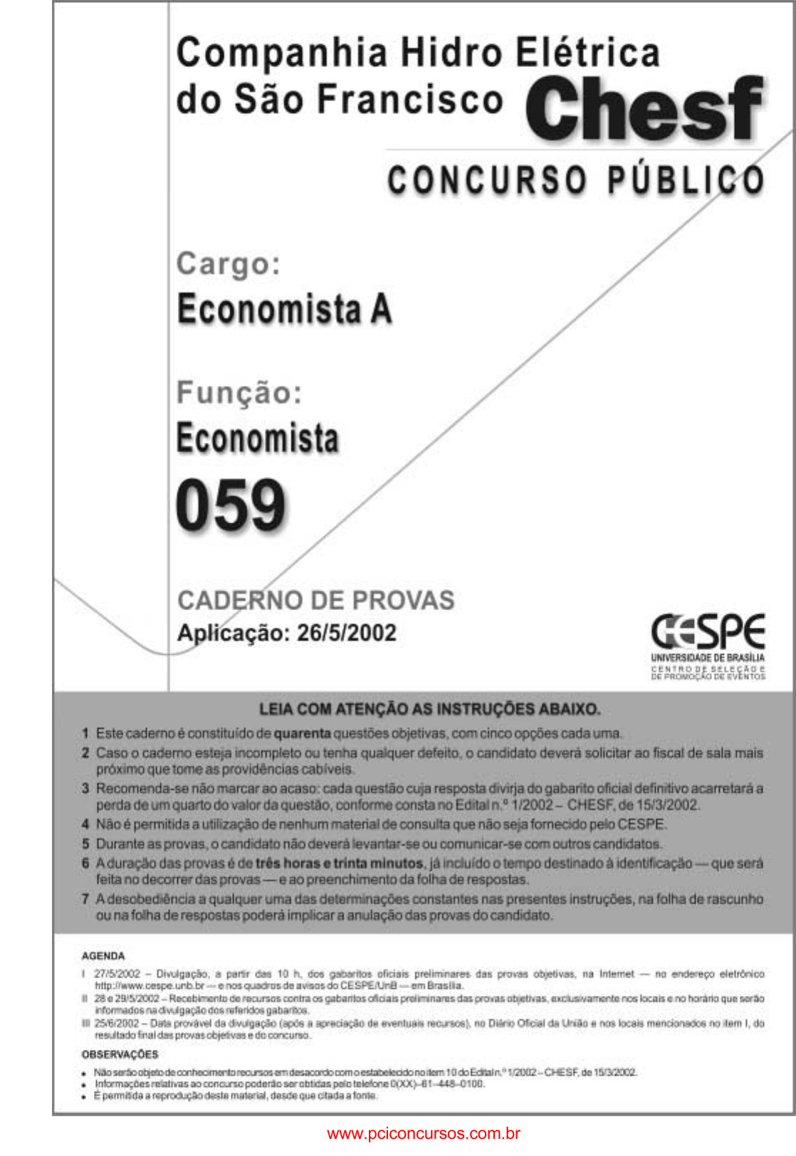 pcimarkpci MjgwNDowMDE4OjA4MDc6YThiNDoxNDQ3OmVjYjM6YjIzNTplZDAy:TW9uLCAwMiBEZWMgMjAyNCAyMzoyNTozOSAtMDMwMA== www.pciconcursos.com.brwww.pciconcursos.com.br pcimarkpci MjgwNDowMDE4OjA4MDc6YThiNDoxNDQ3OmVjYjM6YjIzNTplZDAy:TW9uLCAwMiBEZWMgMjAyNCAyMzoyNTozOSAtMDMwMA== www.pciconcursos.com.br UnB / CESPE – CHESF Concurso Público – Aplicação: 26/5/2002 Cargo: Economista A / Função: Economista – 1 / 14 É permitida a reprodução, desde que citada a fonte. Nas questões de 1 a 40, marque, em cada uma, a única opção correta, de acordo com o respectivo comando. Na folha de respostas, a indicação do campo SR é facultativa e não contará para efeito de avaliação; servirá somente para caracterizar que o candidato desconhece a resposta correta. Use a folha de rascunho para as devidas marcações e, posteriormente, a folha de respostas. LÍNGUA PORTUGUESA Texto LP-I – questões 1 e 2 Os mais bem preparados A Internet surgiu na década de 90, prometendo rever os valores do capitalismo e até mesmo modificar as relações entre as1 pessoas, que iriam comunicar-se mais por meio de chats e e-mails que pessoalmente. Empresas chamadas pontocom viram, da noite para o dia, suas ações valorizadas às alturas, mesmo sem possuir ativo algum além daquele velho computador. O ápice da euforia ocorreu em 1999, quando o índice NASDAQ, que mede a cotação das companhias de alta tecnologia no mundo, deu um salto de4 86%. Em abril do ano seguinte, deu-se o turbilhão. O NASDAQ caiu 25% em uma semana, e o fabuloso mundo virtual começou a trincar. No Brasil, os reflexos foram prejuízos e cortes nos investimentos das empresas do setor. Todas enxugaram seus custos7 e muitas fecharam as portas. Esse período de exuberância irracional, no entanto, fez nascer uma importante estrutura de Internet em diversos países do mundo, entre os quais o Brasil, cuja qualidade e tamanho eram desconhecidos até agora. Nos próximos dias, o Grupo de Tecnologia da Informação da Universidade Harvard, nos Estados Unidos da América (EUA), deve divulgar uma10 pesquisa, avaliando o grau de prontidão para a economia virtual de 75 países. A pesquisa, coordenada pelo economista Jeffrey Sachs, levou em conta dez indicadores. Os países receberam notas individuais em cada um dos itens, depois misturados em uma tabela final.13 Luís Henrique Amaral. Internet. In: Veja online, 3/4/2002. Internet: (com adaptações). QUESTÃO 1 Considerando que cada opção abaixo contém uma paráfrase das idéias essenciais da passagem indicada do texto LP-I, assinale a opção correta com relação à manutenção do sentido original. A “A Internet (...) pessoalmente” (R.1-2) – A Internet, que surgiu na década de 90, prometia uma revisão dos valores do capitalismo e uma modificação das relações interpessoais, as quais se iriam dar menos pessoalmente que por meio de chats e de e-mails. B “Empresas (...) salto de 86%” (R.2-5) – Empresas com a extensão de ponto.com tiveram a visão, da noite para o dia, quando o índice NASDAQ, deu um salto de 86%, além da supervalorização de suas ações valorizadas às alturas, mesmo possuindo ativo aquém do previsto e necessário: daquele velho computador. C “Em abril (...) as portas” (R.6-8) – Em abril de 2000, ocorre o turbilhão NASDAQ, cuja queda de 25% em uma semana levou o fabuloso mundo virtual a trincar, no Brasil, com reflexos, prejuízos e cortes nos investimentos das empresas, pelo enxugamento de seus custos e muitos fechamento de portas. D “Esse período (...) 75 países” (R.8-11) – O período de grande irracionalidade, que foi de 1999 a 2001, fez surgir no Brasil e no mundo a Internet, desconhecida até então, o que deflagrou a pesquisa do setor de Informação da Universidade Harvard, cuja divulgação pôs em alerta a economia de 75 países. E “A pesquisa (...) tabela final” (R.11-13) – A pesquisa descrita sob a forma gráfica, coordenada pelo economista Sachs, levou em conta indicadores de dez países, os quais receberam notas individuais em cada um dos itens, cujos valores foram depois misturados em uma tabela. QUESTÃO 2 Com relação à significação literal, ao arranjo contextual dos vocábulos e à tipologia textual do texto LP-I, assinale a opção incorreta. A Em nenhum trecho do texto, o autor manifesta seu ponto de vista, argumentando favorável ou desfavoravelmente aos fatos apresentados, ou emitindo opinião pessoal. B O texto inicia-se com uma passagem narrativa, o que pode ser confirmado pela situação dos fatos na linha cronológica crescente. C O segundo período do texto é essencialmente descritivo, construído a partir de substantivos comuns relacionados a verbos sem idéia de movimento. D A passagem situada nas linhas de 7 a 9, quando focaliza o problema no Brasil, é predominantemente dissertativa, porque apresenta as repercussões, em solo nacional, dos problemas do exterior. E A partir da linha 9, o autor, adotando as características valorizadas em um discurso técnico e analítico, relata os fatos de forma impessoal, objetiva e clara. www.pciconcursos.com.br pcimarkpci MjgwNDowMDE4OjA4MDc6YThiNDoxNDQ3OmVjYjM6YjIzNTplZDAy:TW9uLCAwMiBEZWMgMjAyNCAyMzoyNTozOSAtMDMwMA== www.pciconcursos.com.br UnB / CESPE – CHESF Concurso Público – Aplicação: 26/5/2002 Cargo: Economista A / Função: Economista – 2 / 14 É permitida a reprodução, desde que citada a fonte. Quadro I Quadro II Texto LP-II – questões 3 e 4 Idem, ibidem. QUESTÃO 3 Considerando a hipótese de o texto LP-II ser reorganizado com todos os países do quadro I listados em ordem alfabética, incluindo aqueles sem classificação e aos quais o Brasil é comparado, assinale a opção incorreta quanto ao sentido e à grafia. A O último país a ser referido seria o Uruguai. B O Brasil estaria entre Áustria e Cingapura. C A nova ordenação colocaria o ocupante da terceira posição antes do que está em décimo lugar e o sexto país, antes do segundo men