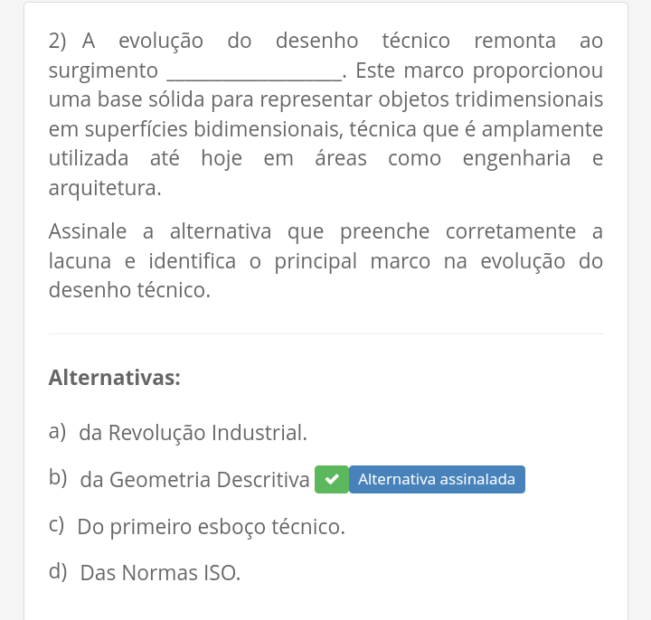 2) A evolução do desenho técnico remonta ao surgimento Este marco proporcionou uma base sólida para representar objetos tridimensionais em superfícies bidimensionais, técnica que é amplamente utilizada até hoje em áreas como engenharia e arquitetura. Assinale a alternativa que preenche corretamente a lacuna e identifica o principal marco na evolução do desenho técnico. Alternativas: a) da Revolução Industrial. b) da Geometria Descritiva Alternativa assinalada c) Do primeiro esboço técnico. d) Das Normas ISO.