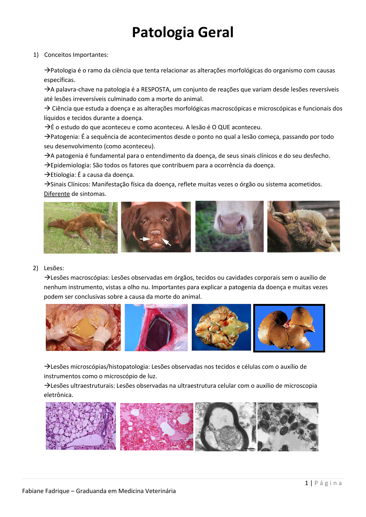1 | P á g i n a Fabiane Fadrique – Graduanda em Medicina Veterinária Patologia Geral 1) Conceitos Importantes: Patologia é o ramo da ciência que tenta relacionar as alterações morfológicas do organismo com causas específicas. A palavra-chave na patologia é a RESPOSTA, um conjunto de reações que variam desde lesões reversíveis até lesões irreversíveis culminado com a morte do animal. Ciência que estuda a doença e as alterações morfológicas macroscópicas e microscópicas e funcionais dos líquidos e tecidos durante a doença. É o estudo do que aconteceu e como aconteceu. A lesão é O QUE aconteceu. Patogenia: É a sequência de acontecimentos desde o ponto no qual a lesão começa, passando por todo seu desenvolvimento (como aconteceu). A patogenia é fundamental para o entendimento da doença, de seus sinais clínicos e do seu desfecho. Epidemiologia: São todos os fatores que contribuem para a ocorrência da doença. Etiologia: É a causa da doença. Sinais Clínicos: Manifestação física da doença, reflete muitas vezes o órgão ou sistema acometidos. Diferente de sintomas. 2) Lesões: Lesões macroscópias: Lesões observadas em órgãos, tecidos ou cavidades corporais sem o auxílio de nenhum instrumento, vistas a olho nu. Importantes para explicar a patogenia da doença e muitas vezes podem ser conclusivas sobre a causa da morte do animal. Lesões microscópias/histopatologia: Lesões observadas nos tecidos e células com o auxílio de instrumentos como o microscópio de luz. Lesões ultraestruturais: Lesões observadas na ultraestrutura celular com o auxílio de microscopia eletrônica. 2 | P á g i n a Fabiane Fadrique – Graduanda em Medicina Veterinária 3) Diagnóstico: determinação do tipo de doença e/ou lesão e/ou agente etiológico que esta acometendo o animal. Tipos: Diagnóstico Clínico: Sinais clínicos. Diagnóstico Diferencial: Comparação com outras doenças. Diagnóstico Presuntivo: Presumir. Suspeita inicial, requer confirmação. Diagnóstico Morfológico: De acordo com a alteração vista/física. Diagnóstico Etiológico: É a causa (nome do agente). 4) Prognóstico: Desfecho da doença ou lesão após o estabelecimento do diagnóstico. Pode ser considerado: Favorável, Reservado ou Desfavorável. 5) Exame Post-mortem (necropsia): Método de inestimável valor e, ás vezes, o único para chegar-se ao diagnóstico das doenças em veterinária. Ela propicia um meio de correlacionar os sinais clínicos observados no animal doente com as lesões que não eram visíveis ou aparentes durante a vida, além de permitir ao clínico a confirmação ou não, do seu diagnóstico, revelando porque o tratamento funcionou ou não. Aprimora o conhecimento e as qualidades técnicas de diagnosticar e tratar doenças. Condições ideias para Necropsia: O melhor momento é logo após a morte do animal em razão das alterações pós-morte que mascaram, dificultam ou impossibilitam o diagnóstico em alguns casos. Nunca pensar em um diagnóstico pré-estabelecido que possa levar ao examinador a valorizar ou desprezar lesões. Técnicas de Necropsia: Técnica para carnívoros, ruminantes, equinos e suínos. Coleta e reserva de materiais: Fixadores; Refrigeração; Congelamento. Conhecer sobre a suspeita é fundamental para uma coleta adequada de material. O ideal é REALIZAR NECROPSIA COMPLETA E COLETAR MATERIAL DE TODOS OS TECIDOS E ÓRGÃOS. Alterações Pós-morte 1) Conceito: Alterações observadas num cadáver e que não tenham ocorrido no indivíduo vivo. 2) Importância: Diferenciar das lesões que o animal já apresentava Estimar a hora da morte 3) Classificação Alterações cadavéricas Abióticas: São aquelas que não modificam o cadáver no seu aspecto geral. Dividem-se em: - Mediatas ou Consecutivas: Autólise (destruição de um tecido por enzimas proteolíticas produzidas pelo próprio tecido. Quanto mais diferenciado o tecido, mais rápida é a autólise. Causa: Perda dos limites celulares e ausência de reações inflamatórias e a presença de hemólise). Ordem cronológica: 1. Livor mortis ou Hipostase Cadavérica: Se verifica manchas violáceas nos locais de declive. Duas a quatro horas após a morte. Diferenciar das hemorragias cutâneas. 3 | P á g i n a Fabiane Fadrique – Graduanda em Medicina Veterinária Parada da circulação Sangue não coagulado sofre ação da gravidade Sangue gradualmente vai para as áreas mais baixas Manchas hipostáticas 2. Algor mortis ou Frialdade Cadavérica: Resfriamento gradual do cadáver até alcançar a temperatura ambiente. Três a quatro horas após a morte, tendo como queda de temperatura a média de 1°C/hr. Influenciada pelo tipo de morte, por exemplo: tetanias elevam a temperatura corporal mesmo após a morte! Parada das funções vitais Evaporação nas superfícies corporais Resfriamento gradual 3. Rigor mortis ou Rigidez cadavérica: Perda de mobilidade das articulações. Duas a quatro horas após a morte, sendo influenciada pela causa mortis e o estado nutricional. Duração de 12 a 24 horas. Fase pré-rigor (Flacidez muscular): A reserva de glicogênio mantém o relaxamento muscular. A ausência de oxigenação provoca um aumento de ácido lático e uma diminuição do pH. Fase de rigor (Rigidez muscular): Acontece o esgotamento do glicogênio de reserva. A ausência de ATP leva a uma forte união entre actina e miosina. Fase de pós-rigor (Flacidez Muscular pós-rigor): Destruição da actina e miosina pelas enzimas proteolíticas, decorrentes dos processos de autólise e heterólise, ocorrendo assim o relaxamento dos músculos e das articulações. MorteAusência de CirculaçãoDiminuição do oxigênioFlacidez da musculatura pré- rigorAumento da Glicose anaeróbica /produção ATP pelo aumento do ácido lático e redução do pHDiminuição do glicogênio ligado a queda de ATPExaustão do ATP faz com que a actina fique fortemente aderida a miosinaRigor mortisDestruição das