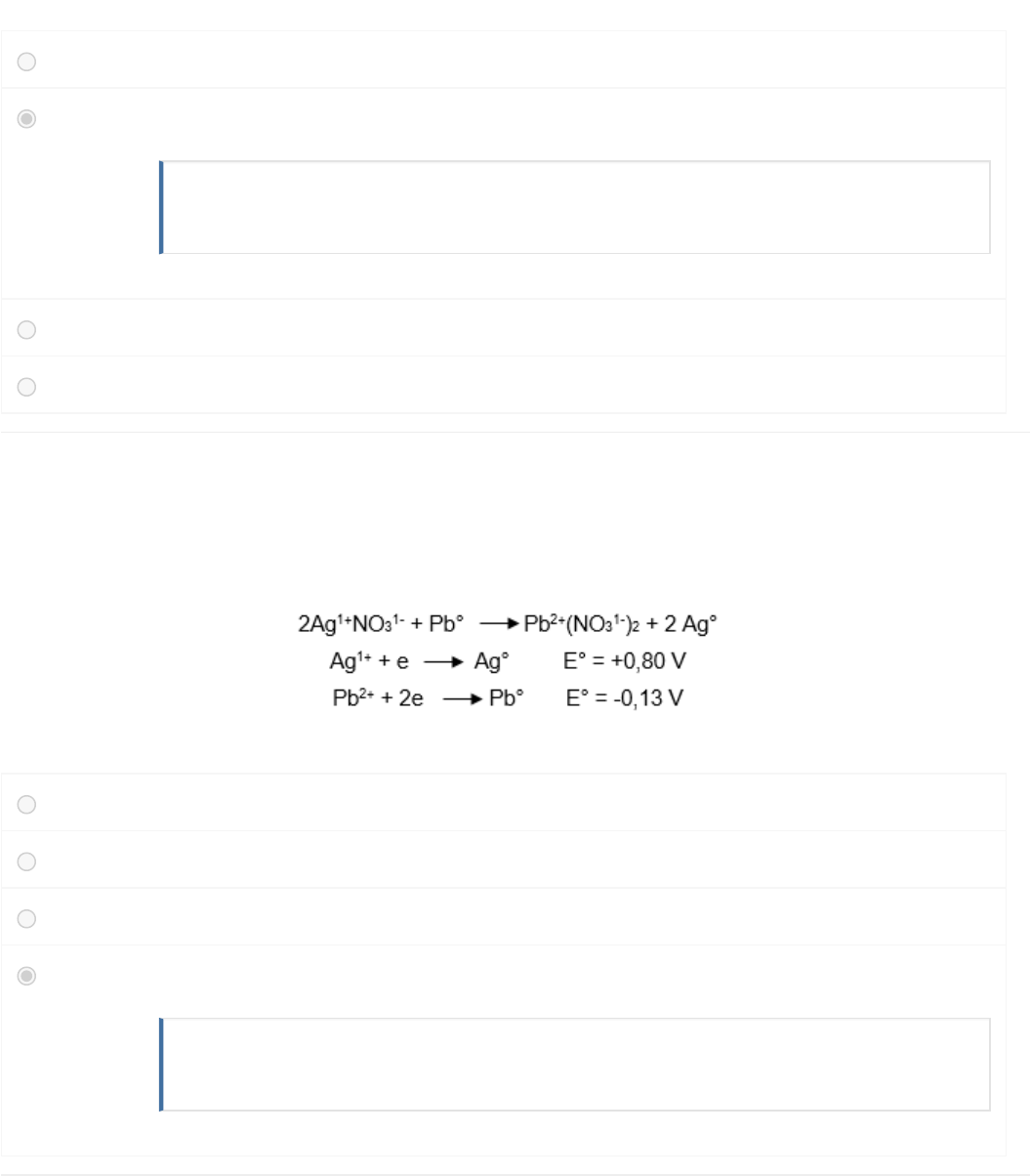 Ler em voz alta Ler em voz alta Ler em voz alta Questão 1/10 - Química Geral Reações químicas são as interações entre moléculas de substâncias químicas que tem como resultado a geração de outras substâncias. Assim, podemos ter reações químicas onde um reagente gera dois ou mais produtos. Como são chamadas estas reações? Nota: 10.0 A Reação de adição B Reação de decomposição Você assinalou essa alternativa (B) C Reação de deslocamento D Reação de precipitação Questão 2/10 - Química Geral Determinar o potencial padrão de uma célula eletroquímica contendo Chumbo metálico imerso em uma solução de Nitrato de Prata, tendo como dados a reação de oxirredução e os potenciais padrão das semi- reações de redução abaixo: Nota: 10.0 A E° = + 0,80 V B E° = - 0,13 V C E° = - 1,06 V D E° = + 0,93 V Você assinalou essa alternativa (D) Questão 3/10 - Química Geral A reação de oxirredução, também conhecida como reação redox, é na verdade uma interação entre duas reações concomitantes e dependentes uma da outra, que são a reação de oxidação e a reação de redução. A reação de oxidação é aquela na qual um elemento perde elétrons, adquirindo carga positiva se transformando em um cátion. A reação de redução é aquela na qual um elemento recebe elétrons, adquirindo carga negativa e se transformando em um ânion. Um elemento só oxida por que há outro elemento reduzindo Você acertou! ALTERNATIVA CORRETA (Conforme Aula 4, Tema 1) Você acertou! ALTERNATIVA CORRETA (Conforme Aula 5, Tema 3, Item 3.2) javascript:void(0) javascript:void(0) javascript:void(0) Ler em voz alta Ler em voz alta e só reduz porque há outro elemento oxidando. No caso do Alumínio, o óxido de Alumínio (Al O ) se adere firmemente na superfície do metal e não se desprende com tanta facilidade, assim óxido de alumínio forma uma camada protetora sobre a superfície da peça. Portanto, na reação de oxirredução envolvendo a produção do óxido de Alumínio: Nota: 10.0 A O Alumínio reduz e é agente oxidante do Oxigênio. B O Alumínio oxida e é agente redutor do Oxigênio. Você assinalou essa alternativa (B) C O Alumínio reduz e é agente redutor do Oxigênio. D O Alumínio oxida e é agente oxidante do Oxigênio. Questão 4/10 - Química Geral Em uma pilha galvânica, um eletrodo é cobre imerso em solução de Cu 1,0M e o outro é prata imerso em solução de Ag 1,0 M. Dados os potenciais-padrão de redução a 25°C para: Cu + 2e Cu° E = 0,34 V Ag + 1e Ag° E = 0,80 V O potencial padrão da célula para esta pilha é: Nota: 10.0 A 0,46 V Você assinalou essa alternativa (A) B 1,26 V C 1,94 V D 0,16 V Questão 5/10 - Química Geral Preencha as lacunas da seguinte tabela: 2 3 Você acertou! ALTERNATIVA CORRETA (Conforme Aula 5, Tema 1, Item 1.2.1) +2 +1 +2 → o +1 → o Você acertou! javascript:void(0) javascript:void(0) Ler em voz alta Lendo da esquerda para a direita, formar-se-á, com os números inseridos, a seguinte sequência numérica: Nota: 10.0 A 90, 142, 17, 36; Você assinalou essa alternativa (A) B 142, 90, 19, 36; C 142, 90, 36, 17; D 90, 142, 36, 17; Questão 6/10 - Química Geral O conceito do número de oxidação, de forma abreviada nox, foi desenvolvido para que se possa identificar facilmente a quantidade de elétrons perdidos pelo elemento que oxida ou a quantidade de elétrons recebidos pelo elemento que reduz em uma reação de oxirredução. Pode ser definido como a carga que um elemento adquire em uma reação de oxirredução, podendo ser uma carga real quando o elemento participante da reação for monoatômico, ou hipotética quando este elemento estiver presente em uma molécula de substância ou material. Assim, Para a molécula de Carbonato de Cálcio, qual será o NOX do Carbono (C)? Nota: 0.0 Você não pontuou essa questão A 0 B +2 Você acertou! A = Massa; Z = Número Atômico; n = número de nêutrons; e = número de elétrons. P = Z = e - P = 90 = e - e = 90 A = Z + n - 232 = 90 + n - n = 142 P = Z = e - P = 17 = e - e = 17 A = Z + n - A = 17 + 19 - A = 36 javascript:void(0) Ler em voz alta C +4 D +6 Você assinalou essa alternativa (D) Questão 7/10 - Química Geral (ENADE 2011) As reações químicas podem ser evidenciadas por aspectos visuais tais como a produção de gases, mudanças de cor e a formação de sólidos. Processos eletroquímicos podem ser caracterizados por essas evidências, como mostram as equações (i) e (ii). Ao se construir a seguinte célula galvânica será observado que a solução de íons ferro se tornará mais esverdeada e a solução de íons cobre se tornará mais azulada. Nessa situação, Nota: 10.0 A o fluxo de elétrons ocorrerá no sentido do eletrodo de ferro para o eletrodo de cobre. ALTERNATIVA CORRETA (Conforme Aula 5, Tema 1, Item 1.2.2) javascript:void(0) Ler em voz alta Ler em voz alta B o potencial de redução do Fe(III) é maior que o potencial de redução do Cu(II). Você assinalou essa alternativa (B) C o cátodo corresponde ao eletrodo de cobre. D ocorrerá a redução dos íons Cu(II). E ocorrerá a redução dos íons Fe(II). Questão 8/10 - Química Geral Uma reação química é o resultado da interação entre substâncias para gerar outras substâncias. As substâncias que reagem para formar outras substâncias são chamadas de Reagentes. As substâncias geradas são chamadas de Produtos. Assim, se reagirmos a substância A B com a substância C D para gerarmos E F e G H , como escreveremos a equação química? Nota: 10.0 A A B + C D E F + G H Você assinalou essa alternativa (A) B E F + G H A B + C D C A B + E F C D + G H D C D + E F A B + G H Questão 9/10 - Química Geral Você acertou! Aula 5 Se a solução de ferro está ficando esverdeada, a reação que é está ocorrendo é . Assim, o Fe(III) está sofrendo redução e este eletrodo é o cátodo. Se a solução de cobre está ficando azulada, a reação que está ocorrendo é Assim, 