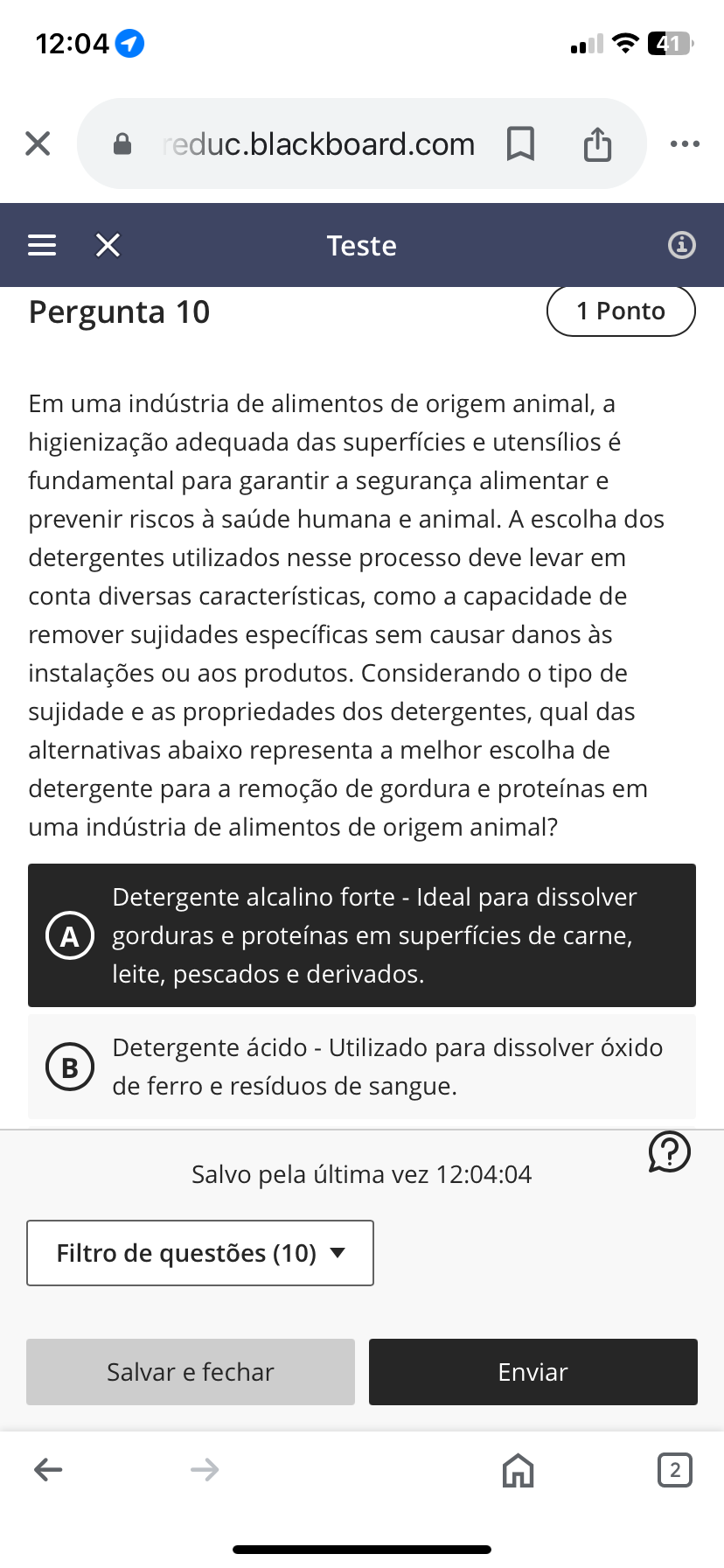 12:04 41 X reduc.blackboard.com X Teste i Pergunta 10 1 Ponto Em uma indústria de alimentos de origem animal, a higienização adequada das superfícies e utensílios é fundamental para garantir a segurança alimentar e prevenir riscos à saúde humana e animal. A escolha dos detergentes utilizados nesse processo deve levar em conta diversas características, como a capacidade de remover sujidades específicas sem causar danos às instalações ou aos produtos. Considerando o tipo de sujidade e as propriedades dos detergentes, qual das alternativas abaixo representa a melhor escolha de detergente para a remoção de gordura e proteínas em uma indústria de alimentos de origem animal? Detergente alcalino forte - Ideal para dissolver A gorduras e proteínas em superfícies de carne, leite, pescados e derivados. Detergente ácido - Utilizado para dissolver óxido B de ferro e resíduos de sangue. ? Salvo pela última vez 12:04:04 Filtro de questões (10) Salvar e fechar Enviar 2