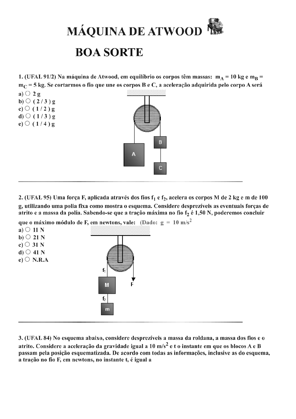 MÁQUINA DE ATWOOD É BOA SORTE 1. (UFAL 91/2) Na máquina de Atwood, em equilíbrio os corpos têm massas: m, =10 kg e mg = mç =5 kg. Se cortarmos o fio que une os corpos B e C, a aceleração adquirida pelo corpo A será a)O2g b)O (2/3)¢g O (1/2)¢g O (1/3)¢g O (1/4)g 2. (UFAL 95) Uma for¢a F, aplicada através dos fios f; e f;, acelera os corpos M de 2 kg e m de 100 g, utilizando uma polia fixa como mostra o esquema. Considere despreziveis as eventuais for¢as de atrito e a massa da polia. Sabendo-se que a tração maxima no fio f, é 1,50 N, poderemos concluir que o máximo médulo de F, em newtons, vale: (Dado: g = 10 m/s? a)O 11 N b) O 21N ¢)O 31 N d) O 41 N ¢) O N.RA 3. (UFAL 84) No esquema abaixo, considere despreziveis a massa da roldana, a massa dos fios e o atrito. Considere a aceleragiio da gravidade igual a 10 m/s? e t o instante em que os blocos A e B passam pela posição esquematizada. De acordo com todas as informacdes, inclusive as do esquema, a tração no fio F, em newtons, no instante t, ¢ igual a a) O 40 b) O 48 ¢) O 60 d) O 96 ¢ O 100 Fio inextensivele perfeitamente flexivel 4. (UFAL 94) A roldana fixa ideal, representada abaixo, encontra-se em equilibrio com os trés corpos suspensos. A aceleração local da gravidade é g. Retirando-se um dos corpos de massa m, o outro passara a subir com aceleração de médulo a) O 2g bDOg ¢)O g2 d O g/3 e O g4 5. (U.S. Judas Tadeu-SP) O dispositivo representado na figura é denominado “Maquina de Atwood”. A polia tem inércia de rotação desprezivel e os atritos não devem ser considerados. O fio é inextensivel e de massa desprezivel e, no local, a aceleração da gravidade tem médulo 10 m/sZ. A massa do corpo A é de 100 g e a massa do corpo B é de 50 g. Se, em determinado instante, a maquina é destravada, o médulo da aceleração de cada bloco é: a) O 30 m/s? b) O 10/3 m/s2. 0) O 40 m/s2. d) O 2/3 m/s?. ¢) O 400/3 m/s2.