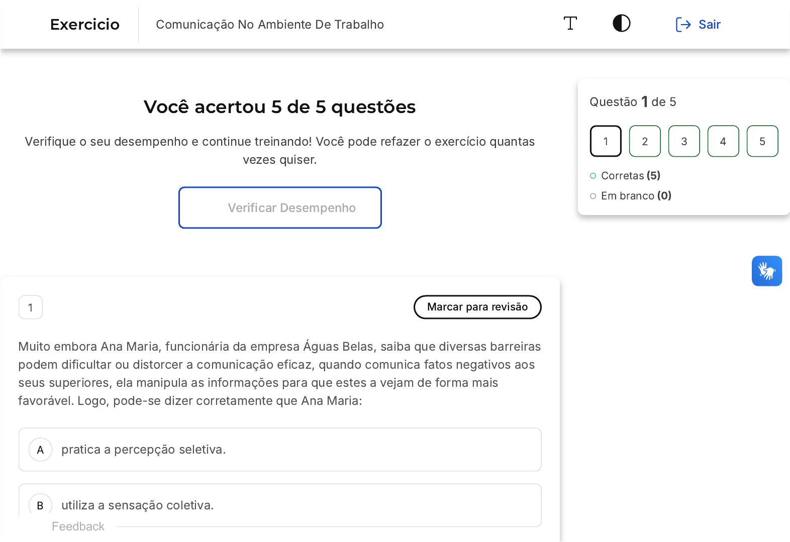 Você acertou 5 de 5 questões Verifique o seu desempenho e continue treinando! Você pode refazer o exercício quantas vezes quiser. Verificar Desempenho A B 1 Marcar para revisão Muito embora Ana Maria, funcionária da empresa Águas Belas, saiba que diversas barreiras podem dificultar ou distorcer a comunicação eficaz, quando comunica fatos negativos aos seus superiores, ela manipula as informações para que estes a vejam de forma mais favorável. Logo, pode-se dizer corretamente que Ana Maria: pratica a percepção seletiva. utiliza a sensação coletiva. Questão 1 de 5 Corretas �5� Em branco �0� 1 2 3 4 5 Exercicio Comunicação No Ambiente De Trabalho Sair Feedback C D E filtra o conteúdo da mensagem. escolhe os canais mais ricos para divulgar as informações. mantém a natureza da informação. Resposta correta Parabéns, você selecionou a alternativa correta. Confira o gabarito comentado! Gabarito Comentado Ana Maria "filtra o conteúdo da mensagem". A filtragem ocorre quando o emissor manipula a informação para que a mensagem chegue de forma mais favorável a quem a ouve, omitindo ou distorcendo partes da comunicação. Se alguém tem medo de dar notícias ruins ou quer agradar a todos, a tendência é filtrar seu conteúdo, comunicando sua parte favorável. 2 Marcar para revisão De acordo com Robbins �2010�� Rumores e fofocas são elementos bastante comuns nas organizações. Em épocas de crise, então, essas práticas tornam-se ainda mais utilizadas pelos apreensivos funcionários. O A B C D E medo das demissões, das reestruturações [...] leva-os a ficar extremamente preocupados e estressados [...]. Em decorrência desse clima de angústia, os rumores são criados e se espalham a uma velocidade impressionante. As redes de rumores: Embora façam parte da organização formal, não são consideradas como importante fonte de informação. São parte integrante de qualquer organização, logo, é importante manter os canais de comunicação abertos, explicando-se as decisões importantes pelos canais formais para que se reduza a ansiedade entre os empregados. Não são controladas pelos gestores, pois fazem parte do modelo de organização formal. Dessa forma, é importante retaliar o grupo que a mantém imediatamente. Mesmo que consideradas parte integrante da organização informal, não são amplamente utilizadas para servir aos interesses pessoais daqueles que a integram. São controladas pelos gestores porque integram o canal de comunicação formal de uma organização Resposta correta Parabéns, você selecionou a alternativa correta. Confira o gabarito comentado! Gabarito Comentado Segundo Robbins �2005�, a rede de rumores possui três características principais: 1� Não é controlada pela direção da empresa. 2� É percebida pela maioria dos funcionários como mais confiável e fidedigna do que os comunicados formais. 3� É amplamente utilizada para servir aos interesses pessoais dos que nela interagem. Portanto: A alternativa "Embora façam parte da organização formal, não são consideradas como importante fonte de informação" está incorreta, pois a rede de rumores é, de acordo com Robbins, uma fonte de informação relevante. A alternativa "Não são controladas pelos gestores, pois fazem parte do modelo de organização formal. Dessa forma, é importante retaliar o grupo que a mantém imediatamente" está incorreta, pois a rede de rumores, segundo Robbins, não deve ser retaliada. A alternativa "Mesmo que consideradas parte integrante da organização informal, não são amplamente utilizadas para servir aos interesses pessoais daqueles que a integram" está incorreta, pois a rede de rumores, segundo Robbins, é amplamente utilizada para servir aos interessos pessoais dos que nela interagem. A alternativa "São controladas pelos gestores porque integram o canal de comunicação formal de uma organização" está incorreta, pois a rede de rumores, segundo Robbins, não é controlada pelos gestores. Logo, a alternativa "São parte integrante de qualquer organização, logo, é importante manter os canais de comunicação abertos, explicando-se as decisões importantes pelos canais formais para que se reduza a ansiedade entre os empregados" é a A B C D E correta. Esta afirmação destaca a importância da comunicação clara e aberta para minimizar a ansiedade dos funcionários e, consequentemente, a disseminação de rumores. 3 Marcar para revisão Quando se comunica com as pessoas em seu trabalho, Maria seleciona e organiza o que ouve a partir dos seus padrões de referência. Logo, as suas influências sociais e culturais interferem na forma como se comunica, ocasionando uma barreira regularmente conhecida neste processo, que é a: Percepção seletiva Retroação. Mensagem. Comunicação descendente Comunicação ascendente. Resposta correta Parabéns, você selecionou a alternativa correta. Confira o gabarito comentado! Gabarito Comentado A alternativa correta é a Percepção Seletiva. Este termo se refere à tendência dos receptores de prestar mais atenção nas comunicações que consideram importantes, enquanto aquilo que classificam como desnecessário é ignorado ou "apagado" da memória. Este fenômeno também é conhecido como audição seletiva ou percepção seletiva, pois as pessoas tendem a ouvir apenas o que desejam ou consideram relevante. As influências sociais e culturais de um indivíduo desempenham um papel crucial na determinação do que é considerado importante para ele, influenciando assim a sua percepção seletiva. 4 Marcar para revisão São consideradas diretrizes para um feedback construtivo: I� Reformule a mensagem com suas próprias palavras para que a pessoa perceba que você ouviu e compreendeu o que foi dito; II� Relate a situação usando exemplos genéricos, culpando o outro pelo erro cometido; III� Não fale em seu próprio nome, só reproduza as críticas de outros. A B C D 