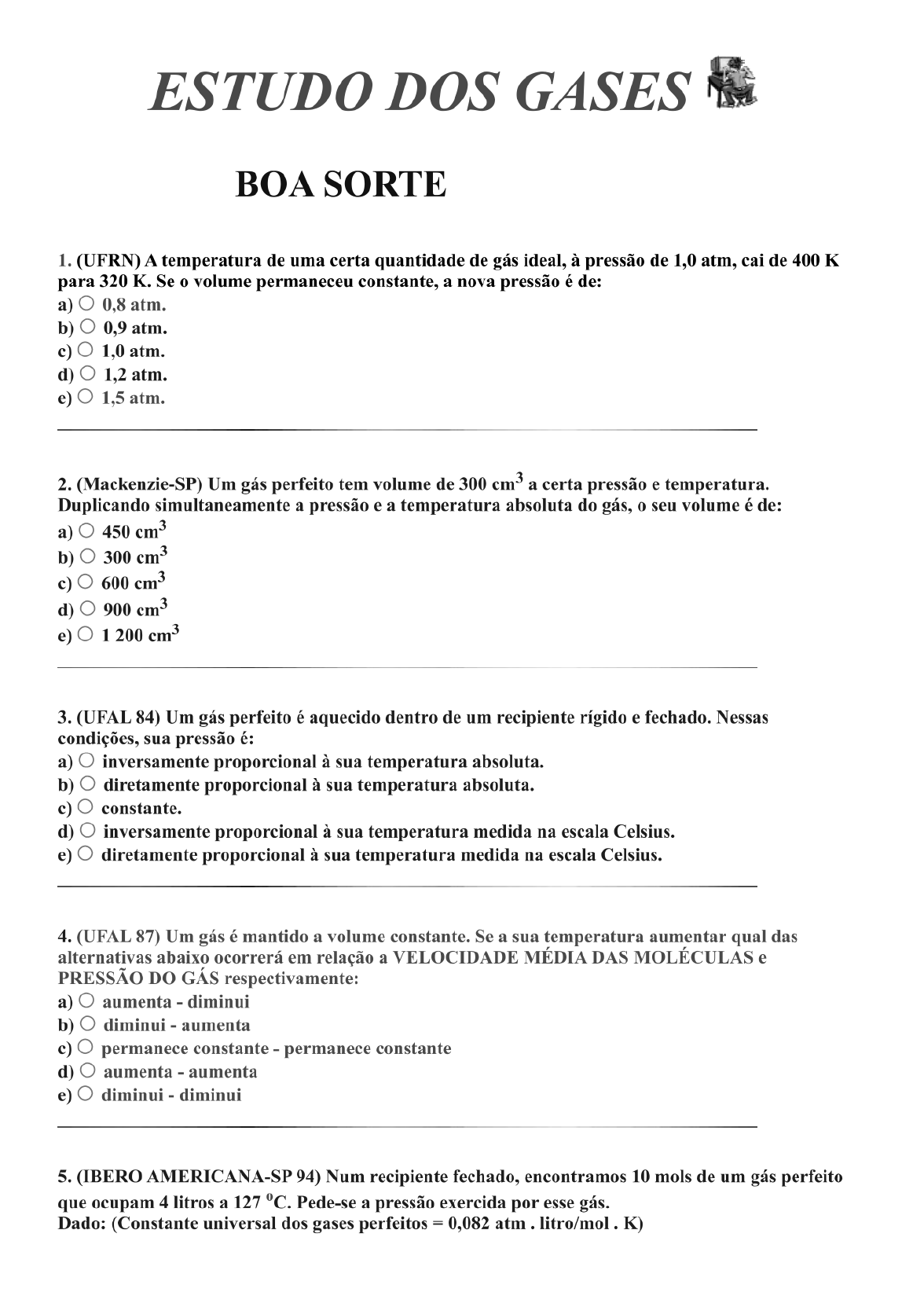 ESTUDO DOS GASES % BOA SORTE 1. (UFRN) A temperatura de uma certa quantidade de gas ideal, a pressão de 1,0 atm, cai de 400 K para 320 K. Se o volume permaneceu constante, a nova pressio é de: a) O 0,8 atm. b) O 0,9 atm. ¢) O 1,0 atm. d) O 1,2 atm. e) O 1,5 atm. 2. (Mackenzie-SP) Um gas perfeito tem volume de 300 emº a certa pressão e temperatura. Duplicando simultaneamente a pressão e a temperatura absoluta do gás, o seu volume é de: a) O 450 cmº? b) O 300 cm? ¢) O 600 em?ô d) O 900 cm® ¢) O 1200 cm? 3. (UFAL 84) Um gas perfeito é aquecido dentro de um recipiente rigido e fechado. Nessas condigdes, sua pressio é: a) O inversamente proporcional à sua temperatura absoluta. b) O diretamente proporcional a sua temperatura absoluta. ¢) O constante. d) O inversamente proporcional à sua temperatura medida na escala Celsius. ¢) O diretamente proporcional à sua temperatura medida na escala Celsius. 4. (UFAL 87) Um gás ¢ mantido a volume constante. Se a sua temperatura aumentar qual das alternat_ivas ahaixç ocorrerá em relação a VELOCIDADE MEDIA DAS MOLECULAS e PRESSAO DO GAS respectivamente: a) O aumenta - diminui b) O diminui - aumenta ¢) O permanece constante - permanece constante d) O aumenta - aumenta e) O diminui - diminui 5. IBERO AMERICANA-SP 94) Num recipiente fechado, encontramos 10 mols de um gás perfeito que ocupam 4 litros a 127 °C. Pede-se a pressio exercida por esse gás. Dado: (Constante universal dos gases perfeitos = 0,082 atm . litro/mol . K) a) O 1 atm b) O 82 atm ¢) O 41 atm d) O 10 atm e) O 100 atm 6. (FUMEC 94) Uma determinada massa de um gás ideal sofre uma transformacio isotérmica. Se a pressio final for o dobro da inicial, pode-se afirmar que: a) O todas as alternativas estão erradas b) O o volume permaneceu constante ¢) O a temperatura final é igual a duas vezes a temperatura inicial d) O o volume final é igual a duas vezes o volume inicial e) O o volume foi reduzido 2 metade 7. (UEL 91) As afirmativas abaixo referem-se a situações onde a temperatura é 0 °C e a pressio é 1,0 atm. I- Um mol de uma substincia sélida ocupa um volume igual a 22,4 litros. 11 - Um mol de uma substincia liquida ocupa um volume igual a 22,4 litros. 1T - Um mol de um gás perfeito ocupa um volume igual a 22,4 litros. Pode-se afirmar que somente: a) O III é correta. b) O II é correta. ¢) O I é correta. d) O Iellsio corretas. e) O Il e III são corretas. 8. (UFPB 94) Um mol de He e dois mols de Ar estão dentro de um recipiente cujo volume é 3 litros. A temperatura é 27 °C. Usando-se R = 0,008 atm . litros/mol . K, o valor da pressio sobre as paredes do recipiente é: a) O 0,8 atm b) O 1,2 atm ¢) O 2,4 atm d) O 1,6 atm e) O 3,0 atm 9. (U.F.Santa Maria-RS) Uma bolha de gás ideal, com volume V, é solta do fundo de um lago, onde a pressão é o dobro da pressio existente na superficie. Suponha a temperatura da água constante, a bolha chegari a superficie, com um volume: a)OVv/3 b)O V/2 ¢) O 2v dOoOv e)O3v/2 10. (UFAC) Assinale a que temperatura temos de elevar 400 ml de um gás ideal a 15 °C para que o seu volume atinja 500 ml, sob pressão constante. 2) O 25°C b) O 49 °C ¢ O 87°C d) O 69 °C ¢ O 110°C 11. (EEP) Um gás esta contido em um cilindro de volume V com pressio de 1 atm e temperatura de 25 °C. Esse cilindro possui uma vélvula de seguranca que libera o gás quando a pressio exerce 5 atm. Qual a temperatura máxima que esse gas pode ter sem que haja liberação ? 2)O 125°C b) O 25°C ¢) O 50°C d) O 200 °C ¢ O 1217°C 12. (PUC-SP) Sabe-se que um gás mantido num recipiente fechado exerce determinada pressio, consequente ao choque das moléculas gasosas contra as paredes do recipiente. Se diminuirmos o volume do recipiente e mantivermos constante a temperatura, a pressio do gas: a) O nio sofrer4 alteragdo. b) O diminuir4. ¢) O aumentara. d) O dependendo do gis, aumentara ou diminuira. e) O n.d.a. 13. (UNEB-BA) Em condig¢des tais que um gás se comporte como ideal, as variaveis de estado assumem os valores 300 K, 2 mº e 40000 Pa, num estado A. Sofrendo certa transformacio, o sistema chega ao estado B, em que os valores são 450 K, 3 mº e P. O valor de P, em pascal, é: a) O 13 000 b) O 40 000 ¢) O 27000 d) O 60 000 ¢) O 120 000 14. (PUC-MG) Um baldo meteorolégico foi inflado com hidrogénio, adquirindo um volume Vo, em um local onde a temperatura ambiente é 27 °C e a pressiio atmosférica, 1 atm. A certa altura em relação ao solo, verifica-se que o seu volume aumentou 20% do volume inicial Vo, e a temperatura alcangou -21 °C. Com base nesses dados, é possivel afirmar que a pressiio do ar, em atmosferas, naquela altitude, é igual a: a)O 0,8 b) O 04 ) O 0,6 d) O 05 e) O 0,7 15. (ITA - SP ) Determine a massa de gás hélio contida num balão, sabendo que seu peso molecular é igual a 4, R = 0,082 atm . litro/mol . K e que o gás ocupa um volume igual a 5 mº, numa temperatura de -23 °C e uma pressão de 30 cmHg. a)O 1,86g b) O 46g O % g d) O 390g e)O 186g 16. (Acafe-SC) Complete o enunciado com a alternativa verdadeira dentre as relacionadas a seguir. Afirma-se que moléculas de diferentes gases perfeitos, a mesma temperatura, têm em média a) O mesmo impulso. b) O mesma aceleração. ¢) O mesma energia cinética. d) O mesma quantidade de movimento. e) O mesma velocidade. 17. (UFU-MG) As grandezas que definem completamente o estado de um gas são: a) O temperatura, pressio e volume. b) O apenas volume e temperatura. ¢) O massa e volume. d) O somente pressão e volume. ¢) O massa, pressio, volume e temperatura. 18. (OSEC-SP) Volumes iguais de gases nas mesmas condições de temperatura e pressio: a) O possuem o mesmo potencial de ionização. b) O possuem a mesma densidade. ¢) O possuem a mesma massa. d) O contém o mesmo niimero de moléculas. ¢) O nenhuma resposta é correta. 19. (UEPG-PR) 2560 g de oxigénio, cuja molécula-grama é 32 g, ocupam 82 litros de volume num recipiente à temperatura de -23 °C. Se