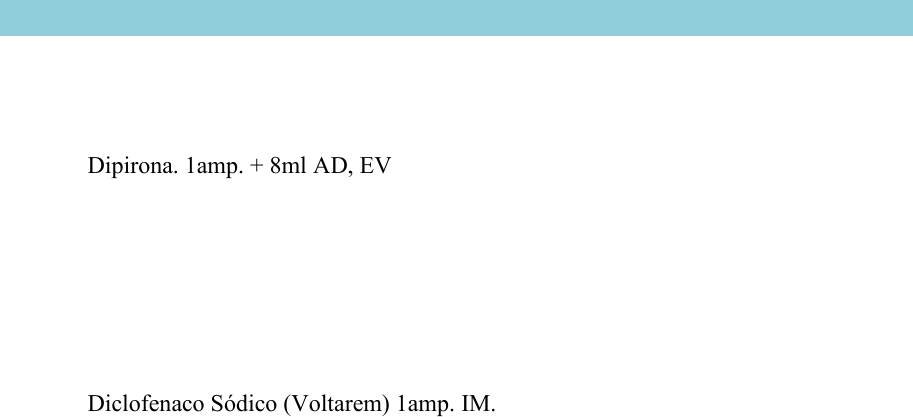 PRESCRIÇÕES ADULTOS 1)DOR INJETÁVEIS - Dipirona. 1amp. + 8ml AD, EV, de 6/6h se dor ou febre > 37,8ºC - Tramal 50mg e 100 mg1amp + 100ml SF 0,9%, EV, 8/8h - Morfina 1 amp (10 mg) + 10 ml de AD EV. Fazer 2 a 4 ml. - Dolantina 1 amp + 10 ml SF EV lento INTRAMUSCULAR - Diclofenaco Sódico (Voltarem) 1amp. IM. RECEITUÁRIO Dor em geral e antipirético. - Dipirona (Novalgina) 500mg ou 1g ________________1caixa Tomar 1 comprimido, VO, de 6/6h por 5-7 dias. - Paracetamol (Tylenol) 500 mg (Cefaléia) ou 750mg ___________1 caixa Tomar 1 comprimido, VO, de 6/6h por 5-7 dias (NA GRÁVIDA: 2X DIA, MÁXIMO) - Diclofenaco Sódico (Voltarem) 50mg _______________1 caixa Tomar 1 comprimido, VO, de 8/8h por 5-7 dias. Relaxantes Musculares - Carisoprodol, diclofenaco e paracetamol (Tandrilax ou Beserol 100 mg) _1 caixa Tomar 1 comprimido, VO, de 8/8h. - Cloridrato de Ciclobenzaprina (Musculare) 5mg _____________1 caixa Tomar 1 comprimido, VO, de 12/12h, por 10 dias - Musculare 10mg _______________1 caixa Tomar 1 comprimido, VO, 1x/dia, a noite. OBS: Miosan (Ciclobenzaprina) é semelhante ao Musculare, porém mais caro. Dor refratária a drogas normais - Paco 500mg/30mg (paracetamol + codeína) ________________________ 1 caixa Tomar 1 comprimido de 12/12h se dor Cólica Nefrítica: - Buscopan composto 1 comp 6/6h Seiji Hosoume 1 amp = 75mg Seiji Hosoume Seiji Hosoume Seiji Hosoume Dipirona pode diluir em 18ml - Diclofenaco de sódio 50mg 1 comp 8/8h - Cloridrato de Tramadol 50mg 1 comp 8/8h AINES 1ª GERAÇÃO - Nimesulida 100mg _______________1 caixa Tomar 1 comprimido, VO, de 12/12h por até 5 dias. - Ibuprofeno 200mg ou 400mg ____________1 caixa Tomar 1 comprimido, VO, de 12/12h,por 7 dias - Profenid 50mg _______________1 caixa Tomar 1 comprimido, VO, de 8/8h. - Profenid entérico 100mg ______________ 1 caixa (+caro) Tomar 1 comprimido, VO, de 12/12h. - Biprofenid150mg _________________ 1 caixa (forte) Tomar 1 comprimido, VO, 1x/dia. - Tilatil 20mg e 40mg _________________1 caixa Tomar 1 comprimido, VO, de 12/12h ou 1x/dia. - Aceclofenaco (Proflam) 100mg ____________1 caixa Tomar 1 comprimido, VO, 1x/dia ou 12/12h, por 7 a 10 dias. - Meloxicam 7,5mg e 15mg _____________1 caixa Tomar 1 comprimido, VO, 1x/dia 2ª GERAÇÃO Celebra 200mg ______________________1 caixa (forte e caro) Tomar 1 comprimido, VO, de 12/12h. 2) NÁUSEA E VÔMITO INJETÁVEL - Bromoprida (Plamet) 20mg. 1amp + 18ml AD, EV, de 8/8h. - Metoclopramida (Plasil)1amp, EV ou IM. (EV: 01 amp + 18 ml AD) PRESCRIÇÃO - Plasil ____________1 caixa Tomar 1comprimido,VO, de 8/8h, 10’ antes das refeições. - Dramin ou Dramin B6 (Dimenidrinato) _____________1 caixa Tomar 1 comprimido, VO, de 6/6h. 3) ANTIESPASMÓDICO INJETÁVEL - Buscopan 20mg. 1amp + 18 ml AD, EV, de 6/6h. PRESCRIÇÃO - Buscopan ________________ 1 caixa -Tomar 1 comprimido, VO, de 8/8h. - Buscopan Composto ________________ 1 caixa Tomar 1 comprimido, VO, de 8/8h. - Tropinal __________________1 caixa Tomar 1 comprimido, VO, de 8/8h. 4) ANTIHISTAMÍNICOS INJETÁVEL - Prometazina 1amp, IM. (FENERGAN) PRESCRIÇÃO - Cloridrato de Hidroxizina (Hixizine) 25mg _____________1 caixa Tomar 1 comprimido, VO, de 12/12h ou 1x/dia. - Loratadina 10mg (Claritin) ________________1 caixa Tomar 1 comprimido, VO, 1x/dia. - Prometazina (Fenergan) 25mg __________1 caixa Tomar 1 comprimido, VO, de 12/12h. - Cloridrato de Fexofenadina (Allegra) 60mg e 120mg ________1 caixa Tomar 1 comprimido, VO, de 12/12h para 60mg e 1x/dia para o de 120mg. - Desclorfeniramina (Polaramine) 2mg/5 ml ____________________1 caixa Tomar 1 comprimido , VO, 3 a 4 vezes ao dia ou 10 ml 12/12h 5) CALMANTES - Bromazepan (Lexotan) 3mg __________1 caixa Tomar 1 comprimido, VO, até 3x/dia. - Sintocalmy ___________1 caixa Tomar 1 comprimido, VO, 1x/dia por 10-15 dias. - Citalopram 20mg___________________... caixas Seiji Hosoume Tomar um comprimido ao dia, por 3 meses. - Diazepan 5mg 1 comp pela manhã (receita azul) + Amitriptilina 25mg 1 comp 8/8h 6) DIARRÉIA - Buscopan ou tropinal (vide antiespasmódico) - Florax________________ 1 caixa Tomar o conteúdo de 1flaconete, VO, de 12/12h ou 1x/dia, por 5 dias. - Floratil 100mg ou 200mg _________________1 caixa Tomar 1 cápsula, VO, de 12/12h se de 100mg e 1x/dia se de 200mg, por 5 dias. - Racecadotrila (Tiorfan) __________________1 caixa Tomar 1 comprimido, VO, na urgência e de 12/12h por até 5 dias. Com sinais de infecção: diarréia com muco, sangue, quadro de mal estar, febre, dor abdominal. Solicitar hemograma, leucócitos fecais e PPF - Bactrin (Sulfametoxazol 400mg + Trimetropin 80mg) Tomar 1 comprimido de 12/12h por 7 dias - Metronidazol 400mg Tomar 1 comprimido de 12/12h por 7 dias - Ciprofloxacina 500mg Tomar 1 comprimido de 12/12h por 7 dias 7) DESCONGESTIONANTE – SEMPRE ASSOCIAR COM AINES - Claritin D _______________1 caixa Tomar 1 comprimido, VO, de 12/12h. - Allegra D __________________1 caixa Tomar 1 comprimido, VO, de 12/12h. (caro) - Ebastina + cloridrato de pseudoefedrina (Ebastel D) ______________ 1 caixa Tomar 1 comprimido, VO, 1x/dia. 8) ANTITUSSÍGENO – TOSSE SECA/ MUCOLÍTICOS - Levodropoprizina (Antux) __________________1 frasco (Periférico) Tomar 7,5-10 ml de 8/8h. - Notuss _______________1 frasco (Central) Dar 15ml, VO, de 12/12h. - NAC (AIRES granulado) 600 mg ________________________1 pacote Dissolver o conteúdo de um envelope em um copo d’água, 1x ao dia 9) GASTROPROTETORES INJETÁVEIS - Ranitidina (Antak) 50mg. 1amp + 18 ml SF0,9%, EV, 12/12h. PRESCRIÇÃO - Omeprazol 20mg __________________1 caixa Tomar 1 comprimido, VO, 15’ antes do desjejum. - Hidróxido de Alumínio ____________________________1 frasco Tomar 10 ml, de 8/8h, 1 hora após as refeições TRATAMENTO DO H. PYLORI - Claritromicina 500mg 1 comp 12/12h 7 dias + - Amoxacilina 500mg 2 comp 12/12h 7 dias + - Omeprazol 40mg 1 comp 12/12h 7 dias (Continuar por mais 30 dias após o término) 10) BRONCOESPASMO - Aerossol: SF 0,9% 5mL Berotec (fenoterol) 10 gotas 3 nebulizações c