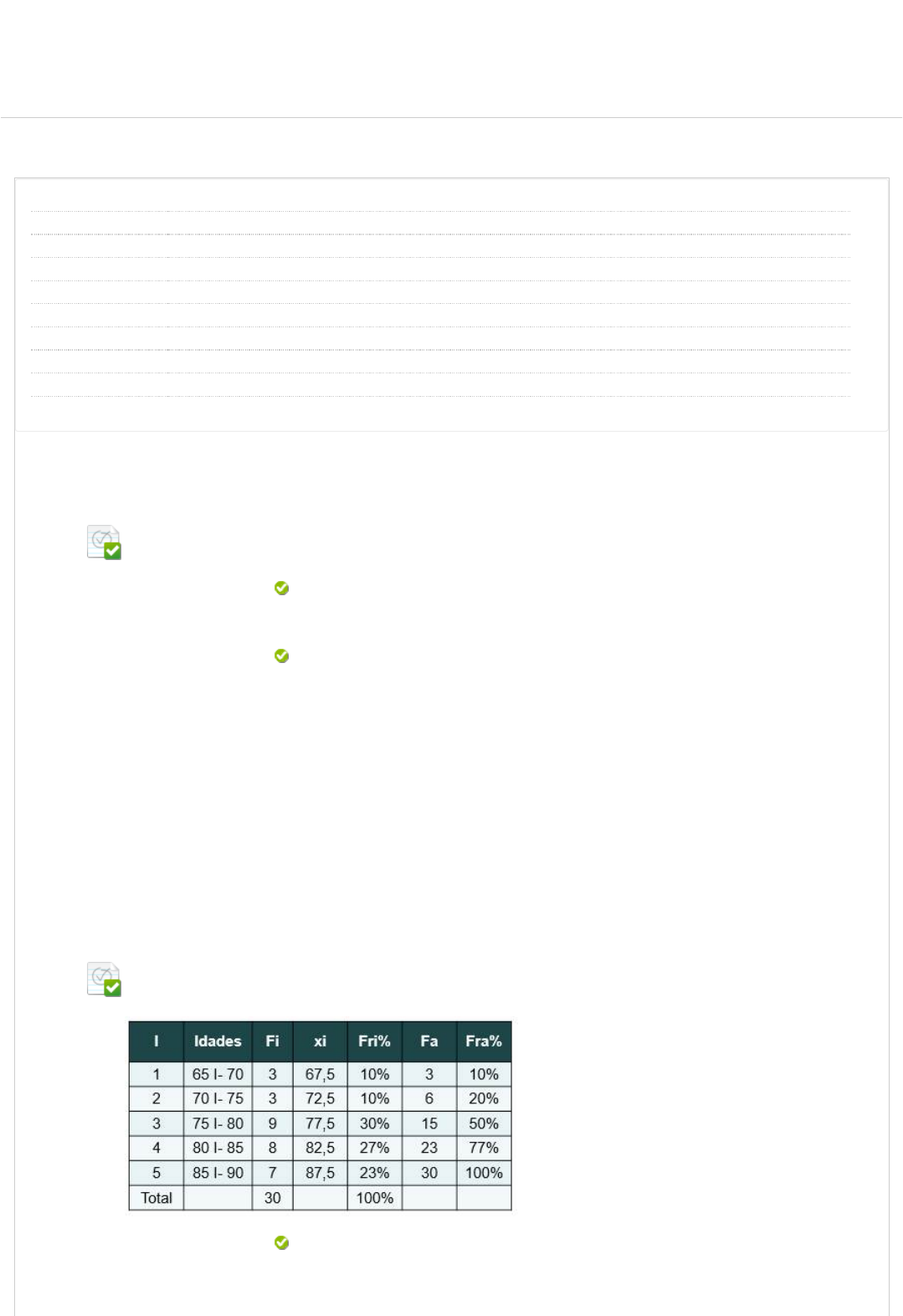 Revisar envio do teste: ATIVIDADE TELEAULA IBIOESTATISTICA APLICADA A SAUDE 7469-30_44701_R_F1_20242 CONTEÚDO Usuário MARIA ALEXSSANDRA DA SILVA Curso BIOESTATISTICA APLICADA A SAUDE Teste ATIVIDADE TELEAULA I Iniciado 13/09/24 20:49 Enviado 13/09/24 20:53 Status Completada Resultado da tentativa 0 em 0 pontos Tempo decorrido 3 minutos Autoteste O aluno responde e o resultado do aluno não é visível ao professor. Resultados exibidos Todas as respostas, Respostas enviadas, Respostas corretas, Comentários, Perguntas respondidas incorretamente Pergunta 1 Resposta Selecionada: b. Respostas: a. b. c. d. e. Comentário da resposta: O que representa uma coleção completa de todos os elementos a serem estudados que possuem uma característica em comum? População. Amostra. População. Amostragem. Estatística descritiva. Estatística indutiva. Resposta: b) Pergunta 2 Resposta Selecionada: d. Respostas: a. Com base na distribuição de frequências apresentada, qual o percentual de pessoas com idade maior ou igual a 80 anos e menor que 85? 27%. 82,5%. UNIP EAD BIBLIOTECAS MURAL DO ALUNO TUTORIAISCONTEÚDOS ACADÊMICOS 0 em 0 pontos 0 em 0 pontos 13/09/24, 20:58 Revisar envio do teste: ATIVIDADE TELEAULA I – ... https://ava.ead.unip.br/webapps/assessment/review/review.jsp?attempt_id=_107211332_1&course_id=_354404_1&content_id=_4030807_1&retu… 1/3 http://company.blackboard.com/ https://ava.ead.unip.br/webapps/blackboard/execute/courseMain?course_id=_354404_1 https://ava.ead.unip.br/webapps/blackboard/content/listContent.jsp?course_id=_354404_1&content_id=_4026990_1&mode=reset https://ava.ead.unip.br/webapps/portal/execute/tabs/tabAction?tab_tab_group_id=_10_1 https://ava.ead.unip.br/webapps/portal/execute/tabs/tabAction?tab_tab_group_id=_27_1 https://ava.ead.unip.br/webapps/portal/execute/tabs/tabAction?tab_tab_group_id=_47_1 https://ava.ead.unip.br/webapps/portal/execute/tabs/tabAction?tab_tab_group_id=_29_1 https://ava.ead.unip.br/webapps/portal/execute/tabs/tabAction?tab_tab_group_id=_25_1 https://ava.ead.unip.br/webapps/login/?action=logout b. c. d. e. Comentário da resposta: 23%. 8%. 27%. 77%. Resposta: d) Pergunta 3 Resposta Selecionada: c. Respostas: a. b. c. d. e. Comentário da resposta: Os pesos em kg dos pacientes que se consultaram em uma clínica na tarde de ontem estão apresentados abaixo. Determine qual é o peso mediano dos pacientes. 63 kg. 82 kg. 74 kg. 63 kg. 68 kg. 56 kg. Resposta: c) Pergunta 4 A tabela apresentada demonstra os dados de altura (em cm) dos funcionários de uma empresa. Determinar o valor modal da altura dos funcionários. 0 em 0 pontos 0 em 0 pontos 13/09/24, 20:58 Revisar envio do teste: ATIVIDADE TELEAULA I – ... https://ava.ead.unip.br/webapps/assessment/review/review.jsp?attempt_id=_107211332_1&course_id=_354404_1&content_id=_4030807_1&retu… 2/3 Sexta-feira, 13 de Setembro de 2024 20h53min31s BRT Resposta Selecionada: b. Respostas: a. b. c. d. e. Comentário da resposta: 172. 182. 172. 167. 160. Não há valor modal. Resposta: b) ← OK 13/09/24, 20:58 Revisar envio do teste: ATIVIDADE TELEAULA I – ... https://ava.ead.unip.br/webapps/assessment/review/review.jsp?attempt_id=_107211332_1&course_id=_354404_1&content_id=_4030807_1&retu… 3/3