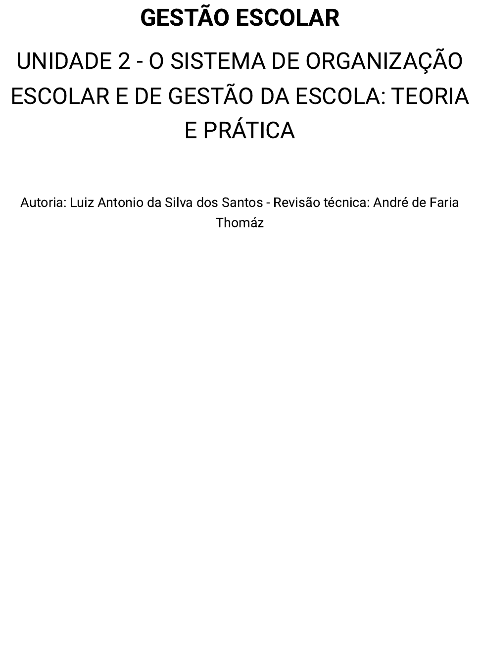 GESTÃO ESCOLAR UNIDADE 2 - O SISTEMA DE ORGANIZAÇÃO ESCOLAR E DE GESTÃO DA ESCOLA: TEORIA E PRÁTICA Autoria: Luiz Antonio da Silva dos Santos - Revisão técnica: André de Faria Thomáz Introdução Na unidade anterior, examinamos as concepções de gestão e seus reflexos administrativos para os ambientes escolares. Nesta unidade, daremos continuidade aos nossos estudos, mas enfatizando agora as práticas de organização e gestão escolar, bem como seus objetivos e formas de funcionamento. Você já percebeu que todas as ações humanas são guiadas por objetivos? Por isso, quando os conhecemos antecipadamente, podemos construir melhores soluções, pois temos maior clareza sobre os rumos planejados e, mesmo que modifiquemos as estratégias ao longo do percurso, teremos mais chances de alcança esses objetivos. No contexto escolar isso não é diferente. As finalidades e funções almejadas para a organização escolar antecedem as decisões que tomaremos sobre o ensino, as expectativas de aprendizagem, as práticas pedagógicas, as formas de organização, gestão etc. Nesse sentido, precisamos de um consenso mínimo sobre a função que a instituição chamada escola desempenha na sociedade e quais os meios e práticas que devem orientá-la para que o objetivo final seja alcançado. Você conhece os conceitos básicos de organização e práticas de gestão? Nesta unidade, iremos estudá- los visando à compreensão de como a estrutura organizacional atua a serviço da aprendizagem de professores e alunos. Por fim, aprofundaremos conceitos ligados ao eixo de gestão escolar nas instituições públicas e privadas, com vistas a um enfoque global entre planejamento, execução e avaliação. Bons estudos! 2.1 Funções e objetivos sociais da escola Ao longo da história, a escola foi objeto de inúmeras transformações, ou seja, ela nem sempre foi como a conhecemos hoje. Por isso, não podemos nos descuidar do fato de que a construção da escola moderna deve ser percebida enquanto um processo contínuo de transformação. A partir de uma perspectiva histórica, podemos considerar que as demandas derivadas da organização da sociedade capitalista trazem consigo a necessidade da escola, já que a inserção nos processos produtivos reclamava dos sujeitos o mínimo de escolarização. Isso ocorreu pois, com o avanço dos campos produtivos e das atividades de mercado, houve um deslocamento do eixo do modo de produção do campo para a cidade, isto é, da agricultura para a indústria, que deu origem ao modo de produção capitalista. Era preciso ensinar o sujeito trabalhador que surgia desse modelo, mas essa instrução não poderia ser universalizada e nem irrestrita, mas pautada tão somente pelas exigências instrucionais do sistema produtivo. Conforme elucida Saviani (1994, p. 160), a necessidade de generalização do saber e sua apropriação capitalista, com fins de educação massiva, gera uma contradição inerente à relação entre escola e capitalismo, pois no capitalismo o trabalhador não deve ser detentor do saber e dos meios de produção, mas ao mesmo tempo ele precisa dominar algum tipo de saber para transformar a matéria-prima em produto. Assim, segundo o autor, o ensino é ofertado “em ‘doses homeopáticas’, apenas aquele mínimo para poder operar a produção" (SAVIANI, 1994, p. 161). Com o desenvolvimento das máquinas e da sua inserção nos modelos produtivos, a função social da escola foi reduzida à preparação da mão de obra, pois ela assume como referencial “o modelo fabril da linha de montagem, com base na segmentação de tarefas e em uma relação hierárquica forte. Tais características ajudam a conferir ao trabalho dos alunos um caráter alienado” (CANARIO, 2006, p. 31). Ocorre, assim, uma divisão social entre o sujeito trabalhador e o trabalho que ele realiza, já que ele é detentor de um saber técnico e parcial. Nesse modelo, cabe ao gestor escolar administrar todos os processos, contando com o apoio de equipes específicas, baseando-se em desenhos de processos feitos para delinear as ações a serem executadas e os seus responsáveis. Para as atividades-fim, as ações são delimitadas no projeto pedagógico, nos planos de curso e de ensino, que também são coordenados pelo gestor escolar. Logo, reconhecemos que o momento histórico, político, social e econômico da sociedade afeta diretamente os modos de conceber a escola e as suas finalidades educativas. Na atualidade, pelo menos três correntes interpretativas vêm se destacando no meio educacional em relação às finalidades da escola: a corrente pragmática e imediatista dos organismos multilaterais, especialmente do banco mundial; a orientação sociológica/intercultural, pautada numa preocupação com a diversidade social e cultural; a orientação sócio-histórica-cultural, que defende a vinculação da formação cultural e científica dos sujeitos (LIBANEO, 2001), configurando um modelo formativo busca garantir que os estudantes tenham acesso aos códigos letrados e aos conhecimentos historicamente acumulados. As escolas têm a função social de formar os sujeitos históricos e prepará-los para o mundo do trabalho e para vida, contribuindo para a sua cidadania política e econômica. Para isso, as escolas precisam ser subsidiadas por procedimentos e meios organizacionais. 2.1.1 A escola constituída como instituição e organização Para avançarmos na compreensão sobre a organização e gestão da escola, é necessário estabelecer alguns aspectos fundamentais sobre os processos organizacionais com foco na prática da gestão escolar. • • • VOCÊ O CONHECE? José Carlos Libâneo é natural de Angatuba, cidade localizada no estado de São Paulo. É um renomado educador e um exímio escritor brasileiro, além de um expoente do campo educacional brasileiro pelas importantes contribuições teóricas que produz na área. Suas produções teóricas se debru