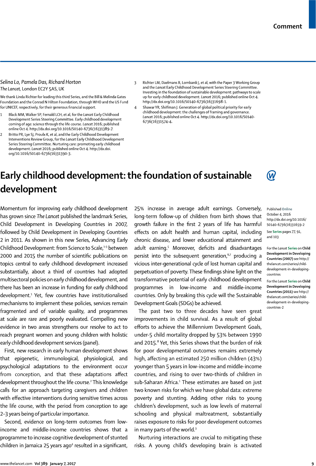 Comment Selina Lo, Pamela Das, Richard Horton 3 Richter LM, Daelmans B, Lombardi et al, with the Paper 3 Working Group The Lancet, London EC2Y 5AS, UK and the Lancet Early Childhood Development Series Steering Committee. Investing in the foundation of sustainable development: pathways to scale We thank Linda for leading this third Series, and the Bill & Melinda Gates up for early childhood development. Lancet 2016; published online Oct 4. Foundation and the Conrad N Hilton Foundation, through WHO and the US Fund http://dx.doi.org/10.1016/S0140-6736(16)31698- for UNICEF, respectively, for their generous financial support. 4 Shawar YR, Shiffman J. Generation of global political priority for early 1 Black MM, Walker SP, Fernald LCH, et al, for the Lancet Early Childhood childhood development: the challenges of framing and governance. Development Series Steering Committee. Early childhood development Lancet 2016; published online Oct 4. http://dx.doi.org/10.1016/S0140- coming of age: science through the life course. Lancet 2016; published 6736(16)31574-4. online Oct 4.http://dx.doi.org/10.1016/S0140-6736(16)31389-7 2 Britto PR, Lye SJ, Proulx K, et al, and the Early Childhood Development Interventions Review Group, for the Lancet Early Childhood Development Series Steering Committee. Nurturing care: promoting early childhood development. Lancet 2016; published online Oct 4. http://dx.doi. Early childhood development: the foundation of sustainable development Momentum for improving early childhood development 25% increase in average adult earnings. Conversely, Published Online has grown since The Lancet published the landmark Series, long-term follow-up of children from birth shows that October 4, 2016 http://dx.doi.org/10.1016/ Child Development in Developing Countries in 2007, growth failure in the first 2 years of life has harmful S0140-6736(16)31659-2 followed by Child Development in Developing Countries effects on adult health and human capital, including See Series pages 77, 91, and 103 2 in 2011. As shown in this new Series, Advancing Early chronic disease, and lower educational attainment and Childhood Development: from Science to Scale, 1-3 between adult earning. Moreover, deficits and disadvantages For the Lancet Series on Child 2000 and 2015 the number of scientific publications on persist into the subsequent producing a Development in Developing Countries (2007) see http:// topics central to early childhood development increased vicious inter-generational cycle of lost human capital and thelancet.com/series/child- substantially, about a third of countries had adopted perpetuation of poverty. These findings shine light on the development-in-developing- countries multisectoral policies on early childhood development, and transformative potential of early childhood development For the Lancet Series on Child there has been an increase in funding for early childhood programmes in low-income and middle-income Development in Developing Countries (2011) see http:// development. Yet, few countries have institutionalised countries. Only by breaking this cycle will the Sustainable thelancet.com/series/child- mechanisms to implement these policies, services remain Development Goals (SDGs) be achieved. development-in-developing- countries-2 fragmented and of variable quality, and programmes The past two to three decades have seen great at scale are rare and poorly evaluated. Compelling new improvements in child survival. As a result of global evidence in two areas strengthens our resolve to act to efforts to achieve the Millennium Development Goals, reach pregnant women and young children with holistic under-5 child mortality dropped by 53% between 1990 early childhood development services (panel). and 2015. Yet, this Series shows that the burden of risk First, new research in early human development shows for poor developmental outcomes remains extremely that epigenetic, immunological, physiological, and high, affecting an estimated 250 million children (43%) psychological adaptations to the environment occur younger than 5 years in low-income and middle-income from conception, and that these adaptations affect countries, and rising to over two-thirds of children in development throughout the life This knowledge sub-Saharan These estimates are based on just calls for an approach targeting caregivers and children two known risks for which we have global data: extreme with effective interventions during sensitive times across poverty and stunting. Adding other risks to young the life course, with the period from conception to age children's development, such as low levels of maternal 2-3 years being of particular importance. schooling and physical maltreatment, substantially Second, evidence on long-term outcomes from low- raises exposure to risks for poor development outcomes income and middle-income countries shows that a in many parts of the programme to increase cognitive development of stunted Nurturing interactions are crucial to mitigating these children in Jamaica 25 years resulted in a significant, risks. A young child's developing brain is activated www.thelancet.com Vol 389 January 7, 2017 9Comment Panel: Key messages from the Advancing Early Childhood Development families and enable them to care for their young children in ways that promote The burden and cost of inaction is high Services that deliver effective and feasible inter- Although fewer than 6 million under-5 child deaths occur each year, about 250 million children in low-income and middle-income countries suffer suboptimal development due ventions for children and their caregivers are also to poverty and stunting A poor start in life limits children's abilities to benefit This Series shows that the cost of two such from education leading to lower productivity and social tensions in the long interventions, Care for Child Development and Thinking Consequences affect not only present but also future generations. For individua