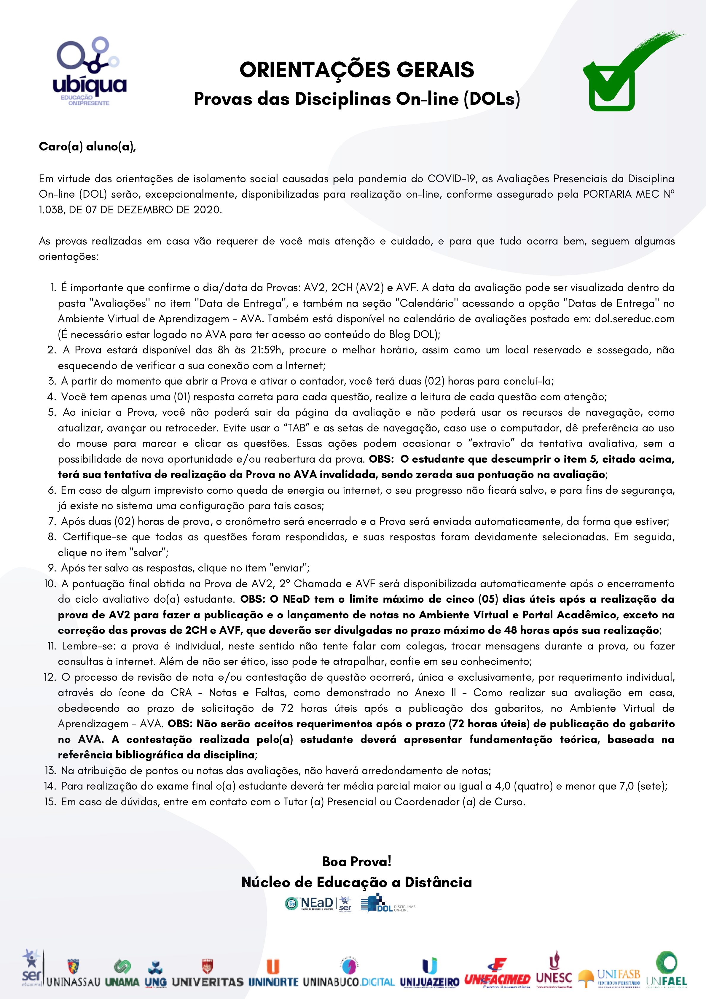 É importante que confirme o dia/data da Provas: AV2, 2CH (AV2) e AVF. A data da avaliação pode ser visualizada dentro da pasta "Avaliações" no item "Data de Entrega", e também na seção "Calendário" acessando a opção "Datas de Entrega" no Ambiente Virtual de Aprendizagem - AVA. Também está disponível no calendário de avaliações postado em: dol.sereduc.com (É necessário estar logado no AVA para ter acesso ao conteúdo do Blog DOL); A Prova estará disponível das 8h às 21:59h, procure o melhor horário, assim como um local reservado e sossegado, não esquecendo de verificar a sua conexão com a Internet; A partir do momento que abrir a Prova e ativar o contador, você terá duas (02) horas para concluí-la; Você tem apenas uma (01) resposta correta para cada questão, realize a leitura de cada questão com atenção; Ao iniciar a Prova, você não poderá sair da página da avaliação e não poderá usar os recursos de navegação, como atualizar, avançar ou retroceder. Evite usar o “TAB” e as setas de navegação, caso use o computador, dê preferência ao uso do mouse para marcar e clicar as questões. Essas ações podem ocasionar o “extravio” da tentativa avaliativa, sem a possibilidade de nova oportunidade e/ou reabertura da prova. OBS: O estudante que descumprir o item 5, citado acima, terá sua tentativa de realização da Prova no AVA invalidada, sendo zerada sua pontuação na avaliação; Em caso de algum imprevisto como queda de energia ou internet, o seu progresso não ficará salvo, e para fins de segurança, já existe no sistema uma configuração para tais casos; Após duas (02) horas de prova, o cronômetro será encerrado e a Prova será enviada automaticamente, da forma que estiver; Certifique-se que todas as questões foram respondidas, e suas respostas foram devidamente selecionadas. Em seguida, clique no item "salvar"; Após ter salvo as respostas, clique no item "enviar"; A pontuação final obtida na Prova de AV2, 2º Chamada e AVF será disponibilizada automaticamente após o encerramento do ciclo avaliativo do(a) estudante. OBS: O NEaD tem o limite máximo de cinco (05) dias úteis após a realização da prova de AV2 para fazer a publicação e o lançamento de notas no Ambiente Virtual e Portal Acadêmico, exceto na correção das provas de 2CH e AVF, que deverão ser divulgadas no prazo máximo de 48 horas após sua realização; Lembre-se: a prova é individual, neste sentido não tente falar com colegas, trocar mensagens durante a prova, ou fazer consultas à internet. Além de não ser ético, isso pode te atrapalhar, confie em seu conhecimento; O processo de revisão de nota e/ou contestação de questão ocorrerá, única e exclusivamente, por requerimento individual, através do ícone da CRA - Notas e Faltas, como demonstrado no Anexo II - Como realizar sua avaliação em casa, obedecendo ao prazo de solicitação de 72 horas úteis após a publicação dos gabaritos, no Ambiente Virtual de Aprendizagem – AVA. OBS: Não serão aceitos requerimentos após o prazo (72 horas úteis) de publicação do gabarito no AVA. A contestação realizada pelo(a) estudante deverá apresentar fundamentação teórica, baseada na referência bibliográfica da disciplina; Na atribuição de pontos ou notas das avaliações, não haverá arredondamento de notas; Para realização do exame final o(a) estudante deverá ter média parcial maior ou igual a 4,0 (quatro) e menor que 7,0 (sete); Em caso de dúvidas, entre em contato com o Tutor (a) Presencial ou Coordenador (a) de Curso. ORIENTAÇÕES GERAIS Provas das Disciplinas On-line (DOLs) Caro(a) aluno(a), Em virtude das orientações de isolamento social causadas pela pandemia do COVID-19, as Avaliações Presenciais da Disciplina On-line (DOL) serão, excepcionalmente, disponibilizadas para realização on-line, conforme assegurado pela PORTARIA MEC Nº 1.038, DE 07 DE DEZEMBRO DE 2020. As provas realizadas em casa vão requerer de você mais atenção e cuidado, e para que tudo ocorra bem, seguem algumas orientações: 1. 2. 3. 4. 5. 6. 7. 8. 9. 10. 11. 12. 13. 14. 15. Boa Prova! Núcleo de Educação a Distância