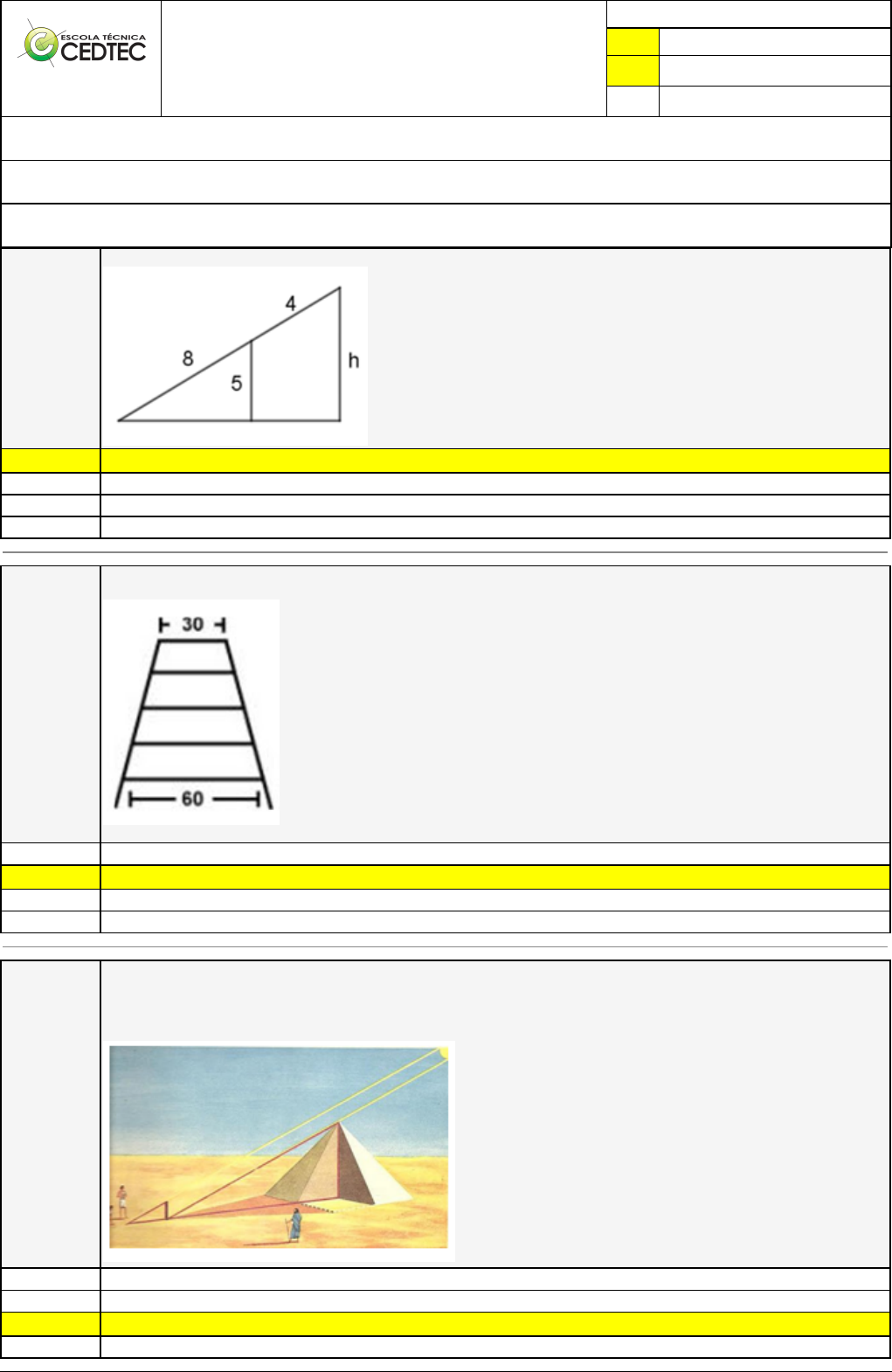 Pincel Atômico - 25/06/2024 22:22:27 1/2 VANDERLEI FERREIRA FREIRE Exercício Caminho do Conhecimento - Etapa 32 (15376) Atividade finalizada em 11/06/2024 23:59:37 (2125674 / 1) LEGENDA Resposta correta na questão # Resposta correta - Questão Anulada X Resposta selecionada pelo Aluno Disciplina: MATEMÁTICA [1058761] - Avaliação com 4 questões, com o peso total de 6,50 pontos [capítulos - 105] Turma: Curso Técnico: Mecânica - Grupo: EAD - 03/24 - EAD MEC [116680] Aluno(a): 91584633 - VANDERLEI FERREIRA FREIRE - Respondeu 4 questões corretas, obtendo um total de 6,50 pontos como nota [350072_29831] Questão 001 Determine o valor da altura do triãngulo abaixo, sabendo que dois triângulos são semelhantes: X 7,5 2,5 9 5 [350074_29806] Questão 002 Um merceneiro deseja construir uma escada trapezoidal com 5 degraus, de maneira que o mais baixo e o mais alto tenham larguras repectivamente iguais a 60 cm e a 30 cm, conforme a figura abaixo: Os degaus serão obtidos cortando-se uma peça linear de madeira cujo comprimento mínimo, em cm, deve ser: 210 X 225 144 180 [350074_29833] Questão 003 Tales de Mileto era uma grande filósofo e matemático da Grécia Antiga. Em uma de suas viagem ao Egito, viu uma pirâmide e ficou intrigado com a sua altura. Ao perguntar aos moradores locais precebeu que nenhum deles sabia dizer ao certo a altura da pirâmide. Pegou uma madeira com 1,5 m de altura acolocou no chão, projetando uma sobra de 1,2 m. Sabendo que a distância do centro da pirâmide até a ponta da sua sombra é de 48,8 m, qual foi a altura calculada por Tales? Abaixo temos uma figura que exemplifica a situação. 39,5 57,4 X 61 45,2 Pincel Atômico - 25/06/2024 22:22:27 2/2 [350073_29808] Questão 004 Num retângulo de perímetro 60, a base é duas vezes a altura. Então a área é: 100 X 200 300 50