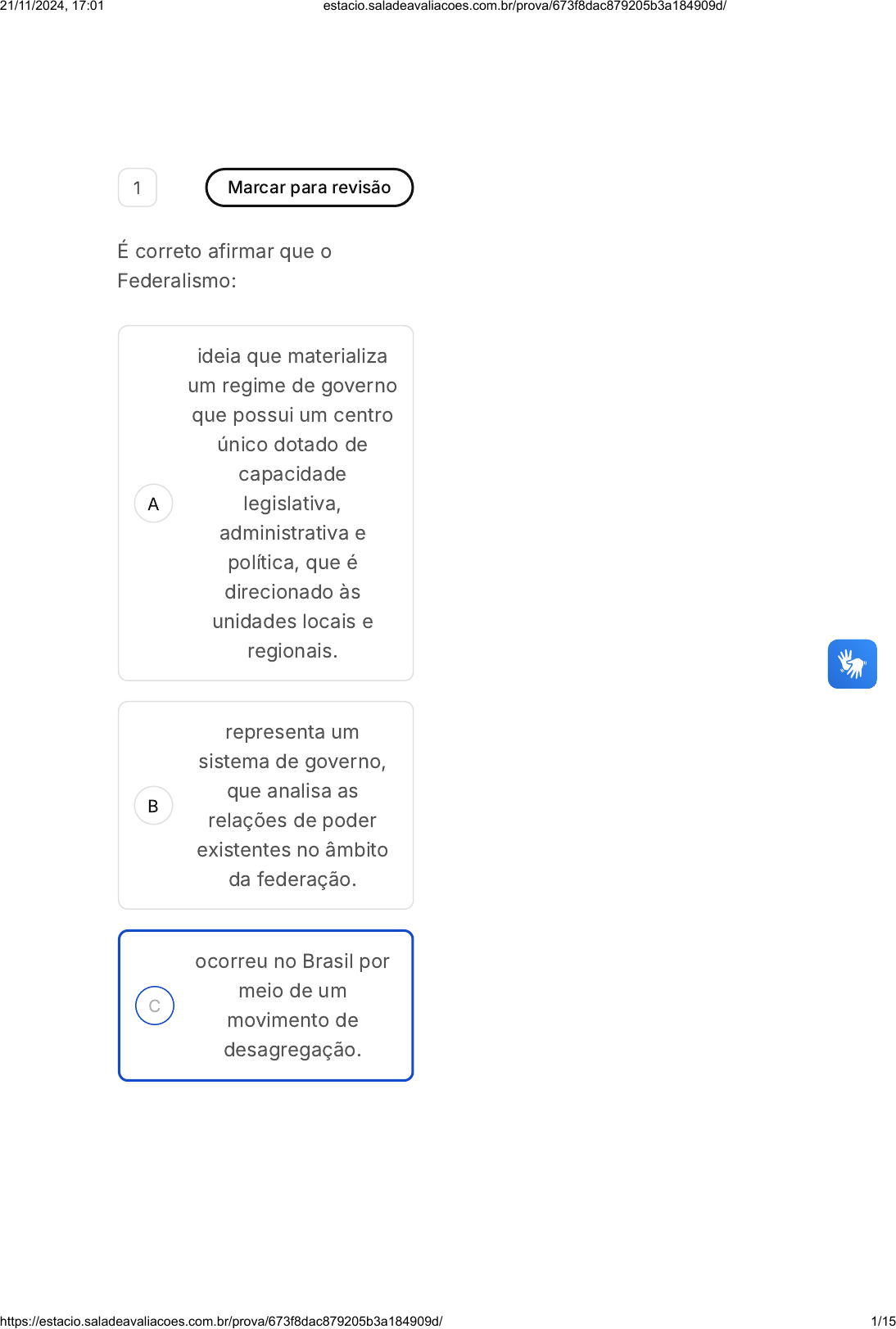 A B C 1 Marcar para revisão É correto afirmar que o Federalismo: ideia que materializa um regime de governo que possui um centro único dotado de capacidade legislativa, administrativa e política, que é direcionado às unidades locais e regionais. representa um sistema de governo, que analisa as relações de poder existentes no âmbito da federação. ocorreu no Brasil por meio de um movimento de desagregação. 21/11/2024, 17:01 estacio.saladeavaliacoes.com.br/prova/673f8dac879205b3a184909d/ https://estacio.saladeavaliacoes.com.br/prova/673f8dac879205b3a184909d/ 1/15 D E A B C ocorreu no Brasil mediante um movimento de agregação. representa uma forma de governo, que leva em consideração a quantidade de titulares que estão no poder. 2 Marcar para revisão A Constituição Federal prevê em seu artigo 19 algumas vedações à União, aos Estados, ao Distrito Federal e aos Municípios. Sobre o tema, assinale a alternativa que apresenta corretamente uma dessas vedações: manter regime próprio de previdência social realizar parcerias público-privadas manter convênios com organizações religiosas enquadradas como Organizações da Sociedade Civil 21/11/2024, 17:01 estacio.saladeavaliacoes.com.br/prova/673f8dac879205b3a184909d/ https://estacio.saladeavaliacoes.com.br/prova/673f8dac879205b3a184909d/ 2/15 D E A B Recusar fé aos documentos públicos criar distinções entre brasileiros e estrangeiros ou preferências entre si. 3 Marcar para revisão Em caso de vagarem os cargos de presidente e vice- presidente da República, na segunda metade do período de mandato. Far-se-á eleição direta para ambos os cargos, 90 dias depois de aberta a última vaga, e os eleitos deverão completar o período de seus antecessores. A eleição para ambos os cargos será feita trinta dias depois da última vaga, pelo Congresso Nacional, e os eleitos deverão completar o período de seus antecessores. Prova AV Organização Estatal 21/11/2024, 17:01 estacio.saladeavaliacoes.com.br/prova/673f8dac879205b3a184909d/ https://estacio.saladeavaliacoes.com.br/prova/673f8dac879205b3a184909d/ 3/15 C D E A eleição para ambos os cargos será feita 30 dias depois da última vaga, pelo Congresso Nacional, e os eleitos iniciarão um novo período de 4 anos de mandato. Tomará posse no governo, para completar o período dos antecessores, o presidente do Supremo Tribunal Federal, que presidirá, na época normal, a eleição dos futuros mandatários. Serão sucessivamente chamados ao exercício da Presidência, para completar o período de seus antecessores, o presidente da Câmara dos Deputados e o do Senado Federal. 4 Marcar para revisão �FCC � 2015 � TCE�AM � Auditor) Projeto de lei ordinária, de iniciativa de Deputado Federal, versando sobre a qualificação de tipos penais 00 hora : 33 min : 15 seg Ocultar Questão 6 de 10 Respondidas �10� Em branco �0� Finalizar prova 1 2 3 4 5 6 7 8 9 10 21/11/2024, 17:01 estacio.saladeavaliacoes.com.br/prova/673f8dac879205b3a184909d/ https://estacio.saladeavaliacoes.com.br/prova/673f8dac879205b3a184909d/ 4/15 A B como crimes hediondos, obtém voto pela aprovação de 181 membros da Câmara dos Deputados, em turno único de votação ao qual estavam presentes 315 dos 513 Deputados, e, no Senado Federal, de 33 dos 40 presentes, igualmente em sessão única. Nessa hipótese, à luz das regras constitucionais do processo legislativo: O projeto de lei padece de vício de inconstitucionalidade, por versar sobre matéria de iniciativa privativa do Presidente da República. O projeto de lei já havia sido rejeitado na Câmara dos Deputados e não poderia sequer ter sido submetido à votação no Senado Federal. 21/11/2024, 17:01 estacio.saladeavaliacoes.com.br/prova/673f8dac879205b3a184909d/ https://estacio.saladeavaliacoes.com.br/prova/673f8dac879205b3a184909d/ 5/15 C D E A matéria constante do projeto de lei, rejeitado no Senado Federal, somente poderá ser objeto de novo projeto, na mesma sessão legislativa, mediante proposta da maioria absoluta dos membros da Câmara dos Deputados ou do Senado Federal. A matéria constante do projeto de lei é reservada à lei complementar, não tendo sido atingido, na Câmara dos Deputados, o quórum necessário à sua aprovação. O projeto de lei deverá ser submetido à sanção do Presidente da República, que poderá, no prazo de 15 dias úteis contados de seu recebimento, vetá-lo no todo ou em parte, por motivo de inconstitucionalidade ou contrariedade ao interesse público. 21/11/2024, 17:01 estacio.saladeavaliacoes.com.br/prova/673f8dac879205b3a184909d/ https://estacio.saladeavaliacoes.com.br/prova/673f8dac879205b3a184909d/ 6/15 A B 5 Marcar para revisão Os assim chamados Tribunais Superiores, ao menos na dicção da Constituição de 1988, são o STJ, o Tribunal Superior Eleitoral, o Tribunal Superior do Trabalho e o Superior Tribunal Militar. Os três últimos integram o que se convencionou chamar de Justiça especializada, assim como os TRFs e os TJs, a Justiça comum. Sobre suas competências, pode ser dito: Para os fins do art. 109, da Constituição, o órgão jurisdicional competente para afirmar o interesse da União na causa é a Justiça Federal. Devido à forma de estado adotada pela Constituição, não cabe falar em tutela da ordem jurídica constitucional estadual. 21/11/2024, 17:01 estacio.saladeavaliacoes.com.br/prova/673f8dac879205b3a184909d/ https://estacio.saladeavaliacoes.com.br/prova/673f8dac879205b3a184909d/ 7/15 C D E A competência para processar e julgar ações oriundas da relação jurídico estatutária entre poder público e servidor é da Justiça do Trabalho. É da jurisprudência atual do STF o entendimento segundo o qual compete à Justiça do Trabalho processar e julgar ações penais. É admissível recurso especial de decisão proferida por Turma recursal, sendo possível, em tal via, que o STJ reexamine prova para dar nova conformação. 6 Marcar para revisão De acordo 