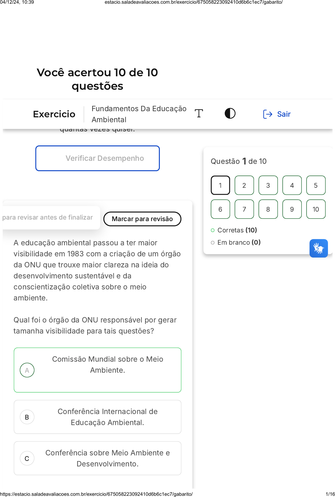 Você acertou 10 de 10 questões Verifique o seu desempenho e continue treinando! Você pode refazer o exercício quantas vezes quiser. Verificar Desempenho A B C 1 Marcar para revisãopara revisar antes de finalizar A educação ambiental passou a ter maior visibilidade em 1983 com a criação de um órgão da ONU que trouxe maior clareza na ideia do desenvolvimento sustentável e da conscientização coletiva sobre o meio ambiente. Qual foi o órgão da ONU responsável por gerar tamanha visibilidade para tais questões? Comissão Mundial sobre o Meio Ambiente. Conferência Internacional de Educação Ambiental. Conferência sobre Meio Ambiente e Desenvolvimento. Questão 1 de 10 Corretas �10� Em branco �0� 1 2 3 4 5 6 7 8 9 10 Exercicio Fundamentos Da Educação Ambiental Sair 04/12/24, 10:39 estacio.saladeavaliacoes.com.br/exercicio/675058223092410d6b6c1ec7/gabarito/ https://estacio.saladeavaliacoes.com.br/exercicio/675058223092410d6b6c1ec7/gabarito/ 1/16 D E Conferência Internacional de Educação Ambiental e Sociedade. Rio �20. Resposta correta Parabéns, você selecionou a alternativa correta. Confira o gabarito comentado! Gabarito Comentado A Comissão Mundial sobre o Meio Ambiente foi o órgão da ONU criado em 1983 que trouxe maior visibilidade para a educação ambiental. Este órgão foi responsável por esclarecer a ideia de desenvolvimento sustentável e conscientização coletiva sobre o meio ambiente, tornando esses conceitos mais conhecidos e discutidos em todo o mundo. Portanto, a alternativa correta é a "A". 2 Marcar para revisão A educação ambiental vem se fazendo presente cada vez mais nas nossas vidas. Podemos reconhecer exemplos dela em atividades de coleta de lixo nas praias ou até mesmo em filmes que falam sobre as consequências do efeito estufa. Nas salas de aula, ela também está presente. Os documentos que definem em quais disciplinas e anos escolares a educação ambiental aparece são: 04/12/24, 10:39 estacio.saladeavaliacoes.com.br/exercicio/675058223092410d6b6c1ec7/gabarito/ https://estacio.saladeavaliacoes.com.br/exercicio/675058223092410d6b6c1ec7/gabarito/ 2/16 A B C D E Os decretos presidenciais. Os Parâmetros Curriculares Nacionais. As diligências da Política Nacional de Educação Ambiental. As leis da Constituição Federal de 1988. Os planos de ação do Plano Nacional de Gestão da Educação Ambiental. Resposta correta Parabéns, você selecionou a alternativa correta. Confira o gabarito comentado! Gabarito Comentado Os Parâmetros Curriculares Nacionais. 3 Marcar para revisão A seção III da Agenda 2021 trata do "fortalecimento do papel dos grupos principais". Ela tem o objetivo de envolver grupos sociais nas tomadas de decisão em que estejam envolvidos interesses ou políticas públicas. 04/12/24, 10:39 estacio.saladeavaliacoes.com.br/exercicio/675058223092410d6b6c1ec7/gabarito/ https://estacio.saladeavaliacoes.com.br/exercicio/675058223092410d6b6c1ec7/gabarito/ 3/16 A B C D E Dentro dessa seção, são considerados "grupos principais" nas tomadas de decisão: As comunidades tradicionais. Os representantes das indústrias e comércio locais. Os principais representantes da economia nacional. Os representantes indígenas. Representantes de todas as camadas sociais. Resposta correta Parabéns, você selecionou a alternativa correta. Confira o gabarito comentado! Gabarito Comentado A alternativa correta é a letra E, que afirma que os "grupos principais" considerados nas tomadas de decisão são os "representantes de todas as camadas sociais". Isso está de acordo com o objetivo da seção III da Agenda 2021, que busca fortalecer o papel dos grupos principais, envolvendo todos os grupos sociais nas tomadas de decisão que envolvam interesses ou políticas públicas. Portanto, não se restringe a apenas um grupo específico, como comunidades tradicionais, representantes das indústrias 04/12/24, 10:39 estacio.saladeavaliacoes.com.br/exercicio/675058223092410d6b6c1ec7/gabarito/ https://estacio.saladeavaliacoes.com.br/exercicio/675058223092410d6b6c1ec7/gabarito/ 4/16 A B C e comércio locais, principais representantes da economia nacional ou representantes indígenas, mas sim a todos os representantes de todas as camadas sociais. 4 Marcar para revisão Na década de 1970, aconteceu em Tbilisi a Conferência Internacional de Educação Ambiental. Nesse evento, foram definidos os princípios norteadores da educação ambiental. Qual destas alternativas contém especificamente alguns dos princípios definidos nessa conferência? Visão de totalidade do ambiente, interdisciplinaridade e implantação do projeto denominado Protetores da vida. Metodologia participativa, interdisciplinaridade e combate ao trabalho escravo. Agricultura sustentável, gestão dos recursos naturais e redução das desigualdades sociais. 04/12/24, 10:39 estacio.saladeavaliacoes.com.br/exercicio/675058223092410d6b6c1ec7/gabarito/ https://estacio.saladeavaliacoes.com.br/exercicio/675058223092410d6b6c1ec7/gabarito/ 5/16 D E Implantação do Sistema Brasileiro de Informações em Educação Ambiental. Formação de cidadão, interdisciplinaridade e visão de totalidade do ambiente. Resposta correta Parabéns, você selecionou a alternativa correta. Confira o gabarito comentado! Gabarito Comentado A alternativa correta é a letra E. A Conferência Internacional de Educação Ambiental, realizada em Tbilisi, definiu alguns princípios fundamentais para a educação ambiental. Entre eles, destacam- se a formação de cidadãos conscientes e atuantes na preservação do meio ambiente, a interdisciplinaridade, que propõe uma abordagem integrada e holística dos problemas ambientais, e a visão de totalidade do ambiente, que considera a complexidade e a interdependência dos elementos que compõem o meio ambiente. As outras alternativas apresentam elementos que, embora possam estar relacionados à educação ambiental, não foram especificamente definidos como prin