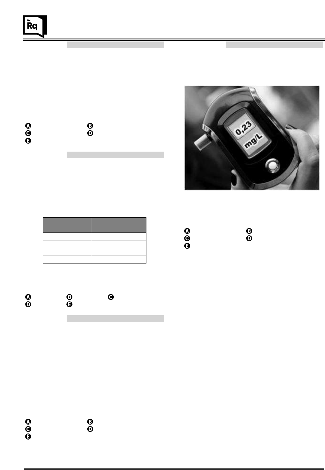 ENEM 2019 1000 QUESTÕES DE QUÍMICA – CADERNO ÚNICO | Página 117 QUESTÃO 391 -------------------------------------------------- O ozônio (O3) é nosso aliado na estratosfera, protegendo contra a incidência de raios ultravioleta. No entanto, torna-se um inimigo perigoso no ar que respiramos próximo à superfície da Terra. Concentrações iguais ou superiores a 0,12 L de O3 em um milhão de litros de ar podem provocar irritação nos olhos e problemas pulmonares, como edema e hemorragia. Esta concentração limite de ozônio corresponde a: 0,12 ppm. 1,2 ppm. 0,012 ppm. 12 ppm. 120 ppm. QUESTÃO 392 -------------------------------------------------- A concentração de glicose (C6H12O6) M = 180 g/mol, na urina, é determinada pela média da intensidade da cor resultante da reação desse açúcar com o ácido 3,5-dinitrossalicílico. A tabela abaixo mostra a relação entre a concentração de glicose em solução aquosa e a intensidade da cor resultante. Concentração (g/100 mL) Intensidade da cor 0,20 0,30 0,50 0,50 0,54 0,75 0,76 1,00 A concentração mol.L-1, de uma solução de glicose que, após a reação, apresenta intensidade de cor igual a 0,75, é igual a: 0,03. 0,06. 0,30. 0,60. 0,08. QUESTÃO 393 -------------------------------------------------- A solução aquosa de hipoclorito de sódio, comercializada com o nome de água sanitária, é um eficiente bactericida, sendo largamente usado no tratamento de águas e na higienização de ambientes e utensílios. Deseja-se preparar um litro de solução aquosa de hipoclorito de sódio com concentração de 10 ppm, a partir de uma solução a 5% (m/v) desse sal. Sendo o volume de uma gota = 0,05 mL, a quantidade de gotas da solução de hipoclorito de sódio a 5% (m/v) necessária ao preparo da solução a 10ppm é 1 gota. 2 gotas. 3 gotas. 4 gotas. 5 gotas. QUESTÃO 394 -------------------------------------------------- Com a nova Lei Seca, as penas estão mais rígidas. Agora, pequenas quantidades de etanol no sangue (por exemplo, a ingestão de um único copo de cerveja) são suficientes para um resultado positivo no teste do bafômetro. Considerando o resultado do teste do bafômetro indicado na figura, é correto afirmar que a quantidade, em mol, de moléculas de etanol (C2H6O) presentes em 1,0 litro de sangue da pessoa testado é: 5,0 x 10-3 5,0 x 10-6 5,0 x 10-2 5,0 x 10-4 5,0 x 10-5 1000 QUESTÕES DE QUÍMICA PARA O ENEM 1000 QUESTÕES DE QUÍMICA – CADERNO ÚNICO | Página 118 QUESTÃO 395 -------------------------------------------------- A dipirona sódica é um medicamento com ações analgésicas e antitérmicas, que pertence à família das pirazolonas, as substâncias mais antigas obtidas por síntese farmacêutica. Sua estrutura molecular está apresentada a seguir: As massas molares (em g/mol) dos elementos constituintes dessa molécula são: C = 12; H = 1; N = 14; S = 32; O = 16; Na = 23. Em janeiro de 2017, o programa Fantástico apresentou uma reportagem especial, na qual testava o princípio ativo de medicamentos genéricos. Com base em um estudo da Universidade Federal de Minas Gerais, chegou- se à conclusão de que um comprimido que deveria conter 500 mg de dipirona sódica, fabricado por um determinado laboratório de medicamentos genéricos, apresentava em sua composição cerca de 95% do princípio ativo. Nessas condições, a quantidade de dipirona sódica existente na amostra analisada é mais próxima de 0,001 mol. 0,01 mol. 0,1 mol. 0,5 mol. 1 mol. QUESTÃO 396 -------------------------------------------------- Uma pessoa que não gosta de café “forte” resolveu transformar um café “forte” num café “fraco” por acréscimo de água. Qual o nome da técnica empregada? dissolução. extração por solvente. diluição. filtração. ionização. QUESTÃO 397 [ENEM] -------------------------------------- A varfarina é um fármaco que diminui a agregação plaquetária, e por isso é utilizada como anticoagulante, desde que esteja presente no plasma, com uma concentração superior a 1,0 mg/L. Entretanto, concentrações plasmáticas superiores a 4,0 mg/L podem desencadear hemorragias. As moléculas desse fármaco ficam retidas no espaço intravascular e dissolvidas exclusivamente no plasma, que representa aproximadamente 60% do sangue em volume. Em um medicamento, a varfarina é administrada por via intravenosa na forma de solução aquosa, com concentração de 3,0 mg/mL. Um indivíduo adulto, com volume sanguíneo total de 5,0 L, será submetido a um tratamento com solução injetável desse medicamento. Qual é o máximo volume da solução do medicamento que pode ser administrado a esse indivíduo, pela via intravenosa, de maneira que não ocorram hemorragias causadas pelo anticoagulante? 1,0 mL. 1,7 mL. 2,7 mL. 4,0 mL. 6,7 mL. ENEM 2019 1000 QUESTÕES DE QUÍMICA – CADERNO ÚNICO | Página 119 QUESTÃO 398 -------------------------------------------------- A lactose, principal açúcar do leite da maioria dos mamíferos, pode ser obtida a partir do leite de vaca por uma sequência de processos. A fase final envolve a purificação por recristalização em água. Suponha que, para esta purificação, 100 kg de lactose foram tratados com 100L de água, a 80°C, agitados e filtrados a esta temperatura. O filtrado foi resfriado a 10°C. Solubilidade da lactose, em kg/100L de H2O: a 80°C .................. 95 a 10°C .................. 15 A massa máxima de lactose, em kg, que deve cristalizar com este procedimento é, aproximadamente, 5. 15. 80. 85. 95. QUESTÃO 399 -------------------------------------------------- Na fabricação de refrigerantes, acontece a dissolução de gás carbônico em água conforme a seguinte equação: CO2(g)⇌ CO2(aq) Na fabricação de refrigerante, ocorre maior dissolução de gás carbônico em altas temperaturas, pois a dissolução desse gás em água é endotérmica e o aquecimento favorece a dissolução. altas temperaturas, pois o aquecime