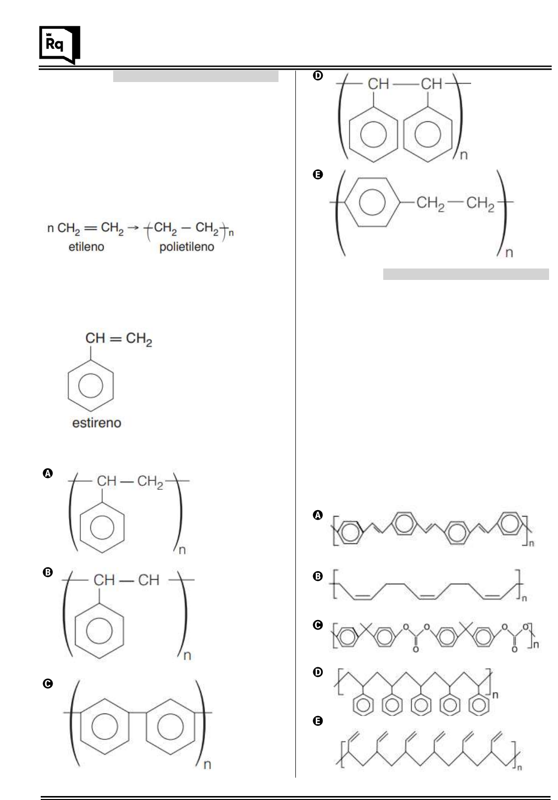 ENEM 2019 1000 QUESTÕES DE QUÍMICA – CADERNO ÚNICO | Página 255 QUESTÃO 779 -------------------------------------------------- Microesferas podem detectar anticorpos ou pedaços de DNA. Microesferas de polietileno de 5 micrômetros (o equivalente à milésima parte do milímetro) carregam antígenos de um determinado vírus ou bactéria. Exame brasileiro pode detectar até cem doenças em amostras de sangue. (O Estado de S. Paulo, 20/7/2009) O polietileno, plástico muito utilizado, é obtido pela polimerização do etileno. Essa polimerização pode ser representada por: (n = número muito grande) O poliestireno, outro plástico muito utilizado, é obtido pela polimerização do estireno, cuja fórmula é a seguinte: Sabendo-se que a polimerização do estireno é semelhante à do etileno, conclui-se que o poliestireno pode ser representado por: QUESTÃO 780 -------------------------------------------------- O senso comum nos diz que os polímeros orgânicos (plásticos) em geral são isolantes elétricos. Entretanto, os polímeros condutores são materiais orgânicos que conduzem eletricidade. O que faz estes polímeros diferentes é a presença das ligações covalentes duplas conjugadas com ligações simples, ao longo de toda a cadeia principal, incluindo grupos aromáticos. Isso permite que um átomo de carbono desfaça a ligação dupla com um vizinho e refaça-a com outro. Assim, a carga elétrica desloca-se dentro do material. FRANCISCO, R. H. P. Polímeros condutores. Revista Eletrônica de Ciências, n. 4, fev. 2002. Disponível em: www.cdcc.usp.br. Acesso em: 29 fev. 2012 (adaptado). De acordo com o texto, qual dos polímeros seguintes seria condutor de eletricidade? 1000 QUESTÕES DE QUÍMICA PARA O ENEM 1000 QUESTÕES DE QUÍMICA – CADERNO ÚNICO | Página 256 QUESTÃO 781 -------------------------------------------------- O esquema a seguir mostra um fluxograma simplificado do processo de produção do polietileno seguindo duas rotas, a da cana-de- açúcar e a do petróleo. Na produção do polietileno, há diferença no emprego da matéria-prima e na rota de obtenção. O plástico comum tem como matéria- prima o petróleo, e o “plástico verde”, a cana-de- açúcar. PITT, Fernando D. et al. Desenvolvimento histórico, científico e tecnológico de polímeros sintéticos e de fontes renováveis. Revista da Unifebe, Santa Catarina, n. 9, 2011. Disponível em: . Acesso em: 30 out. 2017. (adaptado). O método de produção de polietileno por meio da cana-de-açúcar produz um plástico de coloração verde. tem como produto um plástico não reciclável. contribui para o aumento do aquecimento global. é vantajosa, pois sua fonte de matéria-prima é renovável. necessita de uma tecnologia muito cara, que o torna inviável economicamente. QUESTÃO 782 -------------------------------------------------- Alguns materiais poliméricos não podem ser utilizados para a produção de certos tipos de artefatos, seja por limitações das propriedades mecânicas, seja por limitações das propriedades mecânicas, seja pela facilidade com que sofrem degradação, gerando subprodutos indesejáveis para aquela aplicação. Torna-se importante, então, a fiscalização, para determinar a natureza do polímero utilizado na fabricação do artefato. Um dos métodos possíveis baseia-se na decomposição do polímero para a geração dos monômeros que lhe deram origem. A decomposição controlada de um artefato gerou a diamina H2N(CH2)6NH2 e o diácido HO2C(CH2)4CO2H. Logo, o artefato era feito de poliéster. poliamida. polietileno. poliacrilato. polipropileno. ENEM 2019 1000 QUESTÕES DE QUÍMICA – CADERNO ÚNICO | Página 257 QUESTÃO 783 ------------------------------------------------------------------------------------------------------------------------------------ O poli(ácido lático) ou PLA é um material de interesse tecnológico por ser um polímero biodegradável e bioabsorvível.O ácido lático, um metabólito comum no organismo humano, é a matéria-prima para produção do PLA, de acordo com a equação química simplificada Que tipo de polímero de condensação é formado nessa reação? Poliéster. Polivinila. Poliamida. Poliuretana. Policarbonato. QUESTÃO 784 [ENEM] ------------------------------------------------------------------------------------------------------------------------ O Nylon® é um polímero (uma poliamida) obtido pela reação do ácido adípico com a hexametilenodiamina, como indicado no esquema reacional. → Na época da invenção desse composto, foi proposta uma nomenclatura comercial, baseada no número de átomos de carbono do diácido carboxílico, seguido do número de carbonos da diamina. De acordo com as informações do texto, o nome comercial de uma poliamida resultante da reação do ácido butanodioico com o 1,2-diamino-etano é Nylon 4,3. Nylon 6,2. Nylon 3,4. Nylon 4,2. Nylon 2,6. QUESTÃO 785 ------------------------------------------------------------------------------------------------------------------------------------ As proteínas são polímeros naturais formados através de ligações peptídicas que se estabelecem quando o grupo amino de um aminoácido reage com o grupo carboxila de outro. onde R1, R2 são grupos de átomos ou substituintes. Com base nessa estrutura, conclui-se que as proteínas são: poliacrilonitrilas. poliamidas. poliésteres. policarbonatos. polissacarídeos.