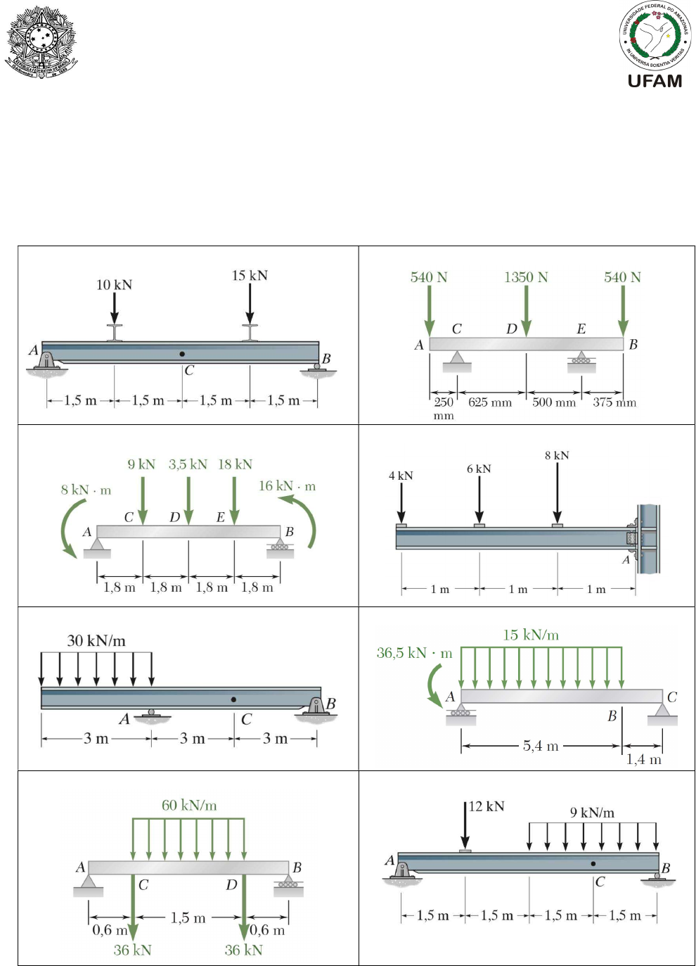 Universidade Federal do Amazonas Faculdade de Tecnologia Departamento de Engenharia Civil FTC222 Mecânica I – Lista de Exercícios 6 – Vigas Para as vigas abaixo, determine: (a) As reações de apoio; (b) As equações de esforços cortantes e de momentos fletores; (c) Os diagramas de esforços cortantes (DEC) e de momentos fletores (DMF). 1) 2) 3) 4) 5) 6) 7) 8) Universidade Federal do Amazonas Faculdade de Tecnologia Departamento de Engenharia Civil 9) 10) 11) 12)
