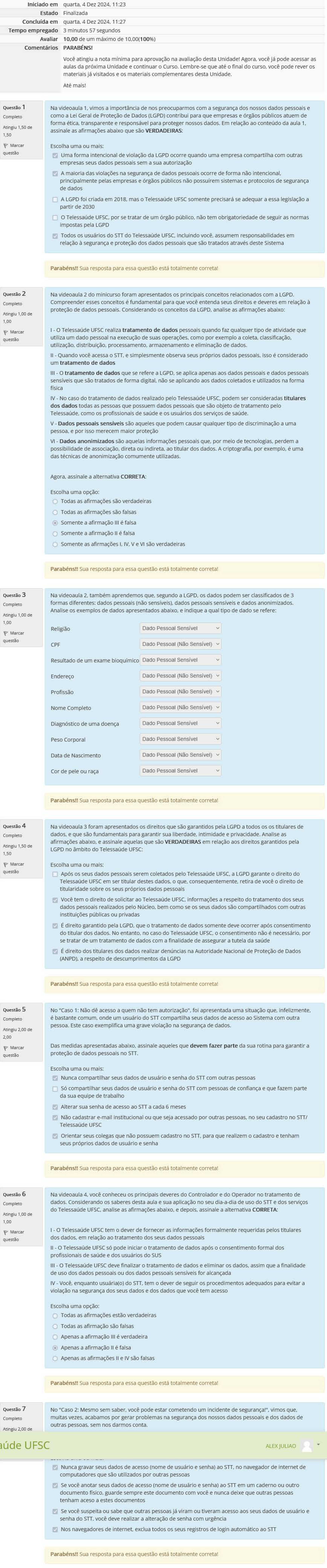 Iniciado em quarta 2024, 11:23 Estado Finalizada Concluída em quarta Dez 11:27 Tempo empregado minutos segundos Avaliar 10.00 de 10.00(100%) Comentários Você nota mínima para aprovação na avaliação desta Unidade! Agora você pode acessar as aulas continuar Curso Lembre que até final do curso, você pode rever os materiais visitados materiais complementares desta Até mais! Questão Na videoaula vimos importância nos preocuparmos segurança dos nossos dados pessoais e Completo como a Lei Geral de Proteção de Dados (LGPD para que empresas públicos atuem de forma transpare roteger nossos dados Em relação ao da aula 1,50 de assinale as afirmações abaixo que são Escolha mais questão Uma forma intencional de violação da LGPD ocorre quando uma empresa compartilha com outras empresas seus dados pessoais sem a sua autorização A maioria das violações segurar de dados pessoais ocorre de forma não intencional principalmente pelas empresas gãos públicos não possuirem sistemas protocolos de segurança de dados criada em 2018 mas Telessaúde UFSC somente precisará essa partir 2030 . o Telessaúde UFSC tratar deum órgão não tem obrigatoriedade de seguir as normas impostas pela LGPD Todos usuarios do do Telessaúde UFSC. você assumem responsabilidades em relação segurança proteção dos dados pessoais que são tratados deste Sistema Parabens!! Sua resposta para essa questão está totalmente Na videoaula do minicurso foram apresentados principais conceitos relacionados com LGPD esses conceitos fundamental para que você entenda seus direitos deveres em Completo proteção de dados Considerando os conceitos da analise as afirmações abaixo: Atingiu I o Telessaúde UFSC realiza tratamento de dados pessoais quando faz qualquer tipo de atividade que Marcar utiliza dado pessoal execução suas como eliminação dados. Quando STT. simplesmente observa seus próprios dados isso um tratamento dados III tratamento de dados que se refere LGPD se aplica apenas aos dados pessoais dados pessoais veis que são tratados de forma digital, não aplicando aos dados coletados utilizados na forma IV No caso do tratamento de dados realizado pelo Telessaúde UFSC podem ser consideradas titulares dos dados todas pessoas que possuem dados pessoals que são objeto tratamento pelo como os profissionais de saúde os dos serviços de saúde Dados pessoais sensiveis são aqueles que podem causar qualquer tipo de discriminação uma pessoa. por isso merecem maior proteção VI Dados anonimizados são aquelas informações pessoais que por meio de tecnologias perdem a possibilidade de direta titular dos dados por exemplo, das técnicas de anonimização comumente Agora assinale alternativa CORRETA Escolha opção: Todas afirmações são verdadeiras Todas afirmações são falsas Somente firmação falsa Somente afirmação falsa Somente afirmações IV. são verdadeiras Parabens!! Sua resposta para essa questão está totalmente correta! Questão Na videoaula aprendemos que segundo LGPD dados podem ser classificados de3 Completo formas dados pessoals (não dados pessoais dados anonimizados Analise os exemplos de dados apresentados abaixo indique qual tipo de dado se refere: 1,00 Religião Dado Pessoal Sensivel Marcar questão CPF Dado Pessoal (Não Sensível) Resultado de um exame Dado Pessoal Endereço Dado Pessoal Sensível) Profissão Dado Pessoal Sensivel) Nome Completo Dado Pessoal (Não Diagnóstico uma doença Dado Pessoal Peso Corporal Dado Pessoal Data Nascimento Dado Pessoal (Não Cor pele raça Dado Pessoal Sensível Parabens!! Sua resposta para essa questão totalmente correta! Na videoaula foram apresentados os direitos que são garantidos pela LGPD todos os titulares de Completo que são fundamentais para garantir sua intimidade privacidade Analise afirmações abaixo assinale aquelas que são VERDADEIRAS em relação aos direitos garantidos pela LGPD no do Telessaúde UFSC: Marcar Escolh uma mais: questão dados pessoais serem pelo Telessaúde UFSC garante direito do Telessaúde UFSC em ser titular destes dados que consequentemente retira de você direito de titularidade sobre os seus dados pessoais Você tem direito de solicitar ao UFSC. informações respeito do tratamento dos seus dados pessoais realizados pelo Núcleo, bem como seus dados são com outras públicas ou privadas direito garantido pela que tratamento dados somente deve ocorrer após consentimento titula dos dados No entanto no caso do Telessaúde UFSC. consentimento não necessário por se trata de um de dados com de assegura da saúde dos titulares dos dados realizar denuncias na Autoridade Nacional de Proteção de Dados (ANPD) respeito de descump da LGPD Par Sua resposta para essa questão está totalmente No "Caso acesso quem não tem autorização" foi apresentada uma situação Completo bastante comum onde do STT compart seus dados acesso ao Sistema com outra pessoa. Este caso exemplifica uma grave violação na segurança de dados. Das medidas apresentadas assinale aqueles que fazer parte da sua rotina para garantir a Marcar questão proteção de dados pessoais no STT. Escolh uma Nunca compartilhar seus dados de senha do STT com outras pessoas compartilhar seus dados de usuário senha do STT com pessoas de confiança que fazem parte da sua equipe de trabalho Alterar sua senha de acesso ao STT cada meses Não cadastra institucional ou que seja acessado por outras no seu cadastro no Telessaude UFSC rientar seus colegas que não possuem cadastro no para que realizem cadastro tenham seus próprios dados de senha Sua resposta essa questão está totalmente correta! Questão 6 Na videoaula você conheceu principais deveres do Controlador do Operador no tratamento de Completo dados Considerando saberes desta aula aplicação seu dia uso do STT dos serviços do Telessaúde analise afirmações abaixo, assinale alternativa CORRETA 1. Telessaúde UFSC tem dever de fornecer informações formalmente requeridas pelos t