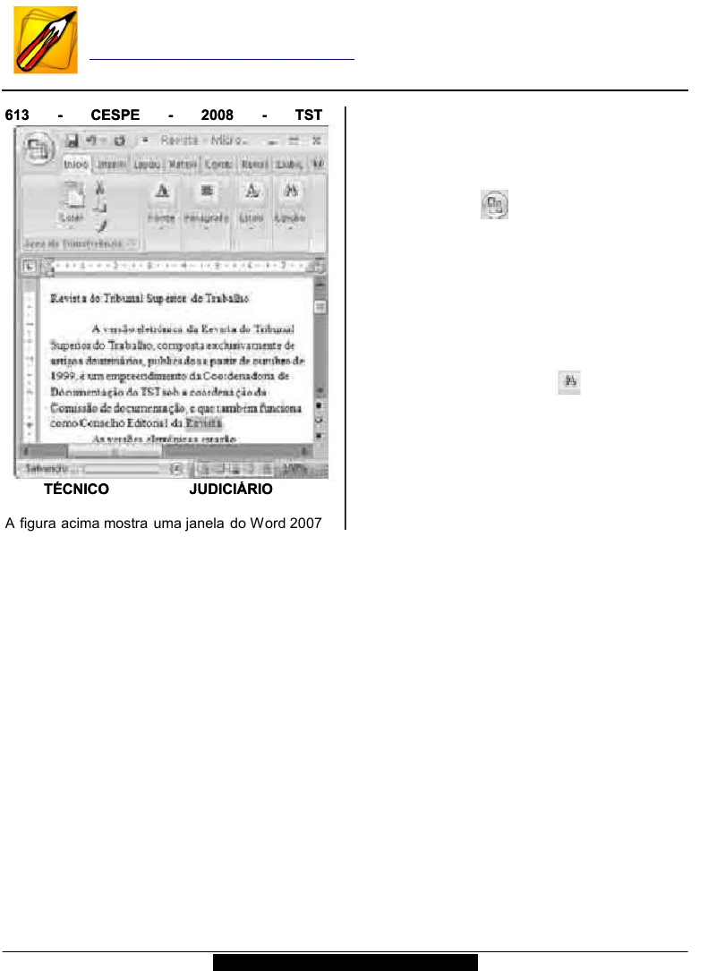 124 www.1001questoesdeconcurso.com.brwww.1001questoesdeconcurso.com.br Quer entrar para lista preferencial para receber mais 1001 QUESTÕES DE CONCURSOQuer entrar para lista preferencial para receber mais 1001 QUESTÕES DE CONCURSO de outras bancas ou matérias? Sim?! Então, cadastre o seu email no meu sitede outras bancas ou matérias? Sim?! Então, cadastre o seu email no meu site www.1001questoesdeconcurso.com.br www.1001questoesdeconcurso.com.br para receber mais questões e outras surpresas. para receber mais questões e outras surpresas. 613 - CESPE - 2008 - TST613 - CESPE - 2008 - TST - - TÉCNICO TÉCNICO JUDICIÁRIOJUDICIÁRIO A figura acima mostra uma janela do Word 2007 com um documento em processo de edição, no qual adocumento em processo de edição, no qual a palavra “Revista”palavra “Revista” está selecionada. Com está selecionada. Com relação a essa figura e ao Word 2007, julguerelação a essa figura e ao Word 2007, julgue os itens subseqüentes.os itens subseqüentes. O ato de clicar possibilita que seja aberta uma lista de opções, entre as quais a opçãoNovo, que permite a criação de um novo documento em branco. ( ) Certo ( ) Errado 614 - CESPE - 2008 - TST - TÉCNICO614 - CESPE - 2008 - TST - TÉCNICO JUDICIÁRIOJUDICIÁRIO Para iniciar a ferramenta que tem por função aPara iniciar a ferramenta que tem por função a realização de correção ortográfica automáticarealização de correção ortográfica automática do texto, é suficiente clicardo texto, é suficiente clicar ( ) Certo ( ) Errado