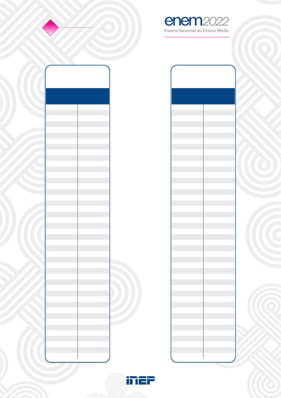 2º DIA - CADERNO 8 Gabarito 2022 Rosa QUESTÃO GABARITO 136 C 137 B 138 D 139 C 140 C 141 B 142 D 143 D 144 C 145 B 146 A 147 A 148 D 149 D 150 B 151 A 152 B 153 C 154 E 155 A 156 C 157 B 158 B 159 D 160 C 161 D 162 B 163 D 164 E 165 A 166 D 167 C 168 A 169 C 170 D 171 E 172 C 173 D 174 E 175 B 176 D 177 B 178 E 179 D 180 B QUESTÃO GABARITO 91 A 92 A 93 A 94 C 95 E 96 D 97 D 98 E 99 A 100 E 101 B 102 B 103 D 104 B 105 E 106 D 107 E 108 E 109 C 110 D 111 C 112 C 113 C 114 D 115 B 116 B 117 D 118 A 119 C 120 B 121 A 122 C 123 A 124 D 125 C 126 A 127 D 128 D 129 C 130 A 131 B 132 A 133 B 134 B 135 B MATEMÁTICA E SUAS TECNOLOGIAS CIÊNCIAS DA NATUREZA E SUAS TECNOLOGIAS 2a Aplicação