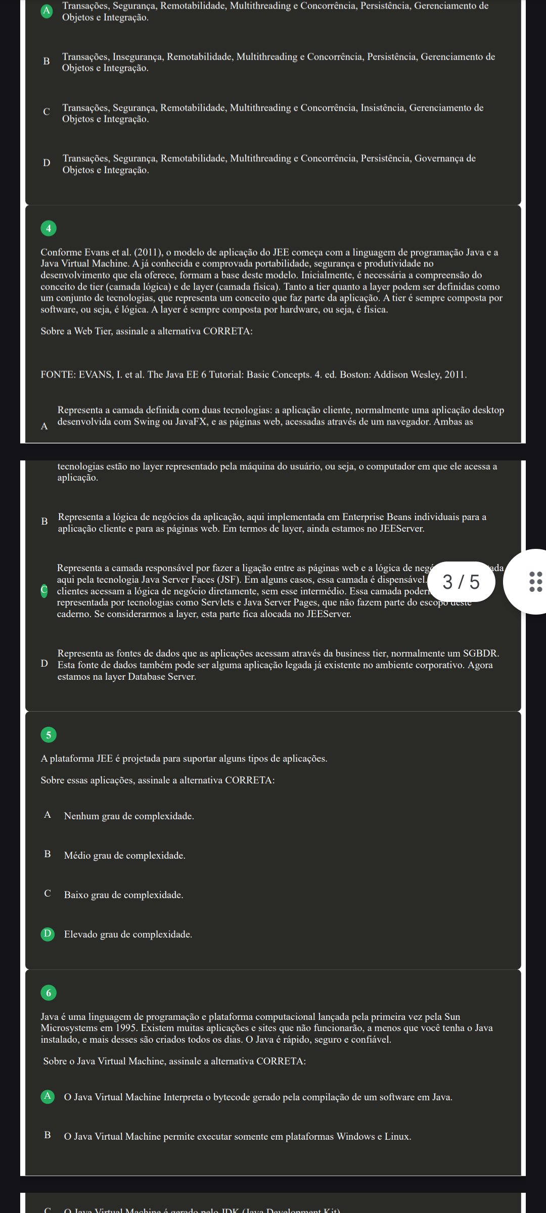 Transações, Segurança, Remotabilidade, Multithreading e Concorrência. Persistência Gerenciamento de Objetos e Integração. B Transações, Insegurança, Remotabilidade, Multithreading e Concorrência. Persistência, Gerenciamento de Objetos e C Transações, Segurança, Remotabilidade, Multithreading e Concorrência, Insistência, Gerenciamento de Objetos e Integração. D Transações, Segurança, Remotabilidade, Multithreading e Concorrência, Persistência, Governança de Objetos e Integração. 4 Conforme Evans et al. (2011), modelo de aplicação do JEE começa com a linguagem de programação Java e a Java Virtual A já conhecida e comprovada portabilidade, segurança e produtividade no desenvolvimento que ela oferece, formam a base deste modelo. Inicialmente, é necessária a compreensão do conceito de tier (camada lógica) e de layer (camada física). Tanto a tier quanto a layer podem ser definidas como um conjunto de tecnologias, que representa um conceito que faz parte da aplicação. A tier é sempre composta por software, ou seja, é lógica. A layer é sempre composta por hardware, ou seja, é Sobre a Web Tier, assinale a alternativa CORRETA: FONTE: EVANS, I. et al. The Java EE 6 Tutorial: Basic Concepts. 4. ed. Boston: Addison Wesley, 2011. Representa a camada definida com duas tecnologias: a aplicação cliente, normalmente uma aplicação desktop A desenvolvida com Swing ou JavaFX, e as páginas web, acessadas através de um navegador. Ambas as tecnologias estão no layer representado pela máquina do usuário, ou seja, computador em que ele acessa a aplicação. B Representa a lógica de negócios da aplicação, aqui implementada em Enterprise Beans individuais para a aplicação cliente e para as páginas web. Em termos de layer, ainda estamos no JEEServer. Representa a camada responsável por fazer a ligação entre as páginas web e a lógica de neg ada aqui pela tecnologia Java Server Faces (JSF). Em alguns casos, essa camada é dispensável 3/5 clientes acessam a lógica de negócio diretamente, sem esse intermédio. Essa camada poder representada por tecnologias como Servlets e Java Server Pages, que não fazem parte do caderno. Se considerarmos a layer, esta parte fica alocada no JEEServer. Representa as fontes de dados que as aplicações acessam através da business tier, normalmente um SGBDR D Esta fonte de dados também pode ser alguma aplicação legada já existente no ambiente corporativo. Agora estamos na layer Database Server. 5 A plataforma JEE é projetada para suportar alguns tipos de aplicações. Sobre essas aplicações, assinale a alternativa CORRETA: A Nenhum grau de complexidade. B Médio grau de complexidade. C Baixo grau de complexidade. D Elevado grau de complexidade 6 Java é uma linguagem de programação e plataforma computacional lançada pela primeira vez pela Sun Microsystems em 1995. Existem muitas aplicações e sites que não funcionarão, a menos que você tenha Java instalado, e mais desses são criados todos os dias. O Java é rápido, seguro e confiável. Sobre Java Virtual Machine, assinale a alternativa CORRETA: O Java Virtual Machine Interpreta bytecode gerado pela compilação de um software em Java. B O Java Virtual Machine permite executar somente em plataformas Windows e Virtual Machine IDK