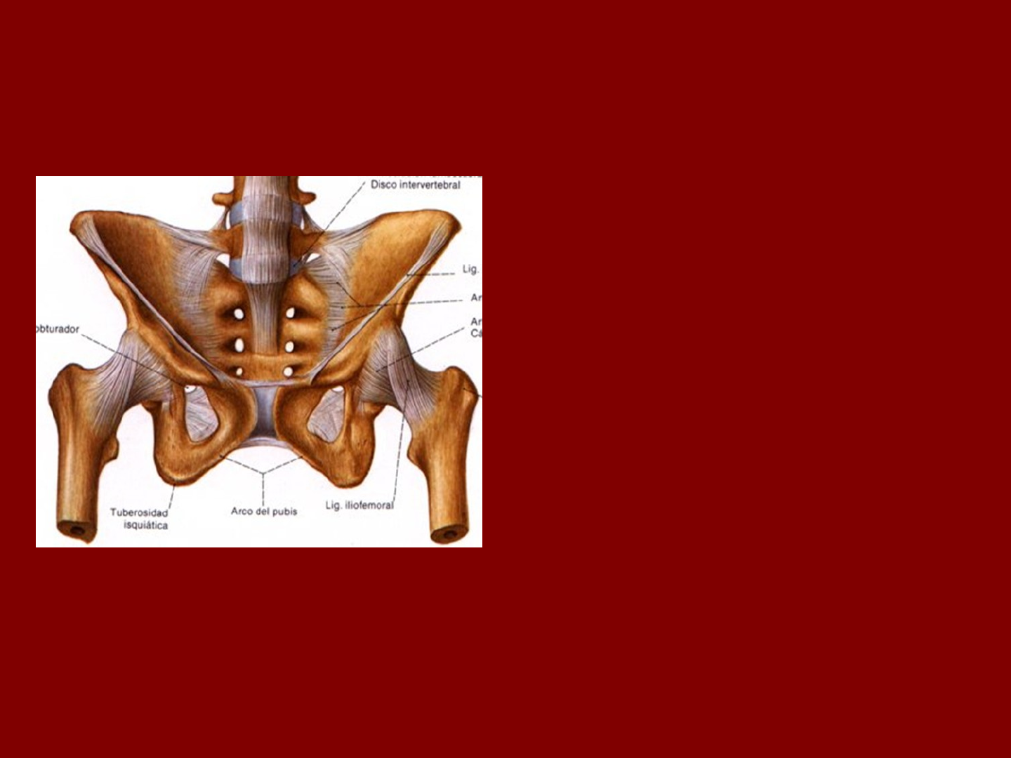 APARATO LOCOMOTOR MIEMBRO INFERIOR PELVIS REGION GLUTEA MUSLO RODILLA - PIERNA GARGANTA DEL PIE PIE CINTURA PELVIANA Formada por : los coxales y el sacro COXAL: -ILION -PUBIS ISQUION COXAL -ILION -PUBIS ISQUION 2 caras 4 lados 4 angulos FOSA O CARA GLÚTEA [Fosa Ilíaca Externa] - O Línea glútea inferior. 4 Glúteo Menor - P Línea glútea anterior [L. semicircular anterior] 6 Glúteo Medio - Q Línea glútea posterior [L. semicircular posterior] 9 Glúteo Mayor Externa FOSA O CARA GLÚTEA [Fosa Ilíaca Externa] - O Línea glútea inferior. 4 Glúteo Menor - P Línea glútea anterior [L. semicircular anterior] 6 Glúteo Medio - Q Línea glútea posterior [L. semicircular posterior] 9 Glúteo Mayor - Da Borde o Limbo Acetabular [ceja cotiloidea] - Db Carilla Semilunar [porción articular] - Dc Fosa Acetabular [Trasfondo de la cavidad cotiloidea] - Dd Escotadura Acetabular [isquiopubiana] - De Surco supraacetabular [canal supracotiloideo] 1 Cabeza refleja del Recto femoral [tendón reflejo del Recto Anterior D- ACETÁBULO [Cavidad Cotiloidea E- AGUJERO OBTURADOR Ea Surco Obturador [canal subpubiano] - Eb Tubérculo Obturador [isquiopubiano] Posterior - Ec Tubérculo Obturador [isquiopubiano] Anterior - Ed Rama [ascendente] del Isquion. 16 Obturador Externo 17 Aductor mayor - Ee Cuerpo [rama descendente] del Isquion - Ef Rama inferior [descendente] del Pubis 17 Aductor mayor 18 Grácil [Recto Int.] 19 Aductor Corto [Menor] 20 Aductor Largo [medio] - Eg Rama superior [horizontal] del Pubis 21 Pectíneo 22 Recto del Abdomen - Eh [Lámina cuadrilátera del pubis] FEMUR EPIFISIS PROXIMAL Cabeza del femur Fosita del ligamento redondo Trocanter mayor y menor Cuello del femur Lineas intertrocantereas Fosita digital DIAFISIS Línea áspera ARTICULACION SACROILIACA ANFIARTROSIS Ligamentos: 1- Lig.sacroilíaco anterior 2- Lig. Sacroilíaco posterior a-lig.innominado b-lig.vago o axil c-lig. De Zaglas d-lig. sacroespinoso 3- Lig. Iliolumbar o iliotransverso LIGAMENTOS SACROCIATICOS -Sacrociático mayor - Sacrociático menor Lig. sacrociatico mayor Inserción superior: a) espinas ilíacas posteriores b) inferior a la articulación sacroilíaca, en el borde lateral del sacro y en la mitad superior del cóccix Inferior: borde medial de la tuberosidad isquiática Lig. Sacrociatico menor Borde lateral de las dos últimas vértebras sacras y de las tres primeras vértebras coccígeas. las fibras se insertan en el vértice de la espina ciática FORAMEN CIATICO MAYOR • Por encima del M. Piriforme: pasan: vasos glúteos superiores y nervio glúteo superior • Por debajo del M. Piriforme: o Agujero infrapiriforme pasan: vasos glúteos inferiores, arteria y vena pudenda interna y los nervios: glúteo inferior, pudendo, ciático, femorocutáneo posterior, obturador interno y cuadrado femoral Por el foramen pasan: • Tendón del obturador interno • Vasos pudendos internos • Nervio pudendo • Nervio del músculo obturador interno FORAMEN CIATICO MENOR PELVIS EN GENERAL Estrecho superior o PELVIS MAYOR Estrecho inferior o PELVIS MENOR DIAMETROS ANTEROPOSTERIORES 1-promontosuprapúbico 11 cm 2-promontoretropúbico 10,5 cm 3- promontosubpúbico 12 cm. DIAMETROS OBLICUOS 1- Derecho: 12 cm. 2- Izquierdo: 12,5 cm. DIAMETROS TRANSVERSOS: 1- anatómico : 13 cm. 2- Obstétrico : 12,5 cm. PELVIS EN GENERAL Estrecho inferior o PELVIS MENOR DIAMETROS: 1- Anteropost. o misacrosubpubis 11,5 cm. 2-Transverso Biciático 10,5 cm. 3- “ Biisquiático 12 cm. PELVIMETRIA EXTERNA DIAMETROS: -de Boudelooque: 20 cm. ( ap.esp.5 L al p.) -Biespinoso anterior: 26-28 cm. -Bitrocantereo 32 cm. ARTICULACION COXOFEMORAL ARTICULACION DE LA CADERA Enartrosis, simple y pluriaxial 1- CABEZA DEL FEMUR c/ lig.redondo 2- CAVIDAD COTILOIDEA ( fascia Lunata transfonfo cotiloideo ) LIGAMENTO REDONDO Intraart.-extrasinovial ARTICULACION COXOFEMORAL 1- CAPSULA ARTICULAR 2- LIGAMENTOS: a- ILIOFEMORAL o en Y de Bertin EIAI ….…línea oblicua anterior 2 fascículos: - sup. o Ileopretrocantereo - inf. o Iliopretrocantineo b- PUBOFEMORAL Cresta pectínea ------ trocanter menor Forma el lig. En N de Welcker C- ISQUIOFEMORAL VISTA ANTERIOR VISTA POSTERIOR Los ligamentos que refuerzan la cápsula articular son los ligamentos Iliofemoral Pubofemoral isquiofemoral. Ligamento redondo Ligamento iliofemoral [de Bertin] Espina ilíaca anteroinferior hasta la línea intertrocantérica. Porción transversa [iliopretrocantérica] Porción descendente [iliopretrocantínea] Vertical y más delgada, que termina en la línea intertrocantérica, por delante del trocánter menor Ligamento pubofemoral: refuerza por delante la cápsula articular: la cresta pectínea porción proximal del trocánter menor del fémur. Ligamento isquiofemoral: refuerza la cara posterior de la articulación. porción posterior del labrum acetabular borde anterior de la fosa digital. Sinovial Recubre: cara interna de la cápsula hasta sus inserciones. .- Se refleja: borde libre del rodete acetabular, contacto con el hueso, al que recubre hasta el cartílago articular de la cabeza del fémur. La sinovial del ligamento de la cabeza del fémur se inserta en la fosita de la cabeza del fémur y en el contorno de la fosa acetabular del hueso coxal, de modo que el ligamento queda en posición intraarticular y extrasinovial. MECÁNICA Y MOVIMIENTOS DE LA ARTICULACIÓN DE LA CADERA. Las superficies articulares se mantienen en contacto gracias a la cápsula articular Los ligamentos Los músculos periarticulares y Presión atmosférica Todos estos movimientos se reducen a cuatro tipos principales: a) flexión y extensión, b) abducción y aducción, c) circunducción y d) rotación. Vascularización de la articulación de la cadera REGION GLUTEA LIMITES: A- en profundidad B- superficial FORMA EXTERIOR PUNTOS DE REPARO CONSTITUCION ANATOMICA: - Plano superficial piel y t.c.s Ap. Glutea superficial Plano muscular superficial Capa de tejido celular (vasos y nervios) Plano muscular profundo Plano osteo