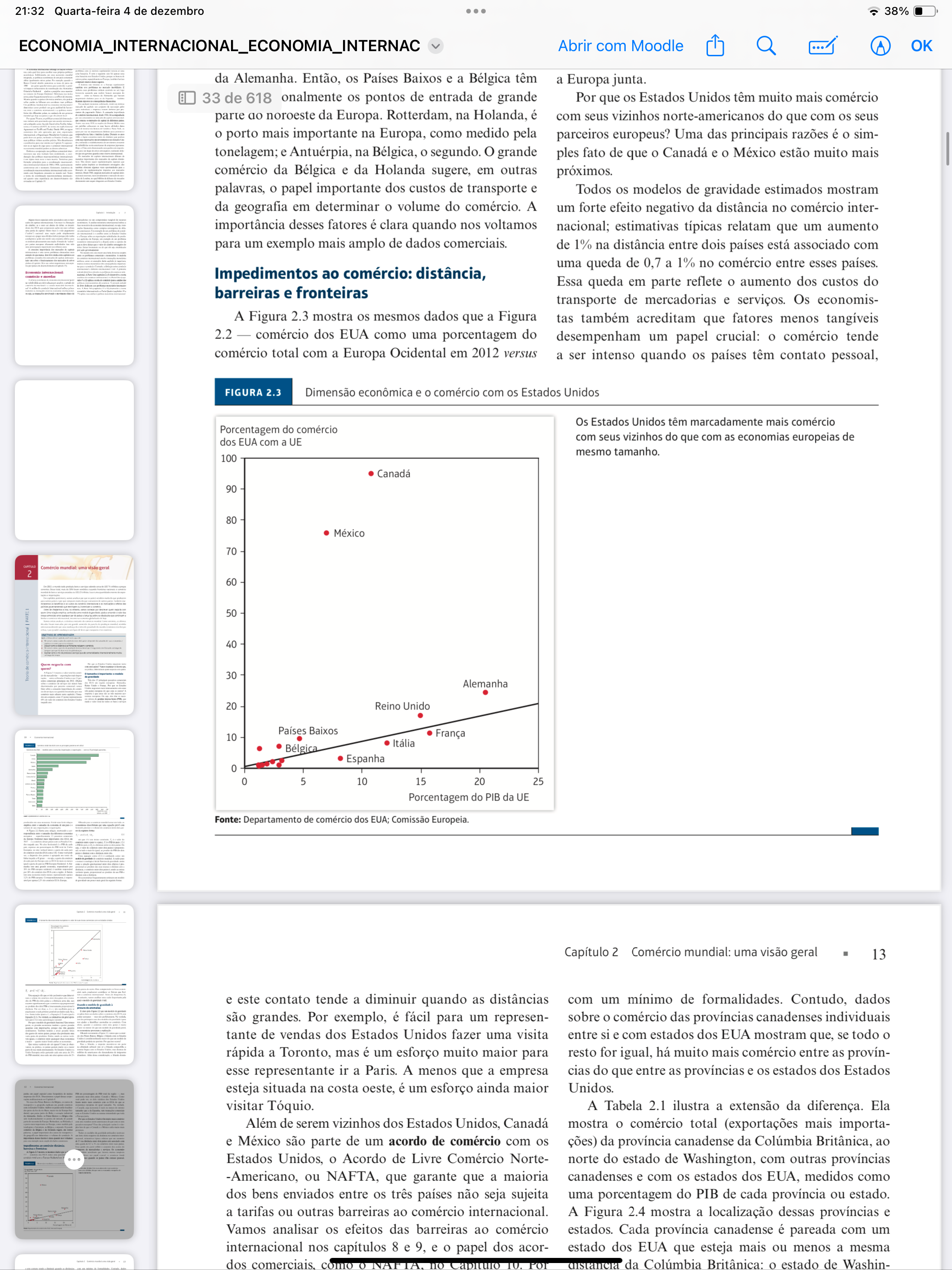 21:32 Quarta-feira 4 de dezembro 38% Abrir com Moodle OK da Alemanha. Então, os Países Baixos e a Bélgica têm a Europa junta. 33 de 618 onalmente os pontos de entrada de grande Por que os Estados Unidos têm muito mais comércio parte ao noroeste da Europa. Rotterdam, na Holanda, é com seus vizinhos norte-americanos do que com os seus o porto mais importante na Europa, como medido pela parceiros europeus? Uma das principais razões é o sim- tonelagem; e Antuérpia, na Bélgica, o segundo. grande ples fato de que o Canadá e o México estão muito mais comércio da Bélgica e da Holanda sugere, em outras próximos. palavras, o papel importante dos custos de transporte e Todos os modelos de gravidade estimados mostram da geografia em determinar o volume do comércio. A um forte efeito negativo da distância no comércio inter- importância desses fatores é clara quando nos voltamos nacional; estimativas típicas relatam que um aumento para um exemplo mais amplo de dados comerciais. de 1% na distância entre dois países está associado com uma queda de 0,7 a 1% no comércio entre esses países. Impedimentos ao comércio: distância, Essa queda em parte reflete o aumento dos custos do barreiras e fronteiras transporte de mercadorias e serviços. Os economis- A Figura 2.3 mostra os mesmos dados que a Figura tas também acreditam que fatores menos tangíveis 2.2 comércio dos EUA como uma porcentagem do desempenham um papel crucial: o comércio tende comércio total com a Europa Ocidental em 2012 versus a ser intenso quando os países têm contato pessoal, FIGURA 2.3 Dimensão econômica e o comércio com os Estados Unidos Os Estados Unidos têm marcadamente mais comércio Porcentagem do comércio dos EUA com a UE com seus vizinhos do que com as economias europeias de mesmo tamanho. 100 Canadá 90 80 México 70 2 60 50 40 30 Alemanha 20 Reino Unido Países Baixos 10 França Itália Bélgica Espanha 0 0 5 10 15 20 25 Porcentagem do PIB da UE Fonte: Departamento de comércio dos EUA; Comissão Europeia. Capítulo 2 Comércio mundial: uma visão geral 13 e este contato tende a diminuir quando as distâncias com um mínimo de formalidades. Contudo, dados são grandes. Por exemplo, é fácil para um represen- sobre o comércio das províncias canadenses individuais tante de vendas dos Estados Unidos fazer uma visita entre si e com estados dos EUA mostram que, se todo o rápida a Toronto, mas é um esforço muito maior para resto for igual, há muito mais comércio entre as provín- esse representante ir a Paris. A menos que a empresa cias do que entre as províncias e os estados dos Estados esteja situada na costa oeste, é um esforço ainda maior Unidos. visitar Tóquio. A Tabela 2.1 ilustra a extensão da diferença. Ela Além de serem vizinhos dos Estados Unidos, Canadá mostra o comércio total (exportações mais importa- e México são parte de um acordo de comércio com os ções) da província canadense da Colúmbia Britânica, ao Estados Unidos, o Acordo de Livre Comércio Norte- norte do estado de Washington, com outras províncias ou NAFTA, que garante que a maioria canadenses e com os estados dos EUA, medidos como dos bens enviados entre os três países não seja sujeita uma porcentagem do PIB de cada província ou estado. a tarifas ou outras barreiras ao comércio internacional. A Figura 2.4 mostra a localização dessas províncias e Vamos analisar os efeitos das barreiras ao comércio estados. Cada província canadense é pareada com um internacional nos capítulos 8 e 9, e o papel dos acor- estado dos EUA que esteja mais ou menos a mesma dos comerciais, como no distancia da Colúmbia Britânica: o estado de Washin-