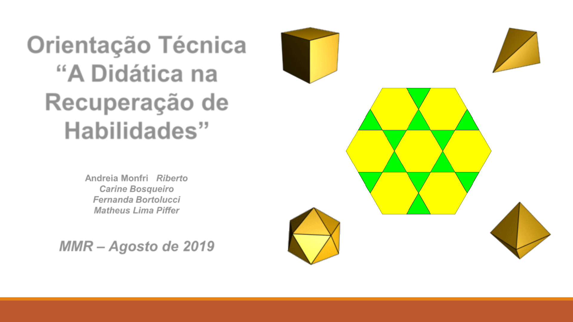 Orientação Técnica “A Didática na Recuperação de Habilidades” Andreia Monfrin Riberto Carine Bosqueiro Fernanda Bortolucci Matheus Lima Piffer MMR – Agosto de 2019 1 Didática Geral da Matemática “A Didática da Matemática estuda o processo de transmissão e aquisição de diferentes conteúdos desta ciência, particularmente na situação escolar e universitária. Propõe-se a descrever e explicar os fenômenos relativos às relações entre seu ensino e aprendizagem. Não se reduz somente a buscar uma boa maneira de ensinar uma noção fixa, mesmo quando espera, ao finalizar, ser capaz de oferecer resultados que lhe permitam melhorar o funcionamento do ensino”. (PARRA, Cecília; SAIZ, Irma;(Organizadoras). Didática da Matemática - Reflexões Psicopedagógicas. Artmed,1996, p.4) 2 Didática Geral da Matemática “Como regra geral, pode-se recomendar que sempre é preferível saber pouco e bem, que muito e mal...os conceitos fundamentais devem repetir-se a partir de diferentes enfoques, indicando o caminho para suas possíveis extensões e aplicações que o aluno terá que buscar no futuro por conta própria, quando as necessitar. Já que a aprendizagem vai ser permanente, visto que o campo do conhecimento não se detém, é importante ensinar e aprender, coisa que o aluno terá que fazer por si só quando concluir seu ensino na escola, e se liberar do professor.” (SANTELÓ. Luis . 1996, p.16) 3 Didática Geral da Matemática “No que diz respeito à didática, seja no nível que for, o ensino da Matemática deve estimular a criatividade, mostrando que a Matemática é como um edifício em construção, sempre necessitando de modificações e adaptações.” (SANTELÓ. Luis,1996, p. 19) 4 Didática Geral da Matemática Construindo sentido... “A questão essencial do ensino da matemática é então: como fazer para que os conhecimentos ensinados tenham sentido para o aluno ?” (CHARNAY, Roland,1996, p. 38) 5 Didática Geral da Matemática “Para definir qual tipo de intervenção é mais indicada para cada caso, é importante identificar se a dificuldade está relacionada a um conteúdo específico, a uma habilidade ou mesmo a um conteúdo fundante que não foi aprendido de maneira adequada”. (Par, Plataforma Educacional;2019, p. 08) 6 Utilizando a Plataforma Foco Aprendizagem Mapa de Habilidades do Saresp 2018 7 8 9 10 11 12 Foco Aprendizagem 3º série do Ensino Médio 13 Investigação Matemática para Intervenção na recuperação Habilidade em Defasagem 3º série EM Tema 02 - Espaço e Forma H18 – Aplicar as propriedades fundamentais dos polígonos regulares em problemas de pavimentação de superfícies 14 Sequência de Atividade Itens que compõem o desenvolvimento da Sequência de atividade : ➔ Área: Geometria / Trigonometria. ➔ Ano/Série: 3º série EM. ➔ Tema: Tema 02 - Espaço e Forma. ➔ Título da Atividade: Pavimentação de Superfícies ➔ Habilidade a ser Desenvolvida: H18 – Aplicar as propriedades fundamentais dos polígonos regulares em problemas de pavimentação de superficies. ➔ Objetos de Aprendizagem: Com a retomada das habilidades previstas em anos anteriores, propor atividades para compor a gama de conhecimentos necessários atingindo assim o nível de complexidade da habilidade em defasagem. ➔ Questão Disparadora: Quais polígonos regulares poderiam ser utilizados para ladrilhar uma superfície sem recortes e sem sobreposição ? 15 16 AAP 23º edição – 2019 7º ano - Ensino Fundamental 17 Retomada sobre as principais características dos polígonos utilizados como: Figura Nome do polígono Número de lados Número de triângulos a partir de um mesmo vértice Soma dos ângulos internos A Quadrilátero 4 2 2 . 180⁰ = 360⁰ B Pentágono 5 3 3 . 180⁰ = 540⁰ C Hexágono 6 4 4 . 180⁰ = 720⁰ D Heptágono 7 5 5 . 180⁰ = 900⁰ E Octógono 8 6 6 . 180⁰ = 1080⁰ 18 Polígonos regulares : Polígono regular Medida de cada ângulo interno Medida de cada ângulo externo Triângulo equilátero 180⁰ : 3 = 60⁰ 180⁰ - 60⁰ = 120⁰ Quadrado 360⁰ : 4 = 90⁰ 180⁰ - 90⁰ = 90⁰ Pentágono regular 540⁰ : 5 = 108⁰ 180⁰ - 108⁰ = 72⁰ Hexágono regular 720⁰ : 6 = 120⁰ 180⁰ - 120⁰ = 60⁰ Heptágono regular 900⁰ : 7 ~ 128,6⁰ ~ 180⁰ - 128,6⁰ ~ 51,4⁰ Octógono regular 1080⁰ : 8 = 135⁰ 180⁰ - 135⁰ = 45⁰ 19 Polígonos regulares : ➔ Após retomada com os alunos... ➔ Mão na Massa (atividades): Trabalhar com a construção de mosaico. ➔ Materiais necessários para a aula: Papel quadriculado, régua, lápis de cor. ➔ Encaminhamentos: Professor proponha que na folha de papel quadriculado seja feito um mosaico cobrindo todo o plano, utilizando apenas um polígono regular, sem que sejam feitas sobreposições ou recortes. ➔ Avaliação: Com essa atividade proposta, poderá constatar se aluno assimilou que ao trabalhar com os polígonos regulares, somente três deles cumprem os pré-requisitos estabelecidos no encaminhamento do professor 20 Exercícios: Fonte Saresp 2008 e 2009 sobre Polígonos regulares 21 Polígonos regulares : O retângulo ABCD da figura abaixo foi obtido a partir de um mosaico de hexágonos regulares, de modo que os pontos A, B, C e D correspondem aos centros dos hexágonos em cujo interior se encontram. Assim, admitindo que o retângulo seja pavimentado com partes de hexágonos recortados, sem perdas, o menor número de hexágonos que possibilita essa pavimentação é: (A) 4 (B) 6 (C) 8 (D) 10 22 Polígonos regulares : 23 Polígonos regulares : 24 OBRIGADA ! 25 Referências: PARRA, Cecília, SAIZ, Irma, Didática da Matemática: reflexões psicopedagógicas. Artmed, Porto Alegre, 1996. Matemática em toda parte / Construção - Pavimentação com polígonos, disponível em: https://www.youtube.com/watch?v=y__0a7TDbfs - Acesso em: 27/06/2019 São Paulo (Estado),Secretaria da Educação, Matriz de Referência para a Avaliação do SARESP, Matemá