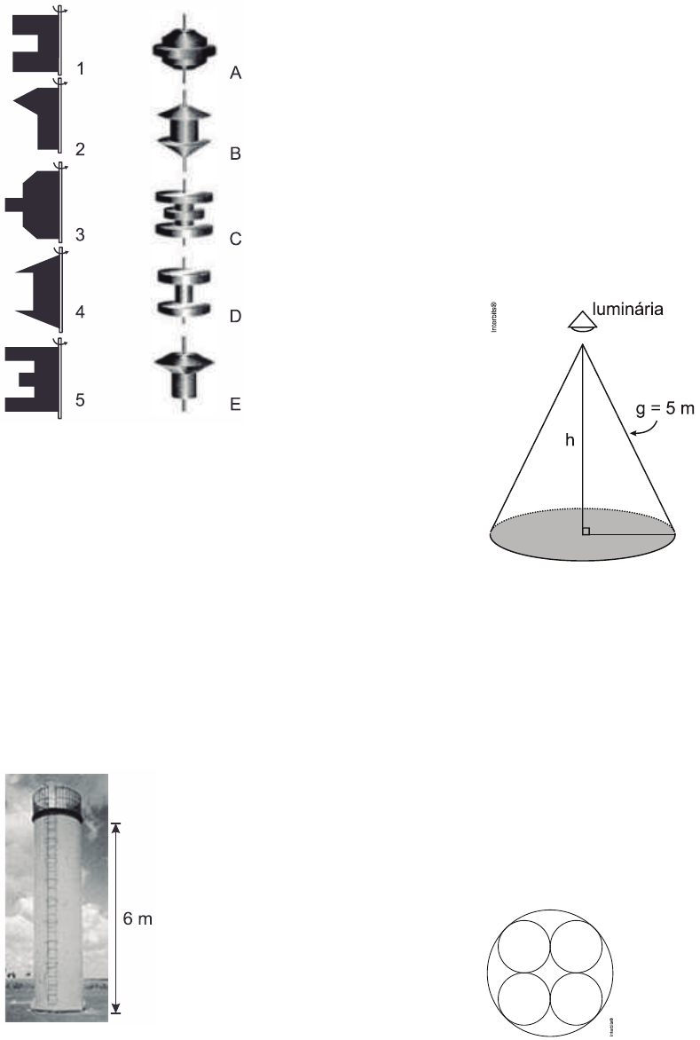 Alisson Marques - online 1 1. (Enem 1999) Assim como na relação entre o perfil de um corte de um torno e a peça torneada, sólidos de revolução resultam da rotação de figuras planas em torno de um eixo. Girando-se as figuras a seguir em torno da haste indicada obtém-se os sólidos de revolução que estão na coluna da direita. A correspondência correta entre as figuras planas e os sólidos de revolução obtidos é: a) 1A, 2B, 3C, 4D, 5E. b) 1B, 2C, 3D, 4E, 5A. c) 1B, 2D, 3E, 4A, 5C. d) 1D, 2E, 3A, 4B, 5C. e) 1D, 2E, 3B, 4C, 5A. 2. (Enem 2008) A figura abaixo mostra um reservatório de água na forma de um cilindro circular reto, com 6 m de altura. Quando está completamente cheio, o reservatório é suficiente para abastecer, por um dia, 900 casas cujo consumo médio diário é de 500 litros de água. Suponha que, um certo dia, após uma campanha de conscientização do uso da água, os moradores das 900 casas abastecidas por esse reservatório tenham feito economia de 10% no consumo de água. Nessa situação, a) a quantidade de água economizada foi de 34,5 m . b) a altura do nível da água que sobrou no reservatório, no final do dia, foi igual a 60cm. c) a quantidade de água economizada seria suficiente para abastecer, no máximo, 90 casas cujo consumo diário fosse de 450 litros. d) os moradores dessas casas economizariam mais de R$ 200,00, se o custo de 31m de água para o consumidor fosse igual a R$ 2,50. e) um reservatório de mesma forma e altura, mas com raio da base 10% menor que o representado, teria água suficiente para abastecer todas as casas. 3. (Enem 2ª aplicação 2010) Um arquiteto está fazendo um projeto de iluminação de ambiente e necessita saber a altura que deverá instalar a luminária ilustrada na figura Sabendo-se que a luminária deverá iluminar uma área circular de 228,26m , considerando 3,14 , a altura h será igual a a) 3 m. b) 4 m. c) 5 m. d) 9 m. e) 16 m. 4. (Enem 2ª aplicação 2010) Uma fábrica de tubos acondiciona tubos cilíndricos menores dentro de outros tubos cilíndricos. A figura mostra uma situação em que quatro tubos cilíndricos estão acondicionados perfeitamente em um tubo com raio maior Alisson Marques - online 2 Suponha que você seja o operador da máquina que produzirá os tubos maiores em que serão colocados, sem ajustes ou folgas, quatro tubos cilíndricos internos. Se o raio da base de cada um dos cilindros menores for igual a 6 cm, a máquina por você operada deverá ser ajustada para produzir tubos maiores, com raio da base igual a a) 12 cm b) 12 2cm c) 24 2cm d) 6 1 2 cm e) 12 1 2 cm 5. (Enem 2ª aplicação 2010) O administrador de uma cidade, implantando uma política de reutilização de materiais descartados, aproveitou milhares de tambores cilíndricos dispensados por empresas da região e montou kits com seis tambores para o abastecimento de água em casas de famílias de baixa renda, conforme a figura seguinte. Além disso, cada família envolvida com o programa irá pagar somente R$ 2,50 por metro cúbico utilizado. Uma família que utilizar 12 vezes a capacidade total do kit em um mês pagará a quantia de (considere 3 ) a) R$ 86,40. b) R$ 21,60. c) R$ 8,64. d) R$ 7,20. e) R$ 1,80. 6. (Unemat 2010) Para projetar um reservatório cilíndrico de volume 81 m3, dispõe-se de uma área circular de 6 m de diâmetro. Considerando = 3,14, a altura deverá ser de: a) 6 m b) 9 m c) 12 m d) 81 m 6 e) 3 m 7. (Enem 2ª aplicação 2010) Uma empresa de refrigerantes, que funciona sem interrupções, produz um volume constante de 1 800 000 cm3 de líquido por dia. A máquina de encher garrafas apresentou um defeito durante 24 horas. O inspetor de produção percebeu que o líquido chegou apenas à altura de 12 cm dos 20 cm previstos em cada garrafa. A parte inferior da garrafa em que foi depositado o líquido tem forma cilíndrica com raio da base de 3 cm. Por questões de higiene, o líquido já engarrafado não será reutilizado. Utilizando 3 , no período em que a máquina apresentou defeito, aproximadamente quantas garrafas foram utilizadas? a) 555 b) 5555 c) 1333 d) 13333 e) 133333 8. (Enem 2011) A figura seguinte mostra um modelo de sombrinha muito usado em países orientais. Esta figura é uma representação de uma superfície de revolução chamada de a) pirâmide. b) semiesfera. c) cilindro. d) tronco de cone. e) cone. 9. (Unicamp 2011) Depois de encher de areia um molde cilíndrico, uma criança virou-o sobre uma superfície horizontal. Após a retirada do molde, a areia escorreu, formando um cone cuja base tinha raio igual ao dobro do raio da base do cilindro. A altura do cone formado pela areia era igual a a) 3 4 da altura do cilindro. b) 1 2 da altura do cilindro. c) 2 3 da altura do cilindro. d) 1 3 da altura do cilindro. Alisson Marques - online 3 10. (Cesgranrio 2011) Um sólido totalmente maciço é composto pela união de dois cilindros circulares retos de mesmo diâmetro. As densidades do cilindro menor e do cilindro maior valem, respectivamente, 38.900 kg m e 32.700 kg m . Considerando-se 3 , a massa desse sólido, em toneladas, vale a) 97,2 b) 114,5 c) 213,6 d) 310,8 e) 320,4 11. (Ufrgs 2011) Um tipo de descarga de água para vaso sanitário é formado por um cilindro com altura de 2 m e diâmetro interno de 8 cm. Então, dos valores abaixo, o mais próximo da capacidade do cilindro é a) 7L. b) 8L. c) 9L. d) 10L. e) 11L. 12. (G1 - ifal 2011) Arquimedes, para achar o volume de um objeto de forma irregular, mergulhou-o num tanque cilíndrico circular reto contendo água. O nível da água subiu 10 cm sem transbordar. Se o diâmetro do tanque é 20 cm, então o volume do objeto é: a) 1.000 b) 2.000 c) 3.000 d) 4.000 e) 5.000 13. (Uern 2012) A figura representa um sorvete de casquinha, no qual todo o volume interno está preenchido por sorvete e a parte externa apresenta um volume de meia bola de sorvete. Considerando que o cone tem 12 cm de altura e raio 6 cm, então o volume total de sorvete