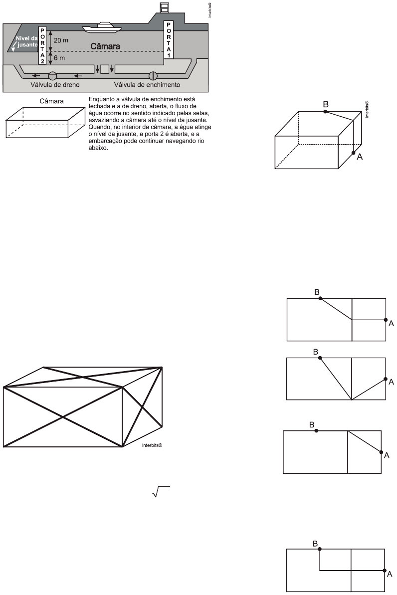Alisson Marques - online 1 1. (Enem 2006) Eclusa é um canal que, construído em águas de um rio com grande desnível, possibilita a navegabilidade, subida ou descida de embarcações. No esquema a seguir, está representada a descida de uma embarcação, pela eclusa do porto Primavera, do nível mais alto do rio Paraná até o nível da jusante. A câmara dessa eclusa tem comprimento aproximado de 200 m e largura igual a 17 m. A vazão aproximada da água durante o esvaziamento da câmara é de 34.200 m por minuto. Assim, para descer do nível mais alto até o nível da jusante, uma embarcação leva cerca de a) 2 minutos. b) 5 minutos. c) 11 minutos. d) 16 minutos. e) 21 minutos. 2. (Insper 2009) Para decorar uma caixa com a forma de paralelepípedo reto retângulo, uma pessoa colou algumas fitas sobre suas faces, como mostra a figura. Cada fita foi colada, sem folga, ligando dois vértices opostos de uma mesma face, e havia fitas com comprimentos iguais a 10 cm, 3 29 cm e 17 cm. Portanto, o volume da caixa, em cm3, é a) 360. b) 540. c) 600. d) 720. e) 840. 3. (Enem 2010) Uma fábrica produz barras de chocolates no formato de paralelepípedos e de cubos, com o mesmo volume. As arestas da barra de chocolate no formato de paralelepípedo medem 3 cm de largura, 18 cm de comprimento e 4 cm de espessura. Analisando as características das figuras geométricas descritas, a medida das arestas dos chocolates que têm o formato de cubo é igual a a) 5 cm. b) 6 cm. c) 12 cm. d) 24 cm. e) 25 cm. 4. (Enem 2ª aplicação 2010) A figura seguinte ilustra um salão de um clube onde estão destacados os pontos A e B. Nesse salão, o ponto em que chega o sinal da TV a cabo fica situado em A. A fim de instalar um telão para a transmissão dos jogos de futebol da Copa do Mundo, esse sinal deverá ser levado até o ponto B por meio de um cabeamento que seguirá na parte interna da parede e do teto. O menor comprimento que esse cabo deverá ter para ligar os pontos A e B poderá ser obtido por meio da seguinte representação no plano: a) b) c) d) Alisson Marques - online 2 e) 5. (Ufrgs 2011) Observe o sólido S formado por 6 cubos e representado na figura abaixo. Dentre as opções a seguir, o objeto que, convenientemente composto com o sólido S, forma um paralelepípedo é a) b) c) d) e) 6. (Ufrgs 2011) O paralelepípedo reto A, com dimensões de 8,5 cm, 2,5 cm e 4 cm, é a reprodução em escala 1:10 do paralelepípedo B. Então, o volume do paralelepípedo B, em , é a) 85. b) 850. c) 8.500. d) 85.000. e) 850.000. TEXTO PARA A PRÓXIMA QUESTÃO: Arquimedes,candidato a um dos cursos da Faculdade de Engenharia, visitou a PUCRS para colher informações. Uma das constatações que fez foi a de que existe grande proximidade entre Engenharia e Matemática. 7. (Pucrs 2012) A quantidade de materiais para executar uma obra é essencial para prever o custo da construção. Quer-se construir um telhado cujas dimensões e formato são indicados na figura abaixo. A quantidade de telhas de tamanho 15 cm por 20 cm necessárias para fazer esse telhado é a) 410 b) 510 c) 35.10 d) 45.10 e) 425.10 8. (Uftm 2012) Sem perda do volume original, um ourives pretende transformar um cubo de ouro de 1 cm3 em uma placa na forma de um paralelepípedo reto-retângulo. Adotando a medida da aresta do cubo como largura da placa e 50% da medida da aresta do cubo como altura da placa, a medida, em centímetros, do comprimento dessa placa resultará em a) 1,2. b) 1,5. c) 1,8. d) 2,0. e) 2,2. 9. (Enem 2012) Alguns objetos, durante a sua fabricação, necessitam passar por um processo de resfriamento. Para que isso ocorra, uma fábrica utiliza um tanque de resfriamento, como mostrado na figura. 3cm Alisson Marques - online 3 O que aconteceria com o nível da água se colocássemos no tanque um objeto cujo volume fosse de 2 400 cm3? a) O nível subiria 0,2 cm, fazendo a água ficar com 20,2 cm de altura. b) O nível subiria 1 cm, fazendo a água ficar com 21 cm de altura. c) O nível subiria 2 cm, fazendo a água ficar com 22 cm de altura. d) O nível subiria 8 cm, fazendo a água transbordar. e) O nível subiria 20 cm, fazendo a água transbordar. 10. (Uftm 2012) A figura 1 representa um prisma obtido após a secção do paralelepípedo reto- retângulo ADFCGJLI representado na figura 2. Sendo que AB = BC = DE = EF e 4HI = 4KL = JL = 2JG = 2AG = x, o volume do prisma representado na figura 1 é a) 35x . 32 b) 33x . 16 c) 33x . 5 d) 35x . 8 e) 33x . 4 11. (Ucs 2012) Uma caixa aberta é confeccionada a partir de um pedaço de cartolina em forma de um retângulo, do qual se retiraram pequenos quadrados nos vértices, conforme a figura abaixo. Conhecido o valor de x, a expressão que permite calcular o volume da caixa, levando em consideração os dados da figura, é a) 24x – 108x 720 x. b) 24x 720 x. c) 24x 720 x. d) 2x – 54x 720 x. e) 2x 54x 720 x. 12. (G1 - ifsp 2012) Fernando pretende abrir um aquário para visitação pública. Para tanto, pretende construí-lo com a forma de um bloco retangular com 3 m de comprimento, 1,5 m de largura e 2 m de altura. Assim sendo, o volume desse aquário será de a) 6,5 3m . b) 7,0 3m . c) 8,5 3m . d) 9,0 3m . e) 10 3m . 13. (Uern 2012) Uma livraria recebeu caixas cúbicas contendo duas pilhas de livros cada, que preenchem totalmente o espaço no seu interior. Se o total de caixas é igual a 45 e cada livro possui 12 cm de largura e 3 cm de espessura, então o total de livros recebidos é a) 540. b) 450. c) 810. d) 720. 14. (Uftm 2012) A altura, em centímetros, do nível da água armazenada em um reservatório com a forma de um prisma reto de base retangular é igual a x, conforme mostra a figura. Usando todo esse volume de água armazenado, pode-se encher completamente uma quantidade exata de recipientes com capacidade de 20 litros cada, ou uma quantidade exata de recipientes com capacidade de 50 litros cada. Se hx , 3 onde h é a altura do reservatório, então a menor capacidade, em litros,