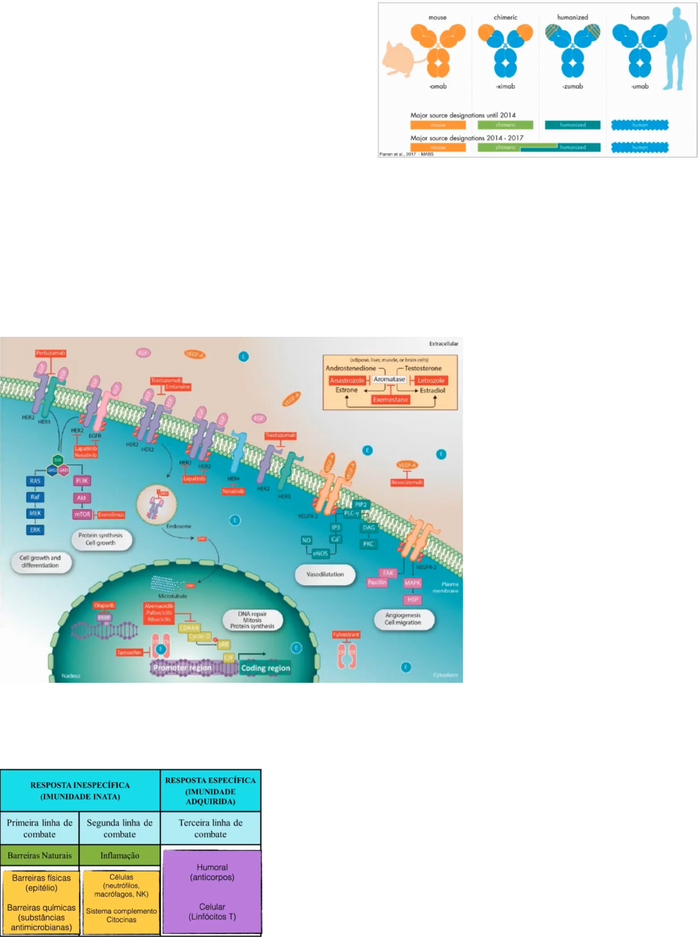 Então, os anticorpos começaram a ser utilizados em humanos para tratar, por exemplo, o câncer. Assim havia o anticorpo -omab (anticorpo de rato), e foi feito um anticorpo denominado de quimera (- ximab) com uma parte de reconhecimento proveniente do anticorpo de animal. Assim, a indústria farmacêutica conseguiu diminuir a porção não humana (o que era considerado estranho para o organismo humano), já que os anticorpos com parte animal eram destruídos pelo sistema imune, pois não eram reconhecidos, e isso causava efeitos colaterais. Assim, foi criado o humanizado (-zumab) que apresentava trechos de anticorpo animal na região de reconhecimento, isso contribuiu para menos efeitos colaterais e uma melhor resposta de tratamento, isto é, atacando a célula tumoral. Nos dias atuais, já existe os anticorpos humanos (-umab), tornando os efeitos colaterais menor ainda e um tratamento eficiente. A melhor construção desses anticorpos permitiu que houvesse um menor efeito HAHA (efeito contra o anticorpo anti-humanizado). Há receptores do tipo HER (HER 1, 2, 3 e 4 - estão relacionados com a proliferação celular) e VEGFR. Assim os medicamentos atuam na inibição desses receptores. Por exemplo, há o câncer de mama do tipo HER2 em que é bastante agressivo mas o medicamento age de forma específica com o receptor. Nesse caso, o trastuzumab inibe o HER2, isto é, a sua dimerização. Porém, esse medicamento pode ser utilizado juntamente com o emtansine, que apesar de já ter a estrutura dimerizada para sinalizar a cascata intracelular, o dímero será endocitado e essa estrutura torna-se importante pois irá liberar o emtansine no meio intracelular, o que irá inibir a formação de microtúbulos. Ou seja, haverá a inibição da duplicação celular pois haverá a inibição dos microtúbulos. Pele: uma barreira física que impede que qualquer organismo microscópico invada o corpo. Há também: microbiota natural, muco e cílios (trato digestório e respiratório). Há barreiras fisiológicas como a temperatura, pH, mediadores químicos. RECEPTORES DO SISTEMA IMUNE INATO As células da imunidade inata atual identificando e fagoctiando os antígenos ou ativando a resposta inflamatória. Essas células reconhecem os antígenos através da ligação de alguns de seus receptores com estruturas características de patógenos. Que estruturas são essas? Podem ser componente da parede celular, componente de membrana, algum carboidrato, ácidos nucleicos ou proteína que seja diferente do que nosso organismo está acostumado. Ou seja, pode ser qualquer coisa que não seja comum ao nosso corpo. O interessante é que essas estruturas geralmente são essenciais para a sobrevivência desse de patógenos. Ou seja, elas tem que estar presentes para que o microorganismo seja capaz de sobreviver. São chamadas de Padrões Moleculares Associados a Patógenos (PAMPs). Sendo os receptores que se ligam a essas estruturas denominados de Receptores de Reconhecimento de Padrões (RPR). Os PAMPs não sabem que molécula é aquela que chegou a seu receptor mas sabe que não é uma molécula padrão. Assim, o nosso sistema imune inato utiliza de padrões para reconhecer o que não é próprio, e que quando não é próprio haverá a ativação da cascata intracelular para que o nosso organismo consiga reconhecer aquele componente não próprio de forma específica, levando a uma imunidade adquirida. Ácidos nucléicos microbianos (DNA - CpG não metilados, dsRNA, ssRNA, etc.) • Lipoproteína • Glicoproteínas de superfície • Componentes de membrana (peptideoglicanos, ácido lipoteicóico - LTA, lipopolissacarídeos - • LPS, glicosilfosfatidilinositol) Os DAMPs são padrões moleculares associados ao dano e esse dano pode ser proveniente de trauma, isquemia, câncer, e outros tipos de danos teciduais na ausência de infecção por patógenos. Eles são expressos por células próprias que, por algum motivo, seja diferenciação maligna ou infecção, estão lesionadas, danificadas. HMGB1 (núcleo e citoplasma) • Proteínas S100 (citoplasma) • Proteínas de choque térmico (HSP) • Ácido hialurônico (matrix extracelular) • C3a, C4a e C5a (no plasma) • Espécies reativas de oxigênio (mtROS) - deve estar confinada dentro da célula, se houver a sua • liberação, as células dendríticas reconhecem que essas espécies não estão no local certo. —> DAMPs não-proteicos (ATP, ácido úrico, heparina sulfato, RNA, e DNA). PS: Peptídeos e DNA mitocondrial (que apresentam ilhas CpG) podem ser considerados mimetizadores de DAMPs. PS2: geralmente, os DAMPs ativam os NLRs. Os TLRs estão presentes tanto na membrana celular, virados para o lado de fora da célula, quanto em vesículas endossomais, virados para dentro deste compartimento membranar. Dessa forma, se um antígeno está no meio extracelular ou foi fagocitado e está em alguma vesícula endossomal, ele pode se ligar a um desses receptores. Eles detectam ácidos nucleicos microbianos e, após o reconhecimento, ativam alguns mecanismos intracelulares que culminam na secreção de citocinas e na expressão de moléculas de adesão. As citocinas vão ajudar a recrutar leucócitos para o local onde o microorganismo foi detectado e as moléculas de adesão vão garantir que os leucócitos que estejam passando por perto "grudem”" e sejam capturados para os tecidos infectados. O PAMP ou o patógeno acaba sendo reconhecido pelo receptor do tipo Toll e ativa uma resposta imunológica através da liberação de IL-12 (que é importante na maturação da célula T Naive) e há apresentação do antígeno fazendo com que haja a endocitose do patógeno e isso auxilia na apresentação do antígeno ao receptor da célula T. Os TCRs são os receptores de células T (presente na células T naive) para que, através da apresentação desse patógeno que é através do MHC-II, elas possam identificar a estrutura e ser maturada para que haja a forma
