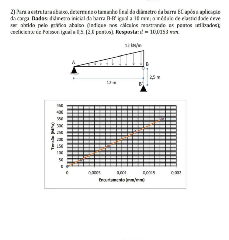 Para resolver este problema, precisamos inicialmente calcular a força que atua na barra BB’, para isso aplicamos o somatório dos momentos no ponto A: ∑ 𝑀𝐴 = 0 ↶+ 12𝐹𝐵𝐵′ − 12 ∗ 12 2 ∗ 8 = 0 12𝐹𝐵𝐵′ − 576 = 0 12𝐹𝐵𝐵′ = 576 𝐹𝐵𝐵′ = 48 𝑘𝑁 A variação do diâmetro da barra pode ser escrita da seguinte forma: ∆𝑑 = 𝑑𝜖𝑙𝑎𝑡 Portanto, precisamos determinar a deformação lateral. Como foi fornecido o coeficiente de Poisson, vamos escrever a seguinte relação: 𝜈 = 𝜖𝑙𝑎𝑡 𝜖𝑙𝑜𝑛𝑔 Isolando a deformação lateral: 𝜖𝑙𝑎𝑡 = 𝜈𝜖𝑙𝑜𝑛𝑔 Para determinar a deformação longitudinal podemos escrever a lei de Hooke: 𝜎 = 𝐸𝜖𝑙𝑜𝑛𝑔 𝜖𝑙𝑜𝑛𝑔 = 𝜎 𝐸 A tensão normal na barra é dada por: 𝜎 = 𝐹𝐵𝐵′ 𝐴 𝜎 = 𝐹𝐵𝐵′ 𝜋𝑑2 4 𝜎 = 4𝐹𝐵𝐵′ 𝜋𝑑2 Substituindo na equação para a deformação longitudinal: 𝜖𝑙𝑜𝑛𝑔 = 4𝐹𝐵𝐵′ 𝜋𝑑2 𝐸 𝜖𝑙𝑜𝑛𝑔 = 4𝐹𝐵𝐵′ 𝜋𝑑2𝐸 Substituindo agora a deformação longitudinal na equação para a deformação lateral: 𝜖𝑙𝑎𝑡 = 4𝜈𝐹𝐵𝐵′ 𝜋𝑑2𝐸 Desta forma, a variação do diâmetro da barra será: ∆𝑑 = 𝑑 4𝜈𝐹𝐵𝐵′ 𝜋𝑑2𝐸 ∆𝑑 = 4𝜈𝐹𝐵𝐵′ 𝜋𝑑𝐸 Do gráfico fornecido, temos que o módulo de elasticidade: 𝐸 = 𝜎 𝜖 𝐸 = 100 0,0005 𝐸 = 200 𝐺𝑃𝑎 Por fim, a variação do diâmetro: ∆𝑑 = 4 ∗ 0,5 ∗ 48 ∗ 103 𝜋 ∗ 0,001 ∗ 200 ∗ 109 ∆𝑑 = 1,53 ∗ 10−4 𝑚 ∆𝑑 = 0,0153 𝑚𝑚 Portanto, o novo diâmetro da barra será: 𝑑𝑛 = 𝑑 + ∆𝑑 𝑑𝑛 = 10 + 0,0153 𝑑𝑛 = 10,0153 𝑚𝑚 a) Para determinar as tensões em cada barra, precisamos inicialmente calcular as forças normais em cada uma das barras. O primeiro passo para calcular as forças nas barras da treliça é determinar as reações nos apoios, aplicando o somatório dos momentos em b: ∑ 𝑀𝐵 = 0 ↶+ 8𝑉𝐶 − 4 ∗ 8 10 ∗ 50 + 3 ∗ 6 10 ∗ 50 = 0 8𝑉𝑐 − 160 + 90 = 0 8𝑉𝑐 − 70 = 0 8𝑉𝑐 = 70 𝑉𝑐 = 8,75 𝑘𝑁 Aplicando o somatório das forças em y: ∑ 𝐹𝑦 = 0 ↑+ 𝑉𝐵 + 8,75 − 8 10 ∗ 50 = 0 𝑉𝐵 + 8,75 − 40 = 0 𝑉𝐵 − 31,25 = 0 𝑉𝐵 = 31,25 𝑘𝑁 Aplicando agora o somatório das forças em x: ∑ 𝐹𝑥 = 0 →+ 𝐻𝐵 − 6 10 ∗ 50 = 0 𝐻𝐵 − 30 = 0 𝐻𝐵 = 30 𝑘𝑁 Agora vamos aplicar a lei dos nós para determinar a força normal em cada barra: Nó B: Calculando o ângulo 𝜃: 𝜃 = 𝑡𝑔−1 ( 3 4 ) 𝜃 = 36,87° Das forças em y: 𝐹𝐵𝐴𝑆𝑒𝑛36,87 + 31,25 = 0 𝐹𝐵𝐴𝑠𝑒𝑛36,87 = −31,25 𝐹𝐵𝐴 = −52,08 𝑘𝑁 Das forças em x: 𝐹𝐵𝐶 − 52,08𝑐𝑜𝑠36,87 + 30 = 0 𝐹𝐵𝐶 − 11,67 = 0 𝐹𝐵𝐶 = 11,67 𝑘𝑁 Nó C: Das forças em y: 𝐹𝐶𝐴𝑠𝑒𝑛36,87 − 8,75 = 0 𝐹𝐶𝐴𝑠𝑒𝑛36,87 = 8,75 𝐹𝐶𝐴 = 14,58 𝑘𝑁 Agora que já temos as forças normais, podemos determinar as tensões. A tensão na barra BA: 𝜎𝐵𝐴 = 𝐹𝐵𝐴 𝐴 𝜎𝐵𝐴 = 52,08 𝜋 ∗ 52 4 𝜎𝐵𝐴 = 2,65 𝑘𝑁/𝑐𝑚2 A tensão na barra CA: 𝜎𝐶𝐴 = 𝐹𝐶𝐴 𝐴 𝜎𝐶𝐴 = 14,58 𝜋 ∗ 52 4 𝜎𝐶𝐴 = 0,74 𝑘𝑁/𝑐𝑚2 A tensão na barra BC: 𝜎𝐵𝐶 = 𝐹𝐵𝐶 𝐴 𝜎𝐵𝐶 = 11,67 𝜋 ∗ 52 4 𝜎𝐵𝐶 = 0,59 𝑘𝑁/𝑐𝑚2 b) Para determinar o diâmetro vamos utilizar o critério da resistência: 𝑠 = 𝜎𝑟𝑢𝑝 𝜎 𝑠 = 𝜎𝑟𝑢𝑝 𝐹 𝐴 𝑠 = 𝐴𝜎𝑟𝑢𝑝 𝐹 𝑠𝐹 𝜎𝑟𝑢𝑝 = 𝜋𝑑2 4 𝑑2 = 4𝑠𝐹 𝜋𝜎𝑟𝑢𝑝 𝑑 = √ 4𝑠𝐹 𝜋𝜎𝑟𝑢𝑝 Para a barra BA, temos que a mesma está sujeita a compressão, portanto: 𝑑𝐵𝐴 = √ 4 ∗ 1,5 ∗ 52,08 𝜋 ∗ 3,5 𝑑𝐵𝐴 = 5,33 𝑐𝑚 Para a barra CA, temos que a mesma também está sujeita a compressão: 𝑑𝐶𝐴 = √ 4 ∗ 1,5 ∗ 14,58 𝜋 ∗ 3,5 𝑑𝐶𝐴 = 2,82 𝑐𝑚 Para a barra BC, temos que a mesma está sujeita a tração: 𝑑𝐵𝐶 = √ 4 ∗ 1,5 ∗ 11,67 𝜋 ∗ 3 𝑑𝐵𝐶 = 2,73 𝑐𝑚 Portanto, o menor diâmetro aceitável será o da barra BA, isto acontece, pois a mesma está sujeita ao maior esforço. Se utilizar o diâmetro da barra BC por exemplo, a treliça não irá suportar a carga na barra BA e irá ocorrer falha do material. Desta forma a resposta final será: 𝑑 = 5,33 𝑐𝑚 Arredondando para múltiplos de 0,5 cm: 𝑑 = 5,5 𝑐𝑚 Como estamos apenas considerando o trecho “af”, a reação no apoio “a”: 𝑁𝑎 − 70 + 250 − 90 + 150 = 0 𝑁𝑎 + 240 = 0 𝑁𝑎 = −240 𝑘𝑁 Temos o seguinte diagrama de esforço normal: Agora vamos calcular as tensões em cada um dos trechos. A tensão no trecho ab: 𝜎𝑎𝑏 = 240 ∗ 103 𝜋 ∗ 0,062 4 𝜎𝑎𝑏 = 84,88 𝑀𝑃𝑎 A tensão no trecho bc: 𝜎𝑏𝑐 = 310 ∗ 103 𝜋 ∗ 0,062 4 𝜎𝑏𝑐 = 109,64 𝑀𝑃𝑎 A tensão no trecho cd: 𝜎𝑐𝑑 = 60 ∗ 103 𝜋 ∗ 0,062 4 𝜎𝑐𝑑 = 21,22 𝑀𝑃𝑎 Calculando a tensão no trecho de: 𝜎𝑑𝑒 = 150 ∗ 103 𝜋 ∗ 0,032 4 𝜎𝑑𝑒 = 212,21 𝑀𝑃𝑎 Portanto, a máxima tensão é: 𝜎𝑑𝑒 = 212,21 𝑀𝑃𝑎 b) Para determinar a força P que não altere a reação no apoio “i”, temos: 𝛿𝑎𝑖 = 𝑁𝑎𝑏𝐿𝑎𝑏 𝐴𝑎𝑑𝐸𝑎𝑑 + 𝑁𝑏𝑐𝐿𝑏𝑐 𝐴𝑎𝑑𝐸𝑎𝑑 + 𝑁𝑐𝑑𝐿𝑐𝑑 𝐴𝑎𝑑𝐸𝑎𝑑 + 𝑁𝑑𝑒𝐿𝑑𝑒 𝐴𝑑𝑓𝐸𝑑𝑓 + 𝑃𝐿𝑒𝑓 𝐴𝑑𝑓𝐸𝑑𝑓 + 𝛿𝑓𝑔 + 𝑁𝑔ℎ𝐿𝑔ℎ 𝐴𝑔𝑖𝐸𝑔𝑖 + 𝑁ℎ𝑖𝐿ℎ𝑖 𝐴𝑔𝑖𝐸𝑔𝑖 O deslocamento das extremidades será nulo, pois o apoio é um engaste. Isolando o P: 𝑁𝑎𝑏𝐿