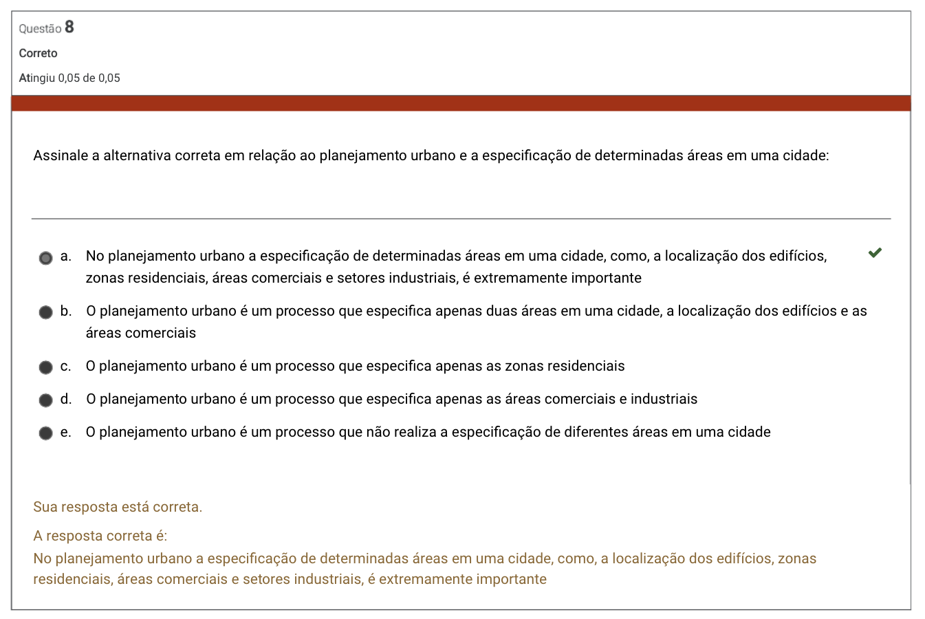 Questão 8 Correto Atingiu 0,05 de 0,05 Assinale a alternativa correta em relação ao planejamento urbano e a especificação de determinadas áreas em uma cidade: a. No planejamento urbano a especificação de determinadas áreas em uma cidade, como, a localização dos edifícios, zonas residenciais, áreas comerciais e setores industriais, é extremamente importante b. o planejamento urbano é um processo que especifica apenas duas áreas em uma cidade, a localização dos edifícios e as áreas comerciais C. o planejamento urbano é um processo que especifica apenas as zonas residenciais d. o planejamento urbano é um processo que especifica apenas as áreas comerciais e industriais e. o planejamento urbano é um processo que não realiza a especificação de diferentes áreas em uma cidade Sua resposta está correta. A resposta correta é: No planejamento urbano a especificação de determinadas áreas em uma cidade, como, a localização dos edifícios, zonas residenciais, áreas comerciais e setores industriais, é extremamente importante