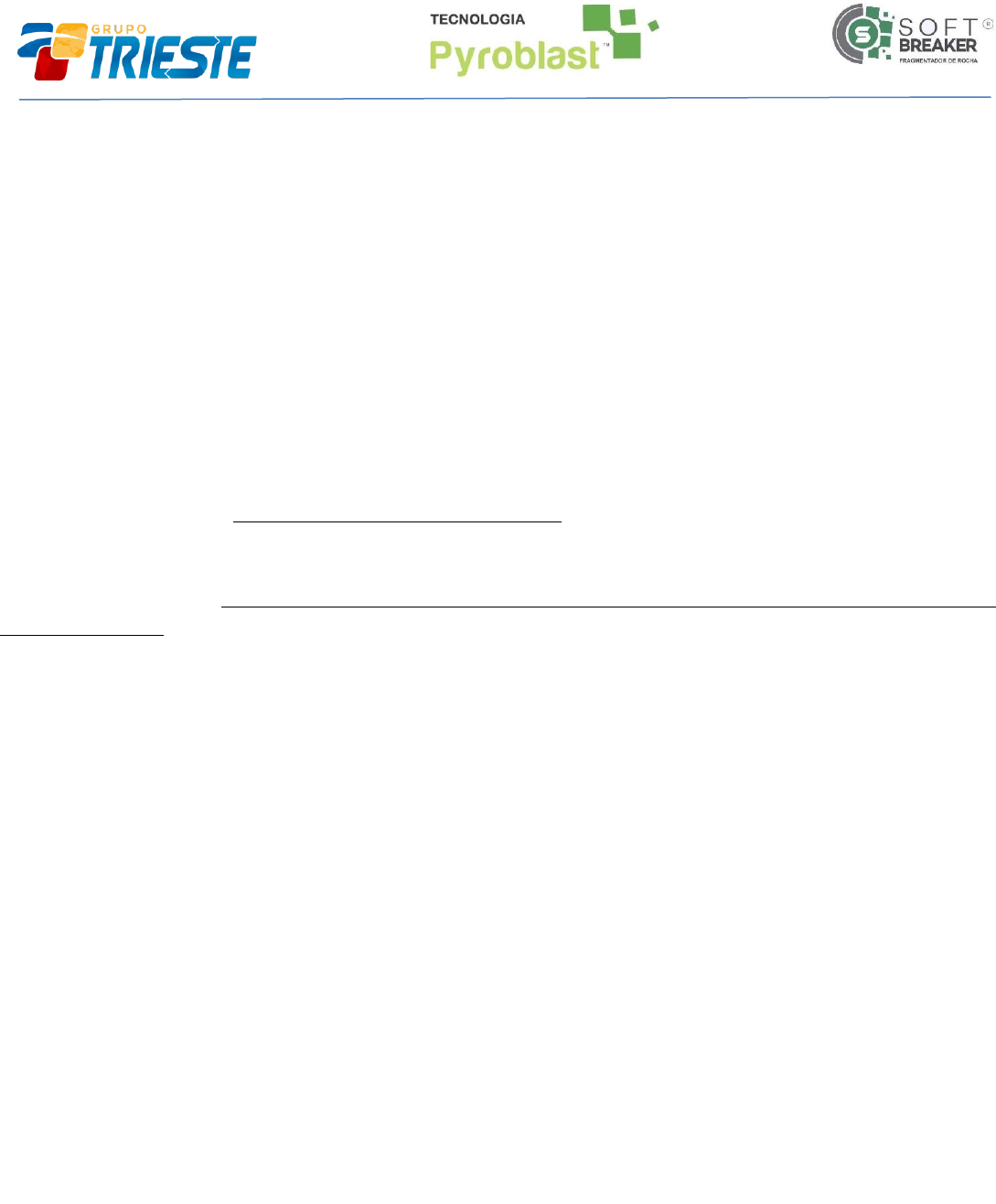 FICHA INFORMATIVA TECNOLOGIA PYROBLAST™ - CÁPSULA SOFBREAKER® Versão: 006 Data: 09/05/2022 1 1. DESCRIÇÃO A tecnologia Pyroblast consiste de cápsulas cilíndricas geradoras de gases comumente utilizadas na fragmentação de rocha. A principal forma de fragmentação ocorre através da rápida expansão de gases que eleva subitamente a pressão nos furos vencendo a resistência dinâmica à compressão da rocha. As cápsulas possuem velocidade de detonação (397m/s) abaixo dos explosivos convencionais, dessa forma, são capazes de executar desmontes controlados em áreas de risco. A presente tecnologia não é classificada como explosivo e trata-se de um artifício pirotécnico conforme os Relatórios Técnicos Experimentas (RETEXs) realizados pelo Centro de Avaliações do Exército (CAEx) na época de homologação do produto. Esses relatórios são citados no nosso Título de Registro nº SIGMA 67017. Além disso, conforme a COLOG 118, DE 4 DE OUTUBRO DE 2019, o produto está listado como Tipo 6, Grupo 6, Nº Ordem 6.2.0010, Nomenclatura do Produto: artificio pirotécnico. Cabe salientar que o DECRETO Nº 10.030, DE 30 DE SETEMBRO DE 2021, alterado pelo DECRETO 10.627 DE 12 DE FEVEREIRO DE 2021 é quem discorre sobre a isenção de Certificado de Registro e autorização para a prestação de serviço quando se utiliza produtos pirotécnicos. O artigo 7º diz o seguinte: Art. 7º É obrigatório o registro de pessoas físicas ou jurídicas junto ao Comando do Exército para o exercício, próprio ou terceirizado, das atividades com PCE, previstas no art. 6º, as quais estarão sujeitas ao seu controle e fiscalização. § 1º Fica dispensado o registro: I - dos agentes públicos que utilizam PCE no exercício da função; II - das pessoas que utilizam PCE eventualmente, conforme regulamentação do Comando do Exército; III - das pessoas físicas que utilizam PCE do tipo arma de pressão ou pirotécnico; IV - das pessoas que utilizam PCE como fertilizantes ou seus insumos; V - dos proprietários de veículos automotores blindados; e VI - das pessoas jurídicas que exercem atividades de comércio, utilização ou prestação de serviços com PCE do tipo pirotécnico. VII - das pessoas físicas que utilizam PCE do tipo arma de fogo e munição para a prática de tiro recreativo não desportivo nas instalações de entidades, clubes ou escolas de tiro, sem habitualidade e finalidade desportiva, quando acompanhadas de instrutor de tiro, instrutor de tiro desportivo ou atirador desportivo registrados junto ao Comando do Exército, e a responsabilidade pela prevenção de acidentes ou incidentes recairá sobre as referidas entidades, clubes ou escolas de tiro e seus instrutores. 2. NOMES COMERCIAIS Tecnologia PYROBLAST™ Cápsula SOFTBREAKER® http://legislacao.planalto.gov.br/legisla/legislacao.nsf/Viw_Identificacao/DEC%2010.030-2019?OpenDocument FICHA INFORMATIVA TECNOLOGIA PYROBLAST™ - CÁPSULA SOFBREAKER® Versão: 006 Data: 09/05/2022 2 3. NOME TÉCNICO DGGI-FR – Dispositivo Gerador de Gases Instantâneo Fragmentador de Rochas 4. CLASSIFICAÇÃO DO PRODUTO Artifício Pirotécnico 5. HOMOLOGAÇÃO DO PRODUTO Classe de Risco: 1.4S Número da ONU: 0432 Conforme Portaria COLOG nº 118 de 4 Outubro 19 (Lista de Produtos Controlados pelo Exército): Tipo 6, Grupo 6, Nº Ordem 6.2.0010, Nomenclatura do Produto: artificio pirotécnico 6. MODELOS Modelo da Cápsula Peso Diâmetro da Cápsula Diâmetro da Furação Comprimento Unidade por caixa Pyro 25 25 g 32,15 mm 36/38/40 mm 6,50 cm 40 Mod I 60g 13,50 cm 40 Mod II 100g 20,50 cm 40 Mod III 200g 29,50 cm 20 Mod IV 300g 56,00 mm 64/76 mm 2,5"/3,0" 16,00 cm 20 Mod V 600g 31,50 cm 10 Mod VI 1000g 48,00 cm 10 7. FABRICAÇÃO TRIESTE TECNOLOGIA EM FRAGMENTAÇÃO E TRADING LTDA EPP CNPJ: 11.182.420/0001-52 Portadora do Título de Registro: TR 4T/736/MG/21 8. LEGISLAÇÃO QUANTO AO COMÉRCIO, UTILIZAÇÃO OU PRESTAÇÃO DE SERVIÇO COMÉRCIO E UTILIZAÇÃO DOS PCE (PRODUTOS CONTROLADOS PELO EXÉRCITO) - em conformidade com o Decreto 10.030 de 30 de Setembro de 2019 FICHA INFORMATIVA TECNOLOGIA PYROBLAST™ - CÁPSULA SOFBREAKER® Versão: 006 Data: 09/05/2022 3 Art.7º § 1º Fica dispensado o registro: VI – das pessoas jurídicas que exercem atividades de comércio, utilização ou prestação de serviços com PCE DO TIPO PIROTÉCNICO.” Fabricação Utilização Importação/ Exportação Desembaraço Alfandegário Tráfego Comércio Prestação de Serviços Sim Isenta Sim Sim Somente na saída da Fábrica, Porto e Aeroporto Isenta Isenta 9. TRANSPORTE O transporte das cápsulas deve se adequar aos seguintes preceitos: Os condutores responsáveis pelo transporte deverão possuir treinamento específico (MOPP). Os veículos destinados ao transporte das cápsulas Soft Breaker deverão possuir a cabine separada do compartimento de carga. Esses veículos também deverão possuir a carroceria coberta afim de evitar danos causados por intempéries. Os veículos devem portar a ficha de emergência do produto, equipamentos de proteção individual e equipamentos para atendimento a situações de emergência, inclusive extintores de incêndio. Rótulos de risco e painéis de segurança deverão ser afixados no veículo em que a quantidade bruta total de material seja superior a 1000 kg. Exemplo de veículos adequados: caminhões com baú, caminhonetes e utilitários. NUNCA transportar as cápsulas sem estarem acondicionadas em suas embalagens originais, sob pena de adequação ao item 3.4.2.6 Resolução nº 5232 de 14/12/2016 ANTT; Evitar o transporte de passageiros e, obedecer sempre, aos limites de velocidade de segurança e distâncias dos veículos que trafegam à frente. 10. ARMAZENAMENTO A atividade de armazenamento das cápsulas deve se adequar aos seguintes preceitos: 1. Tempo de armazenamento: 05 (cinco) anos. 2. Manter o armazenamento das cápsulas em suas caixas originais. 3. Manter sempre o controle de entrada e saída de pessoal